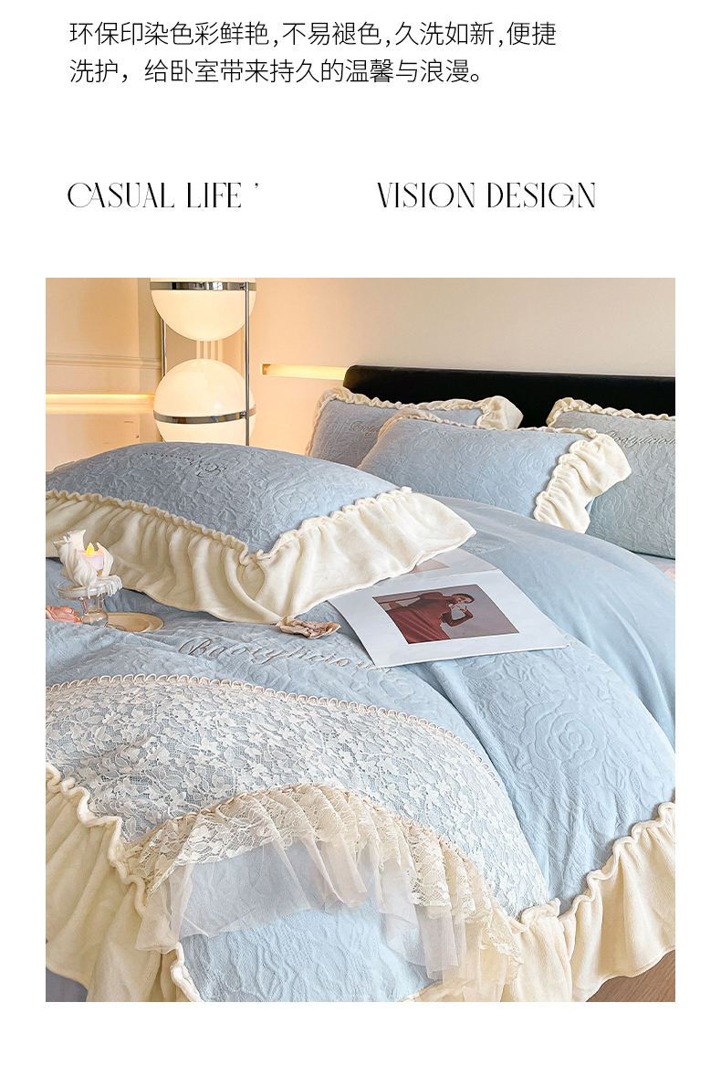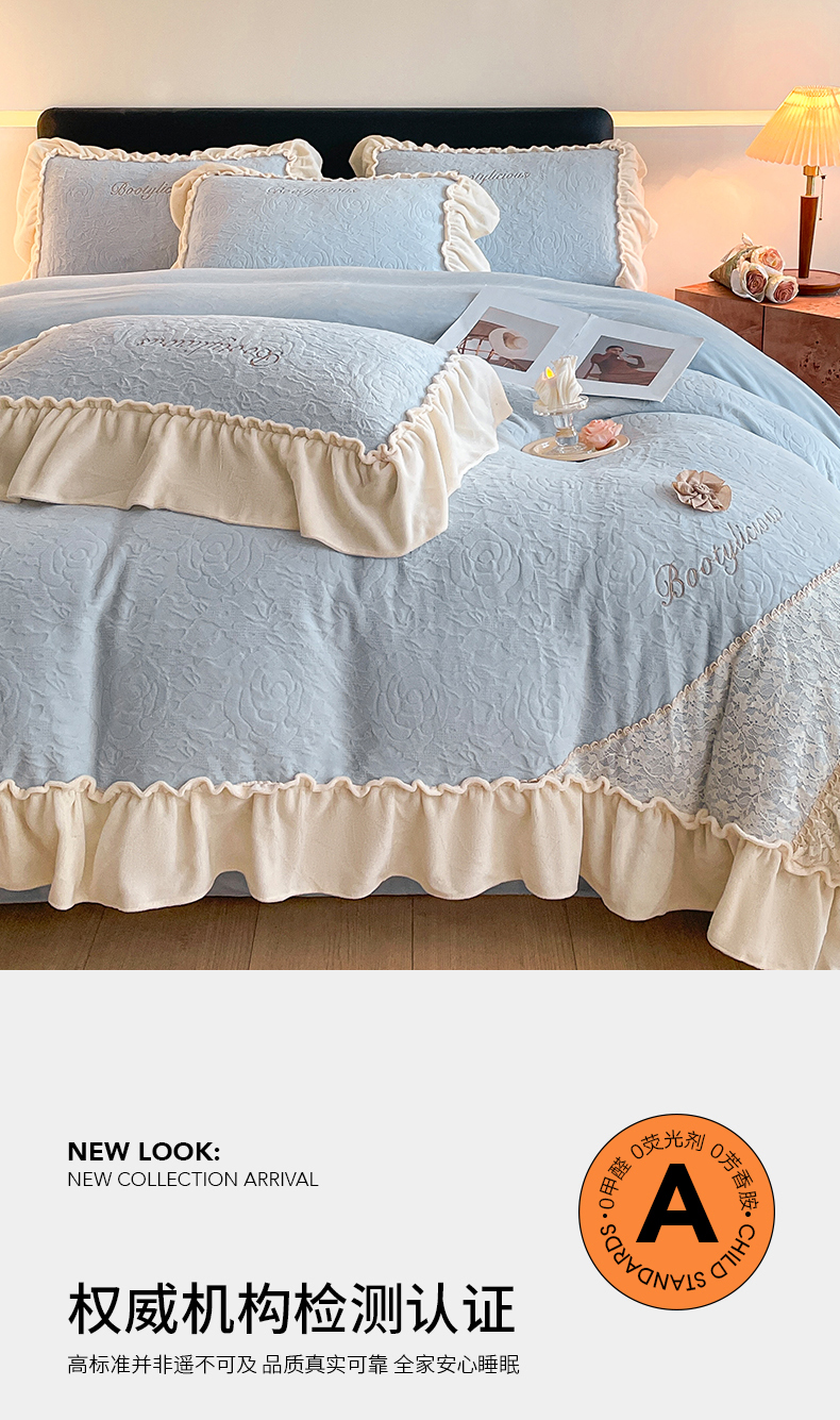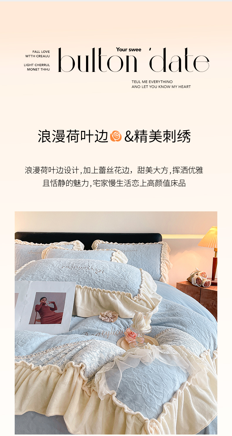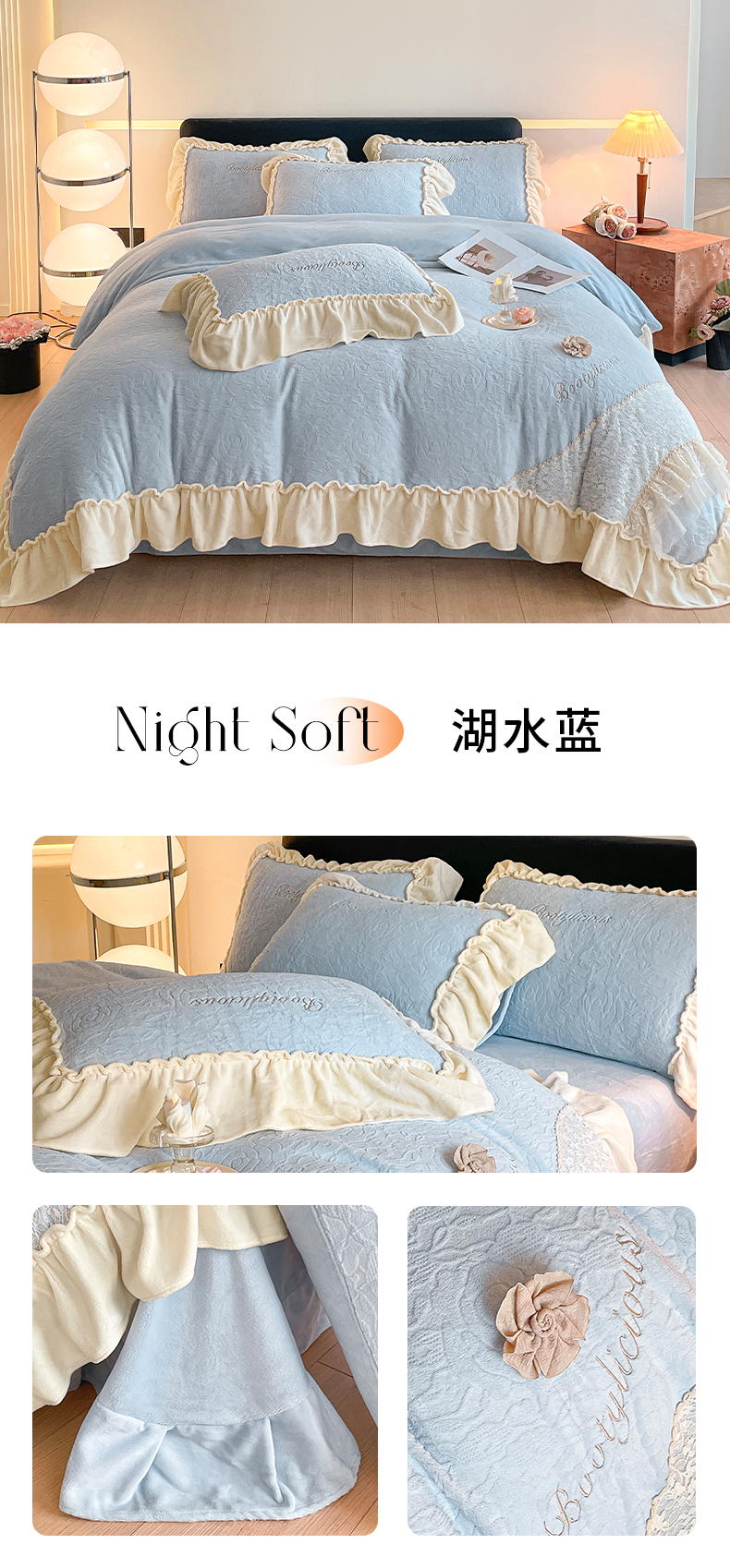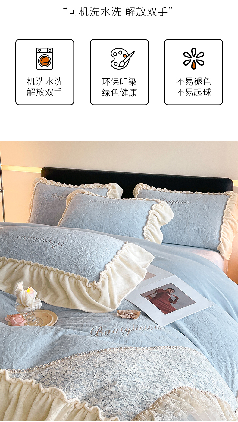 嗯呢家纺 2024新款A类高克重全消光韩版雕花贴布绣牛奶绒四件套-玫瑰恋人 玫瑰恋人-湖水蓝