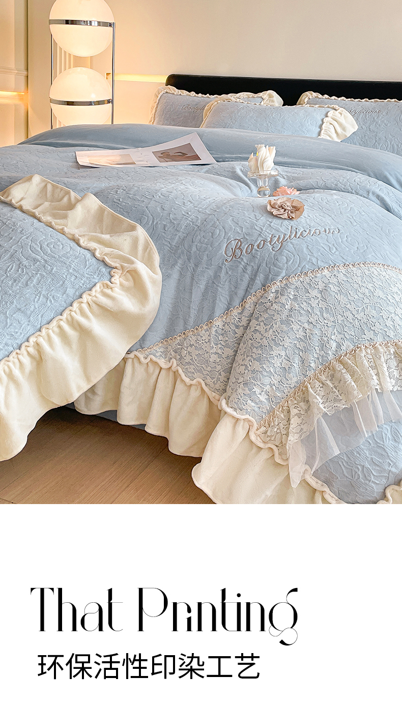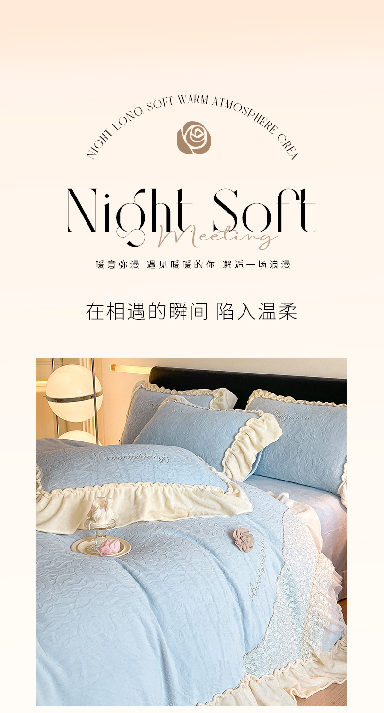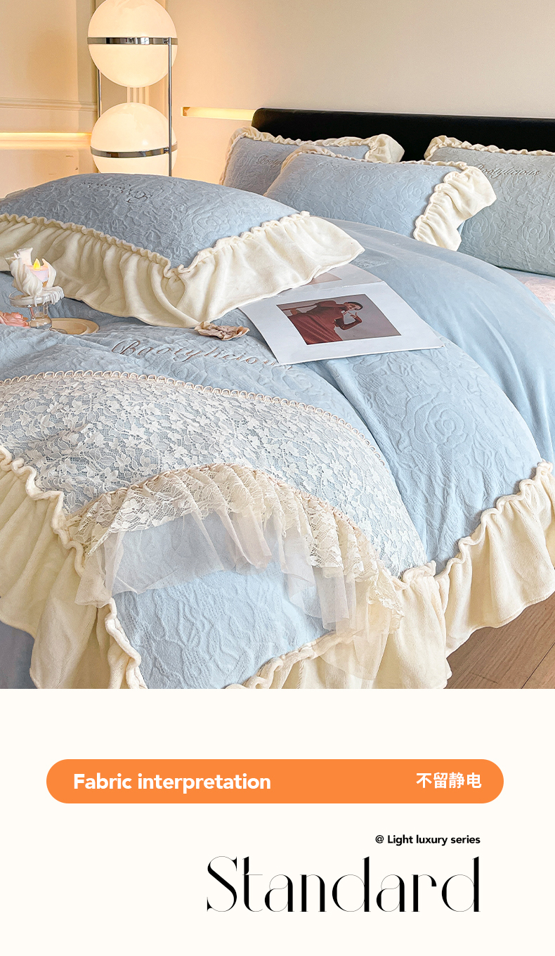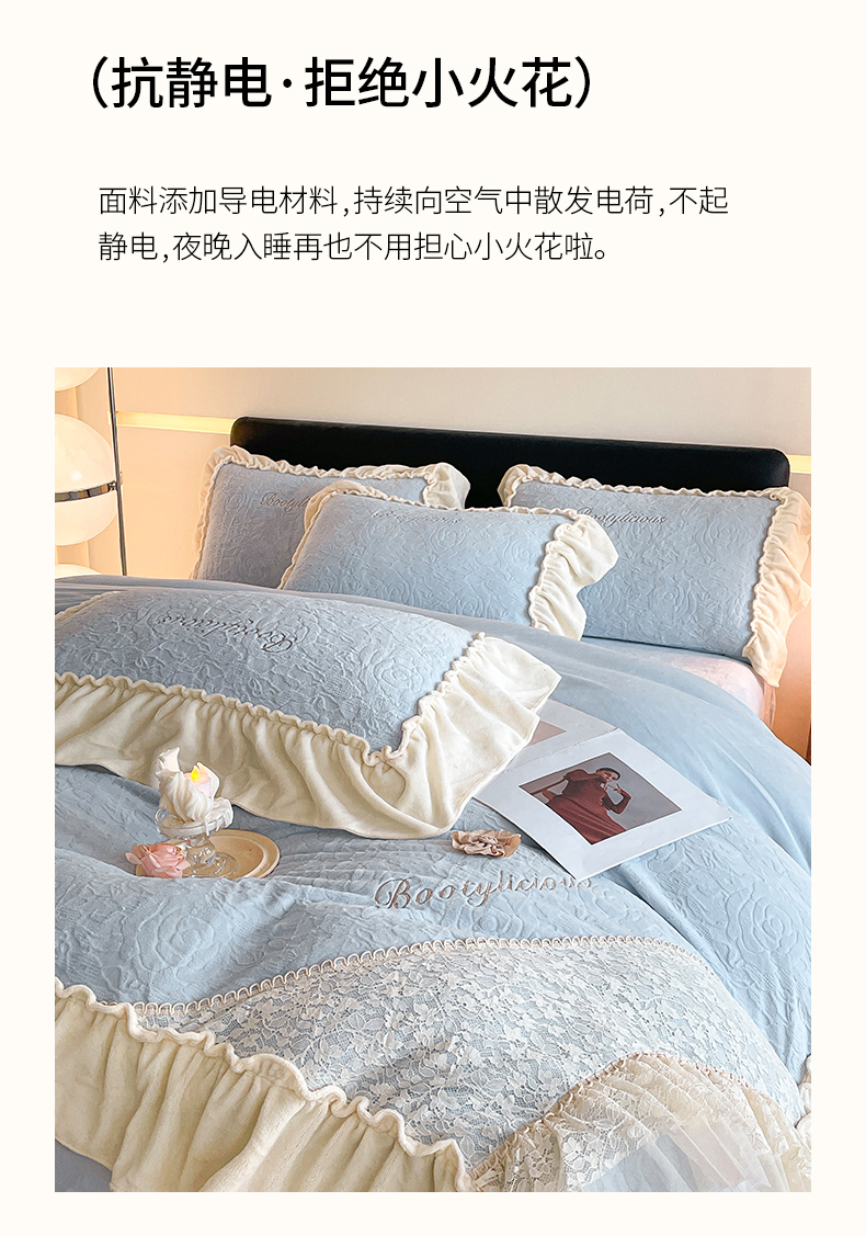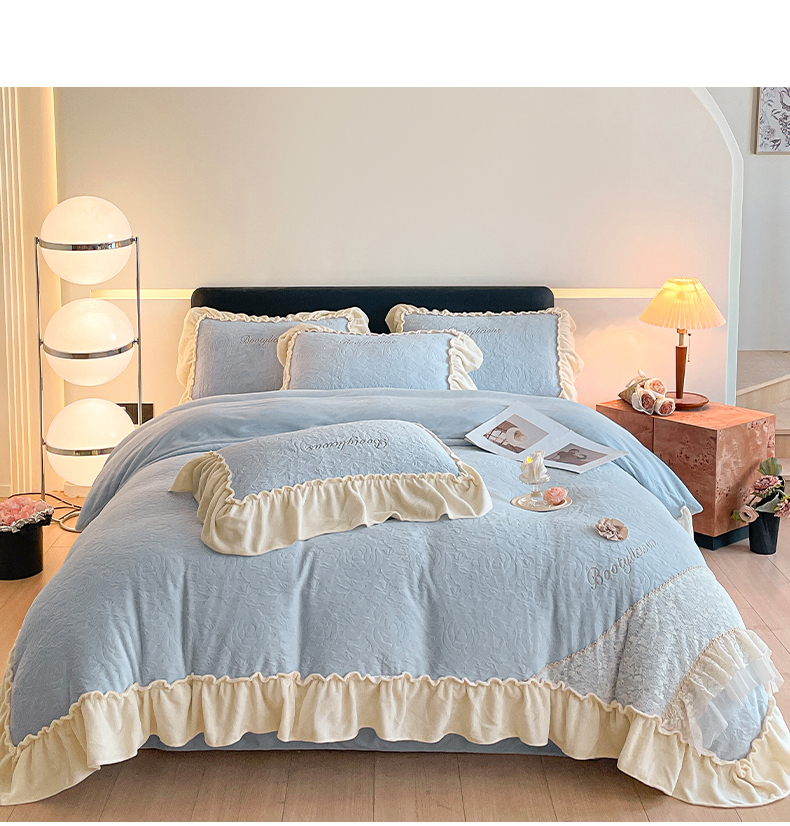 嗯呢家纺 2024新款A类高克重全消光韩版雕花贴布绣牛奶绒四件套-玫瑰恋人 玫瑰恋人-湖水蓝