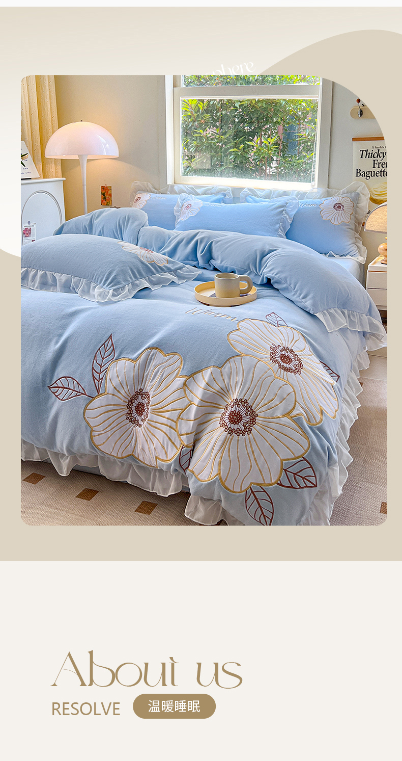 商品名称:2024新款亲肤舒适牛奶绒重工艺四件套木子专版 半亩花田杜若蓝