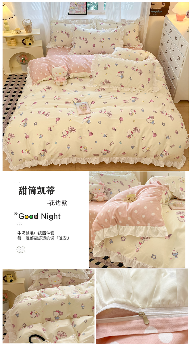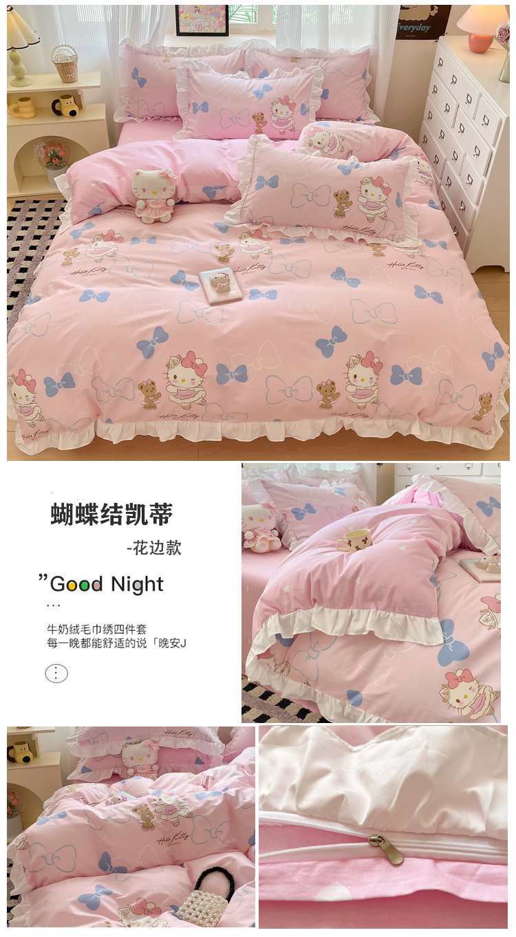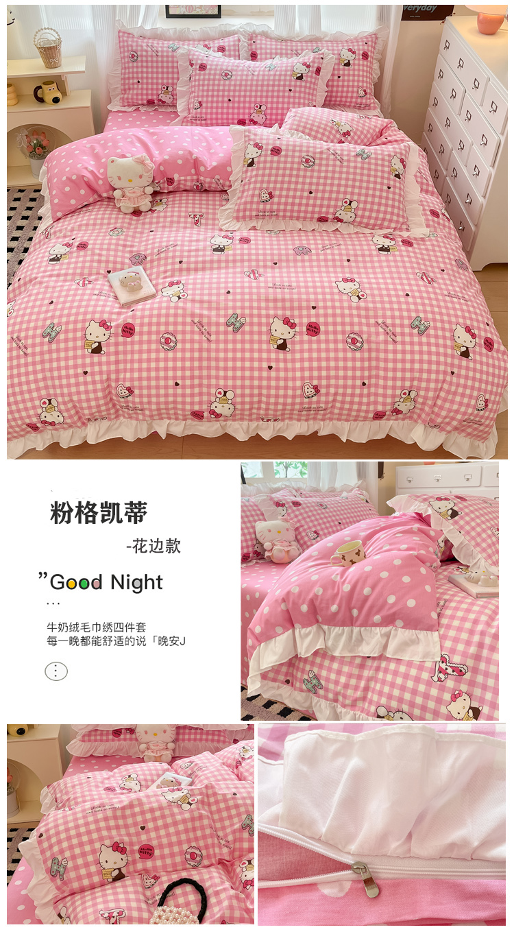 (总)三朵家纺 2024新款牛奶绒绣花四件套三丽鸥系列,草莓公主KT,梦幻旅行,逃学帕恰,淘气宝贝,甜心搬运工,香香公主KT,樱桃美乐蒂