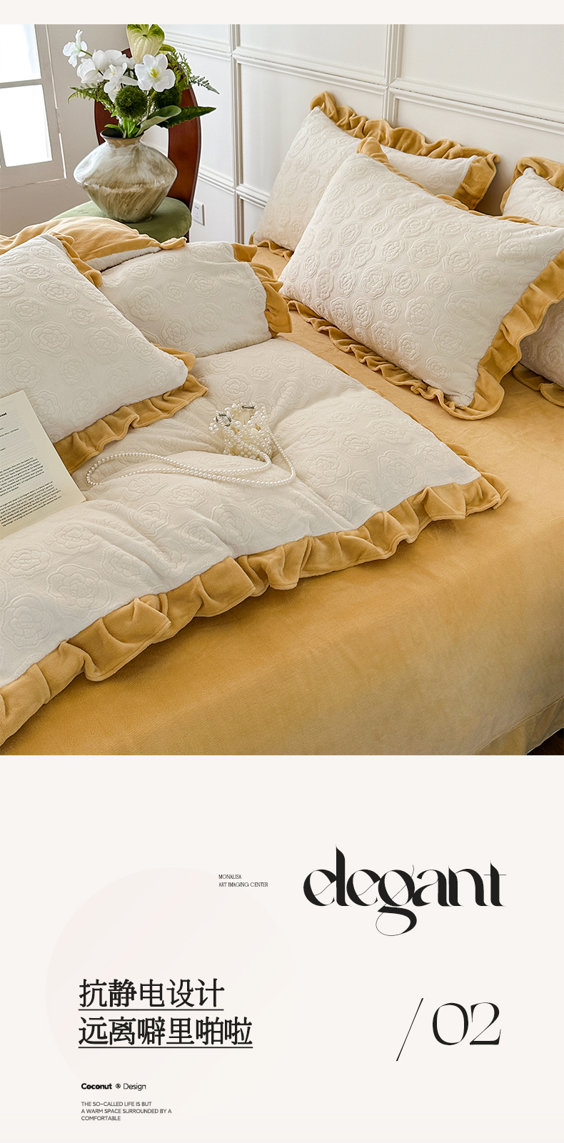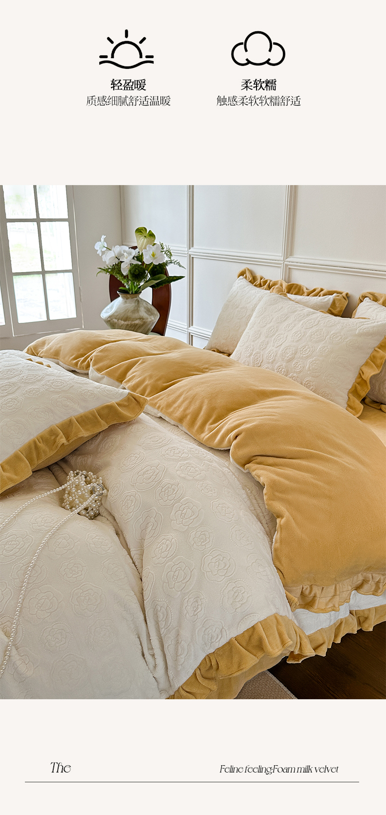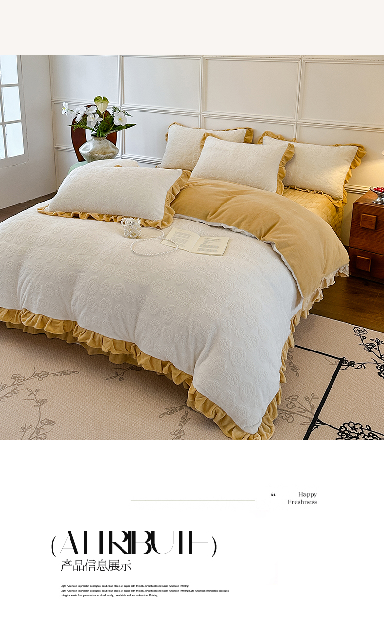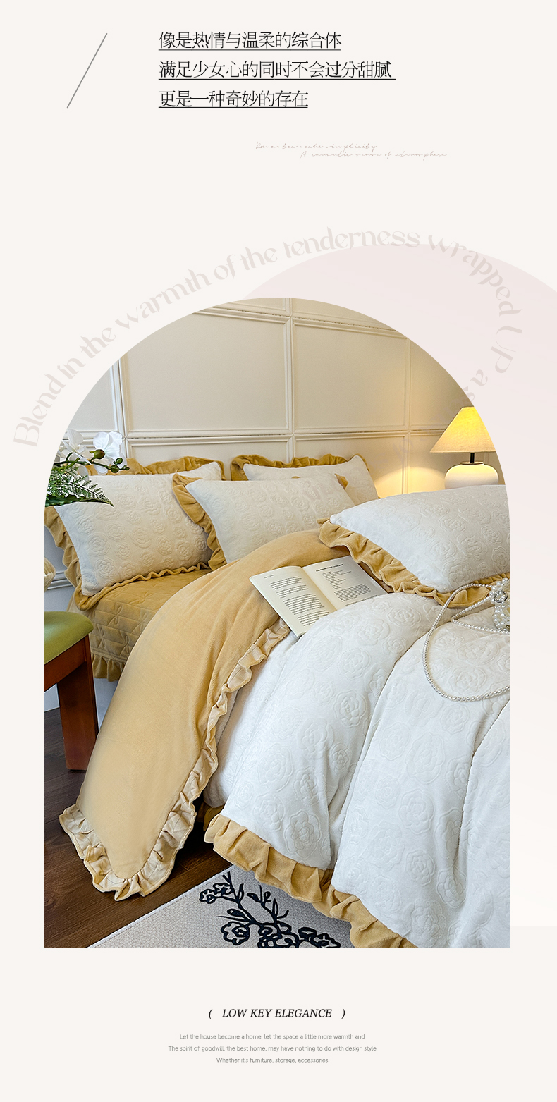 当前位置: 91家纺网 > 商品网购 > 床品套件 > 四件套 > 牛奶绒四件套 > 野合家纺 2024新款法式A类雕花牛奶绒韩版公主风四件套床盖款床单款床笠款 山茶花-象牙白