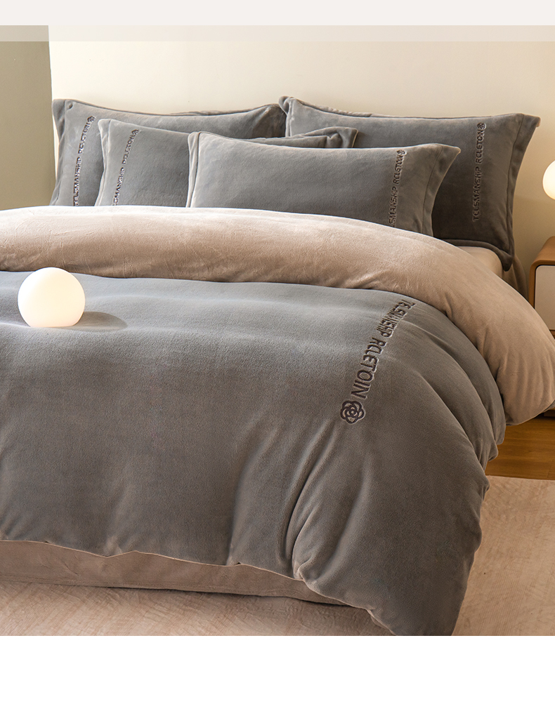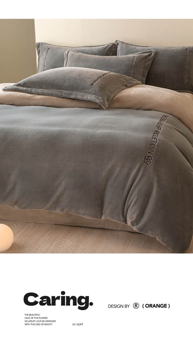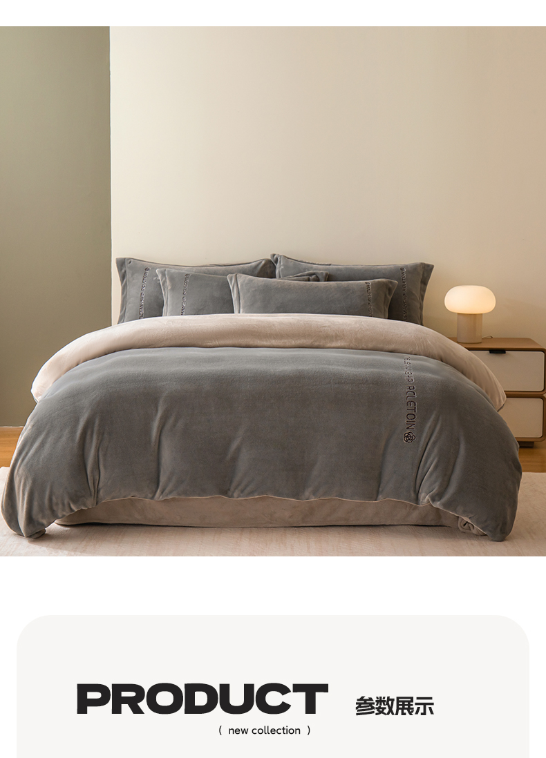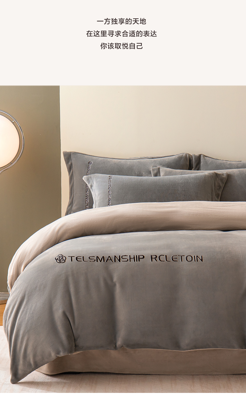 商品名称:花愿(原花纪) 2025新款牛奶绒撞色刺绣四件套—泽西 经典灰+香草灰