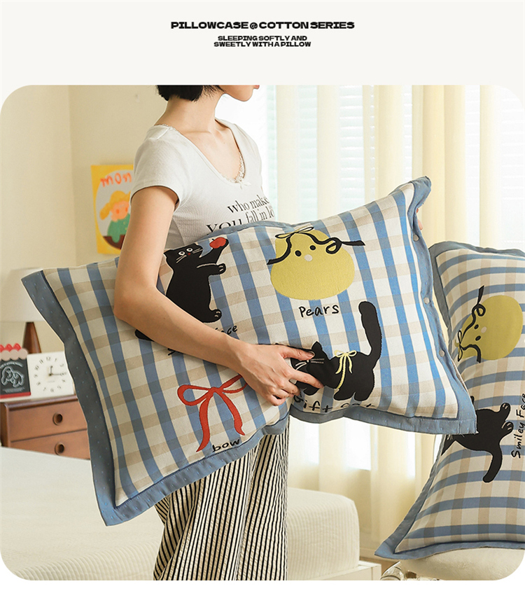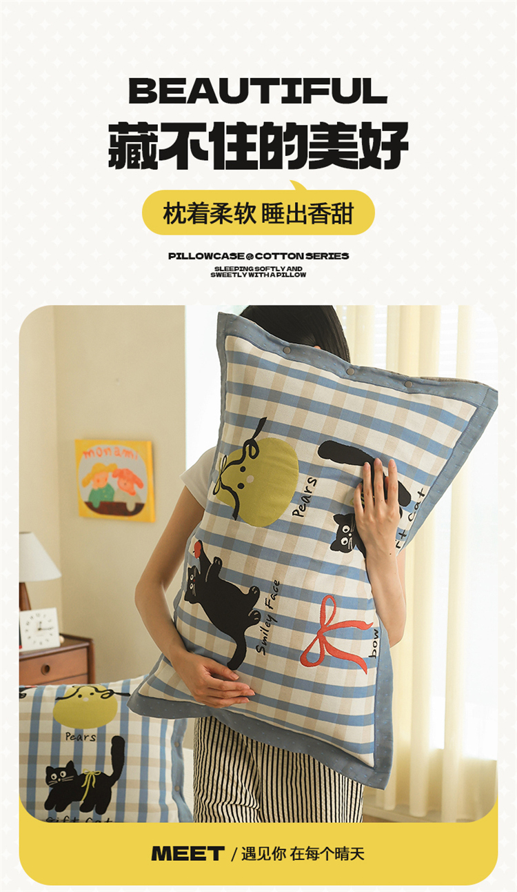 2024新款全棉四层纱布枕套一对装纽扣款枕套 大眼萌猫