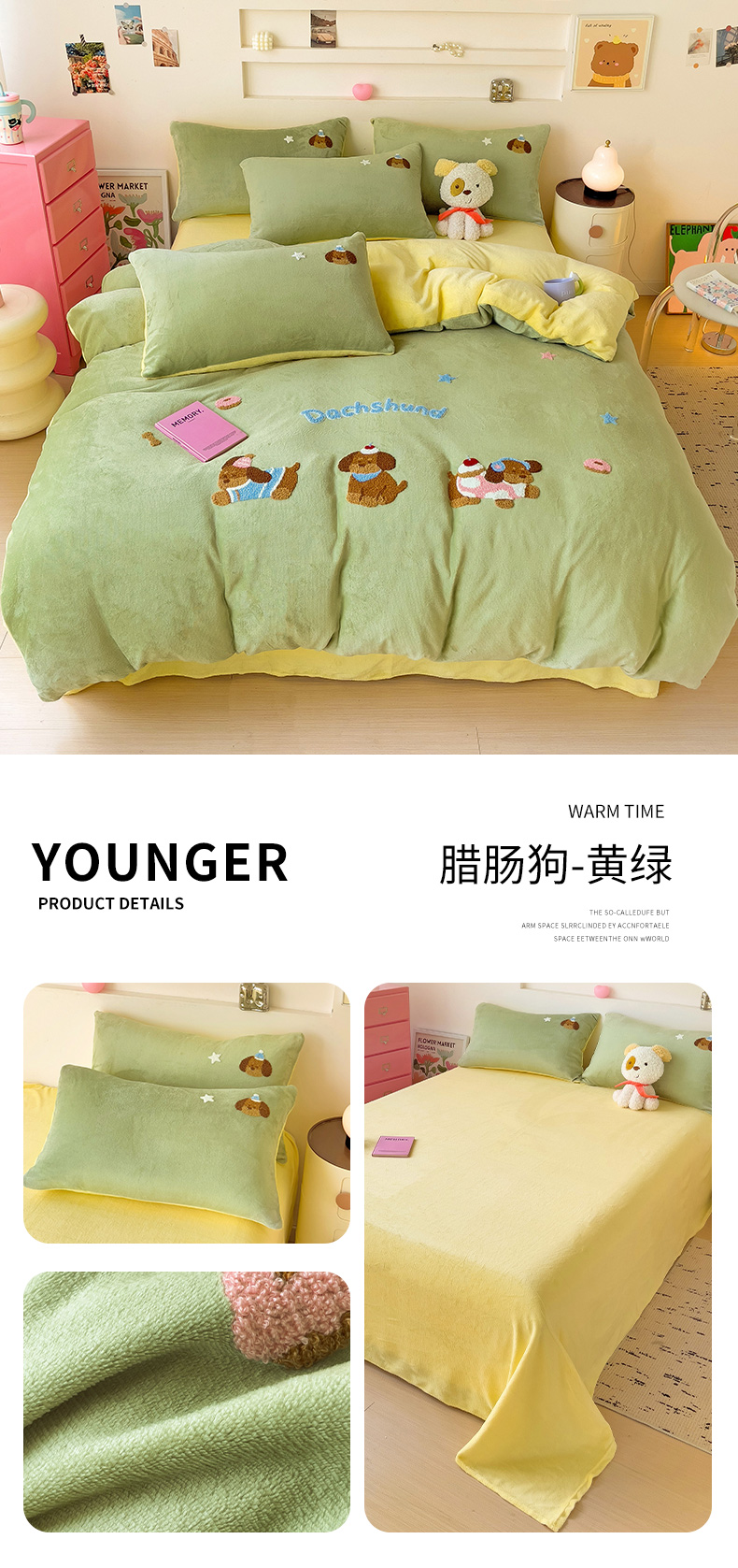 商品名称:梦之岛 2024新款牛奶绒卡通毛巾绣四件套腊肠狗 腊肠狗-黄绿