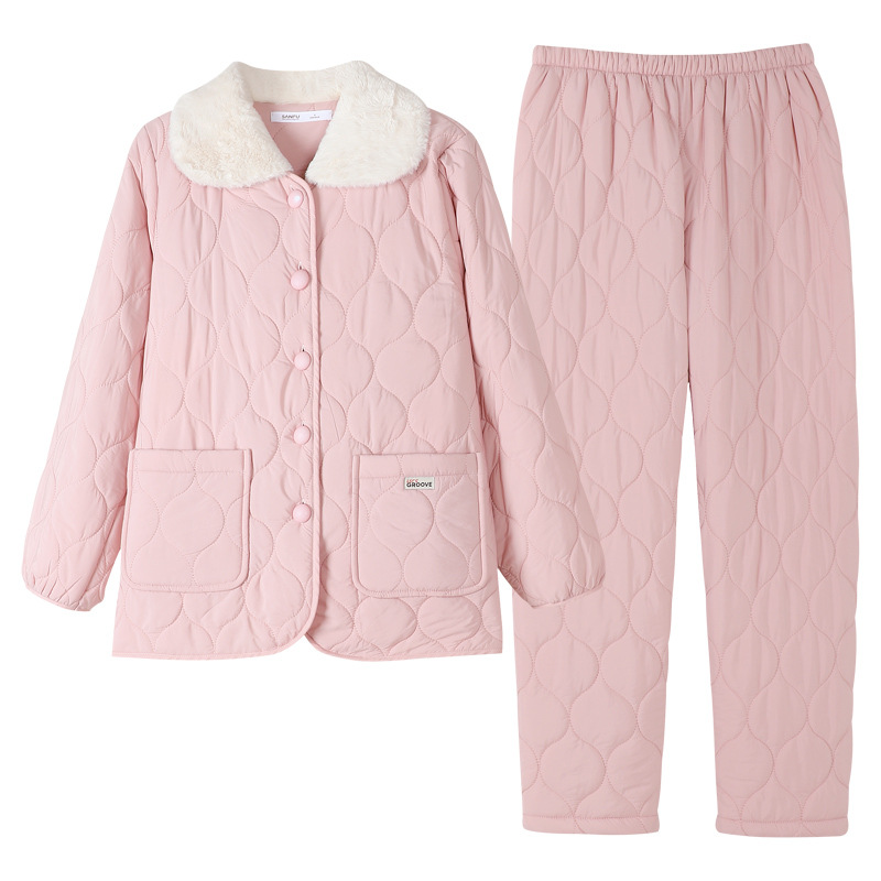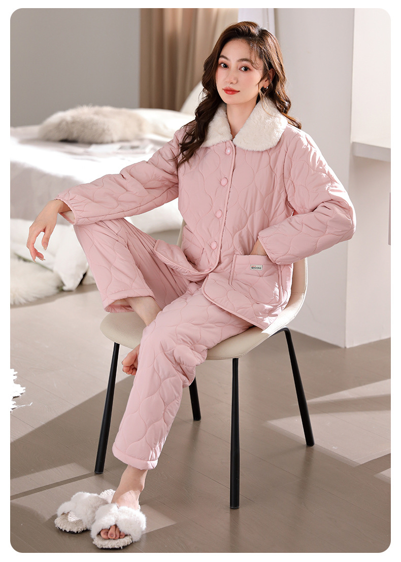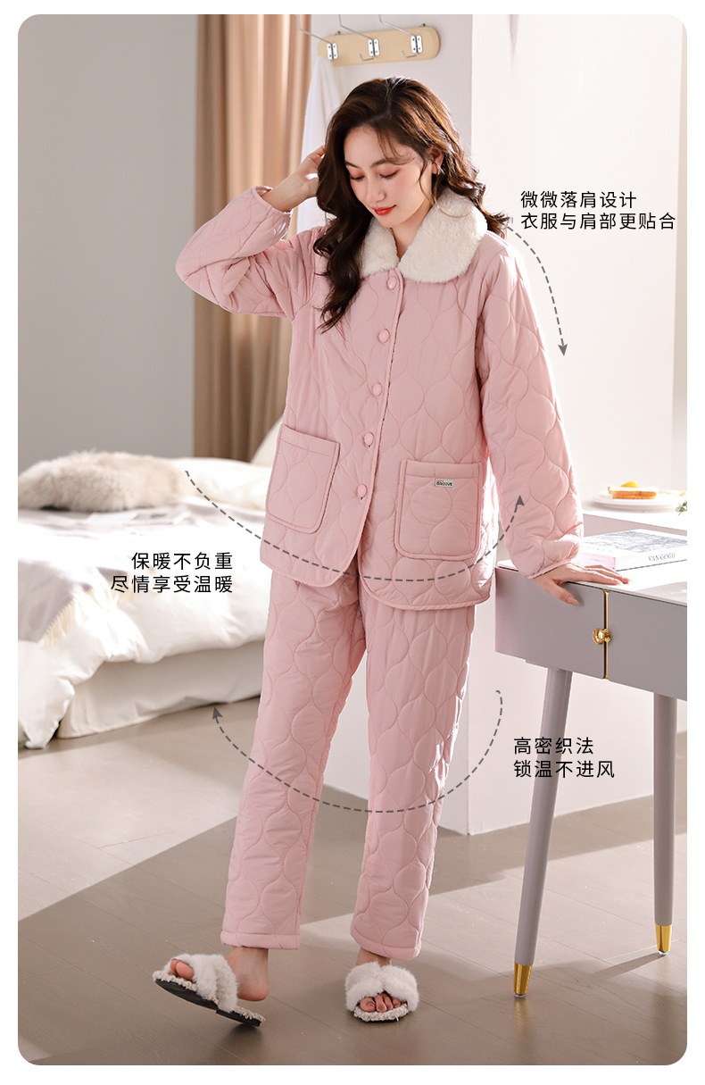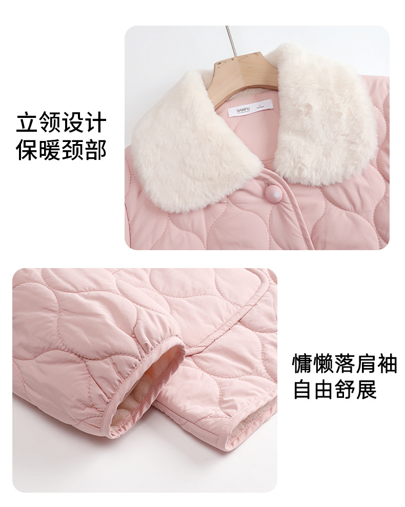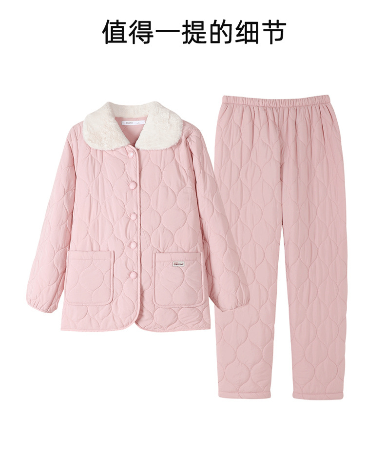 (总)洛兰沙家居馆 2024新款清新睡衣女秋冬三层夹棉珊瑚绒加厚保暖两件套女士可外穿加绒家居服,粉色,灰色,白色,玉色