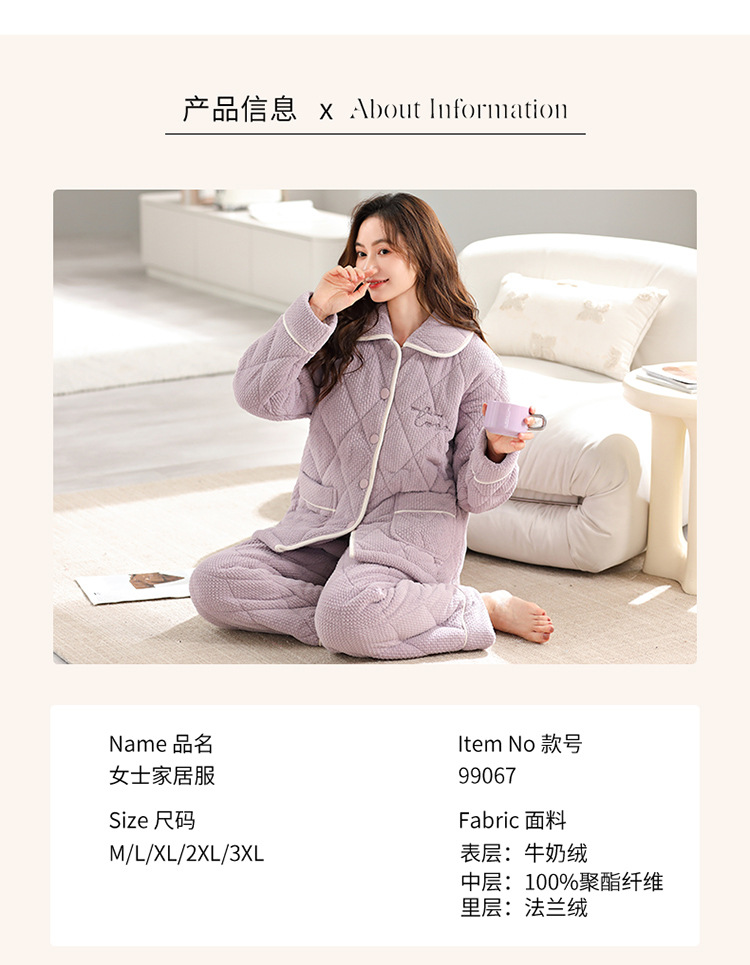 (总)洛兰沙家居馆 2024新款清新款睡衣女秋冬三层夹棉珊瑚绒加厚保暖两件套女士可外穿加绒家居服,99078,99077,99064,99065,99076,99063,99062