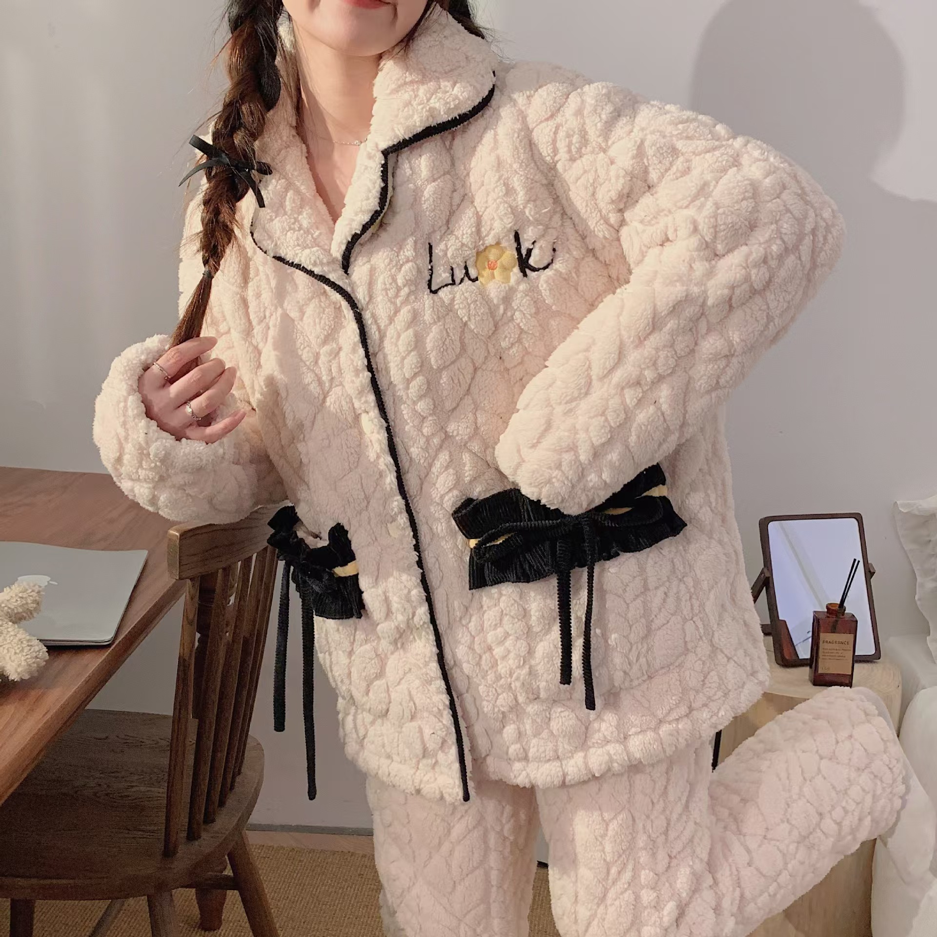 (总)洛兰沙家居馆 2024新款秋冬季清新款睡衣女三层夹棉珊瑚绒加厚保暖两件套女士可外穿加绒家居服,白色
