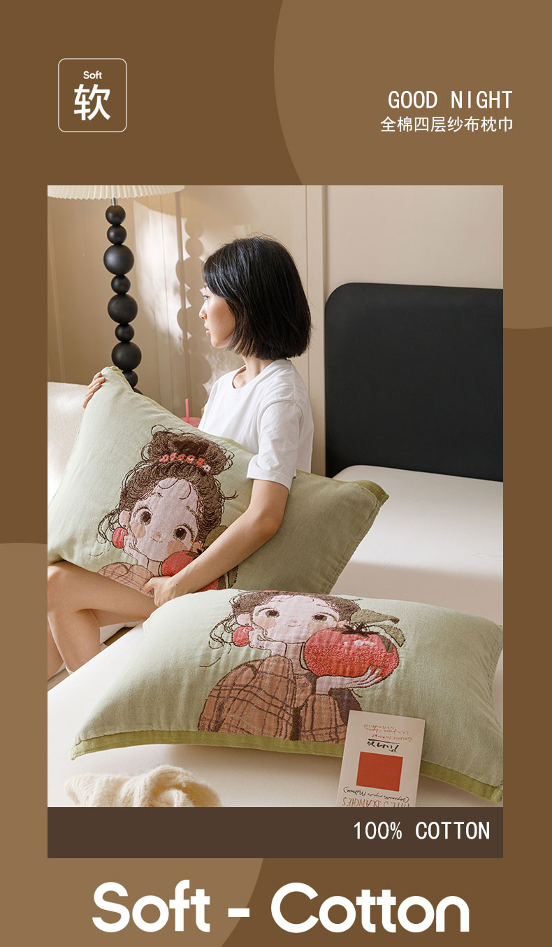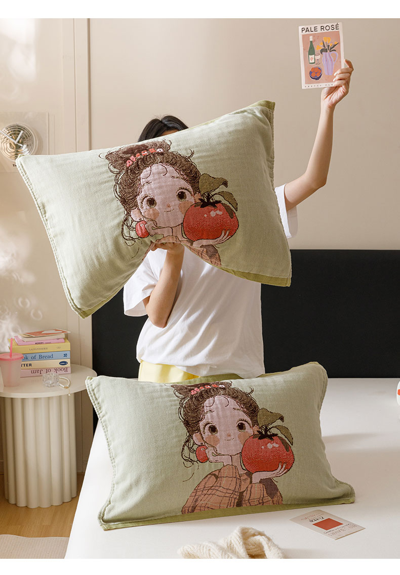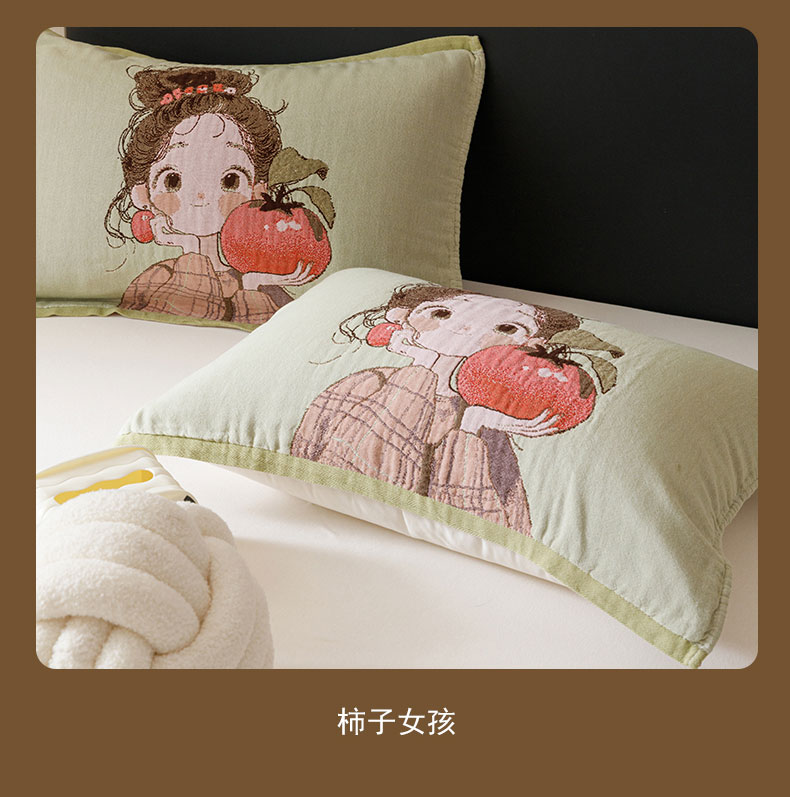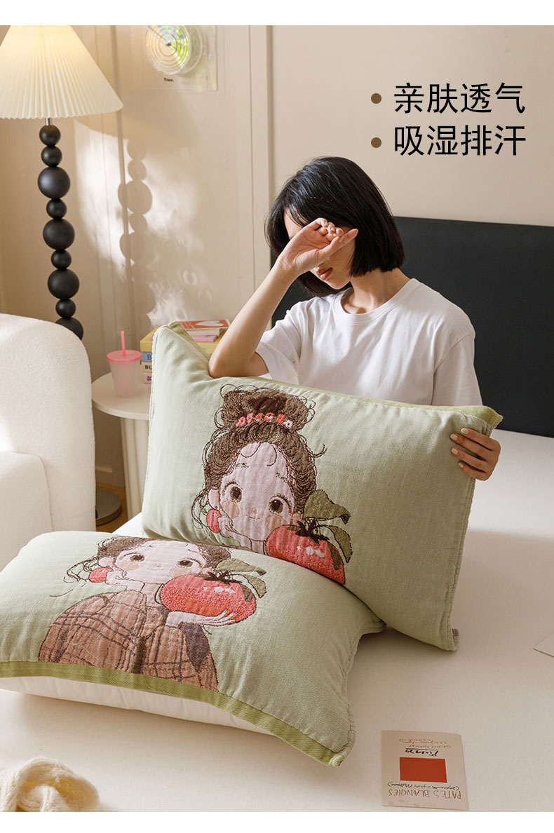 当前位置: 91家纺网 > 商品网购 > 床上用品 > 枕巾 > 麻依 2024新款纯棉纱布枕巾一对装全棉四层纱布54*78cm/对 柿子女孩