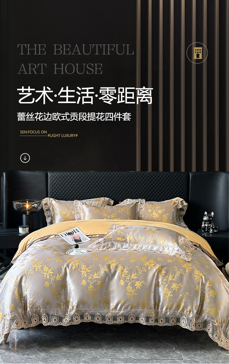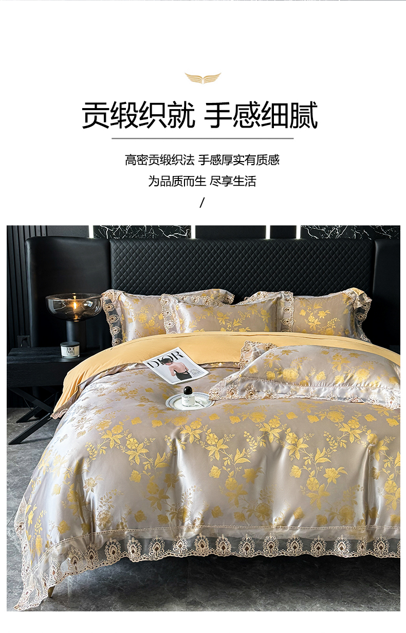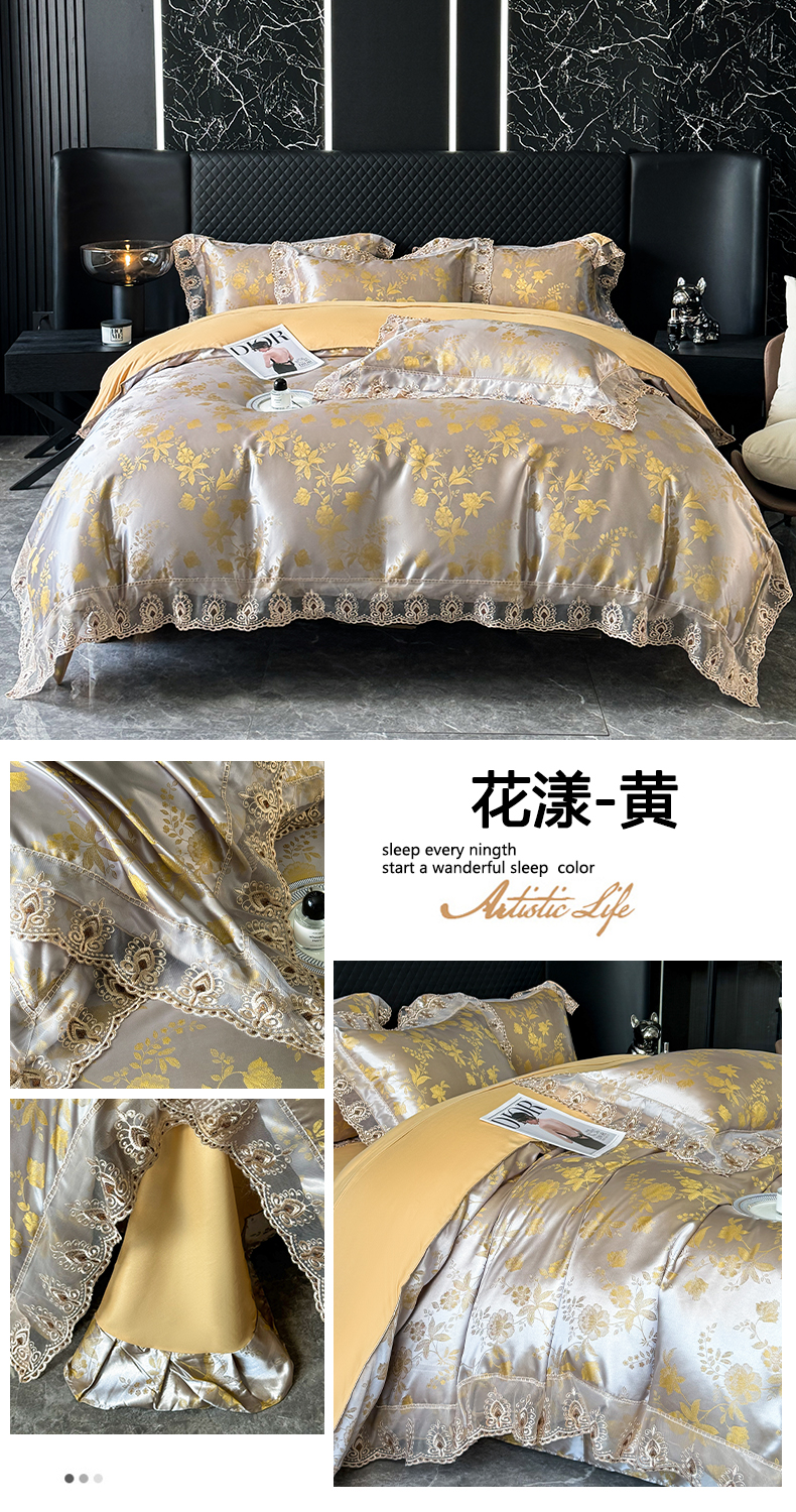 七夜居 2025新款蕾丝花边欧式贡缎提花四件套礼盒装 花漾-黄