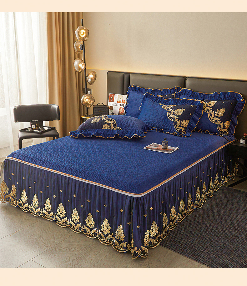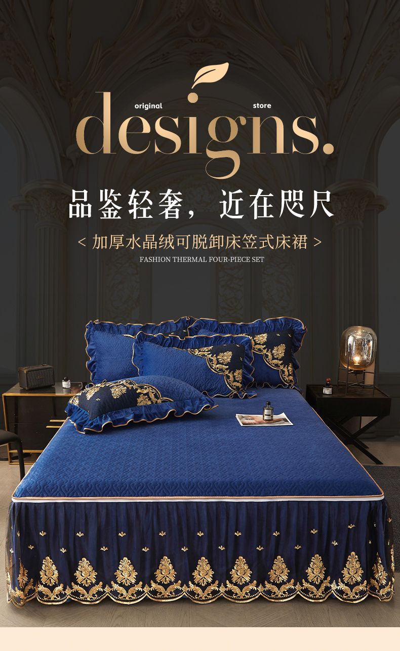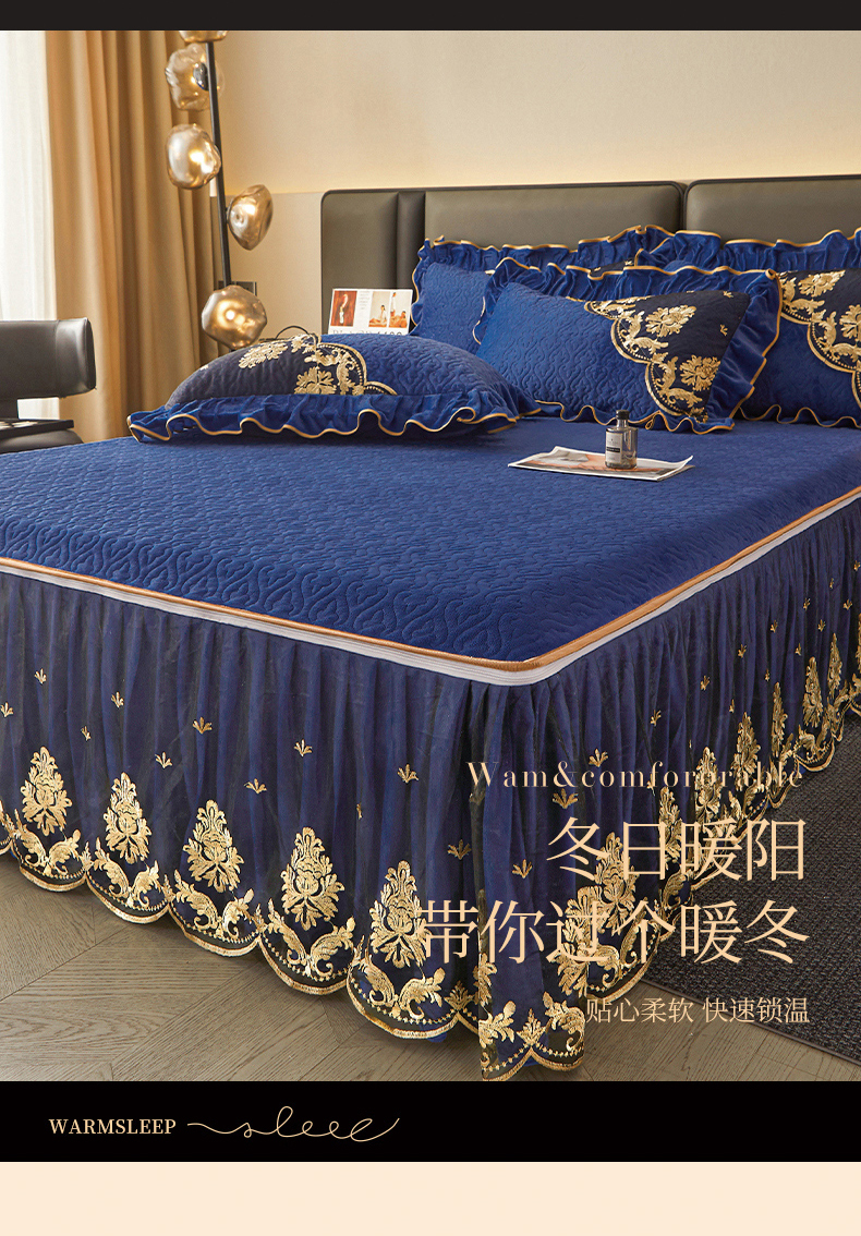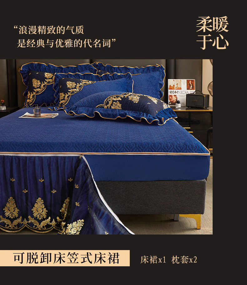 罗艺轩 2024新款高克重水晶绒夹棉床裙三件套-欧典风尚 欧典风尚-宝石蓝