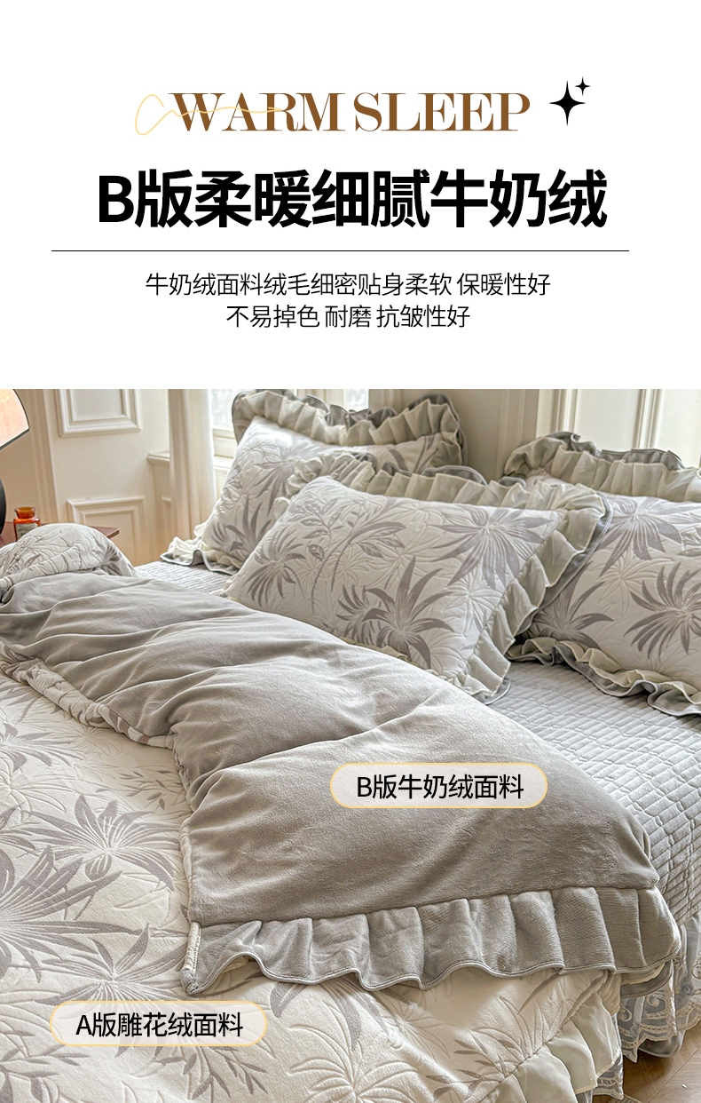(总)宜凡家纺 2025新款牛奶绒雕花拼接刺绣床盖四件套,晨雾蔷薇,蝶恋花语,花野漫屿,蕾丝蝶音,洛可可影,雾蓝漫织,香槟漫月