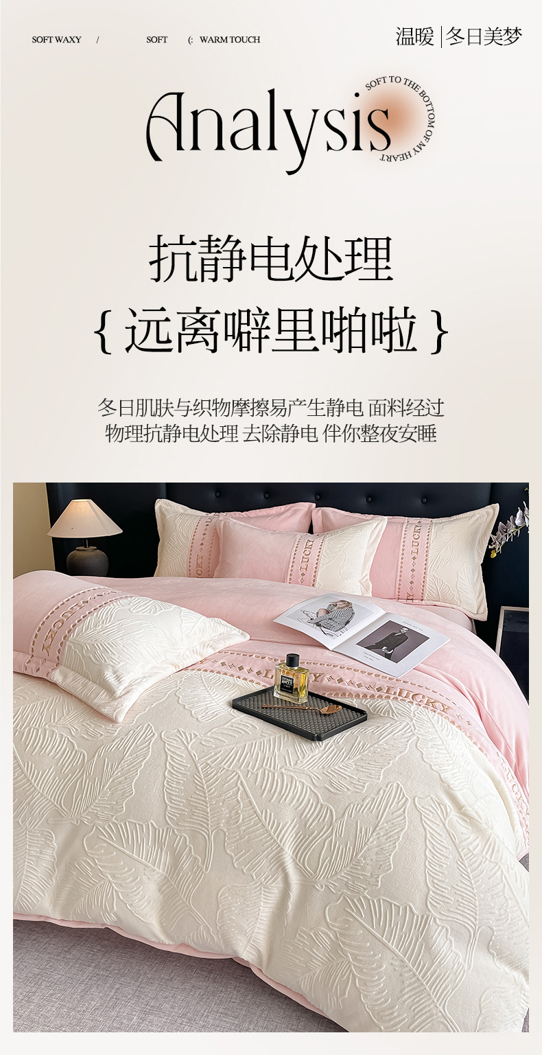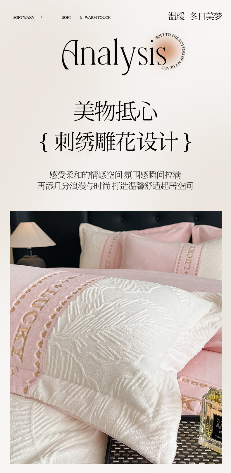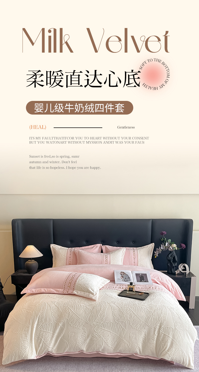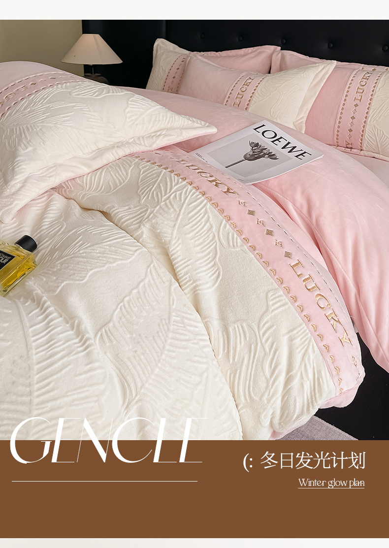 总金窝窝家纺2024重工刺绣280克A类婴儿牛奶绒刺绣四件套系列-美好生活,美好生活—粉