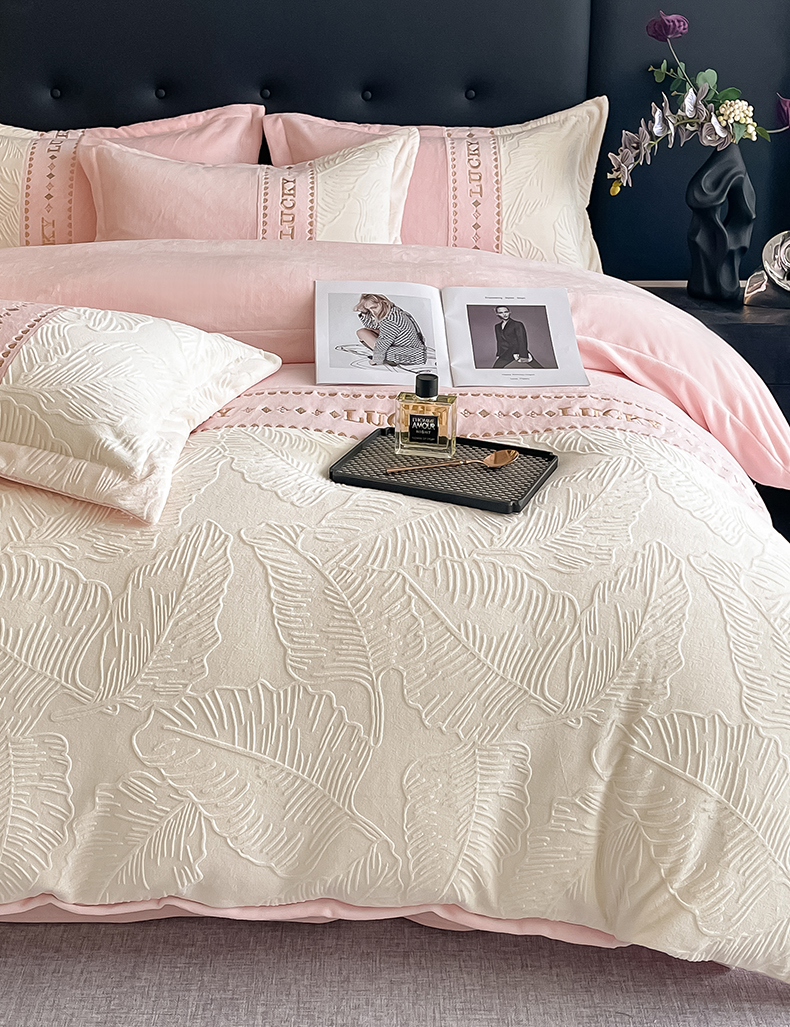 金窝窝家纺 2024新款婴儿级牛奶绒拼接刺绣烂花雕花绒四件套--朱丽叶系列 朱丽叶-粉