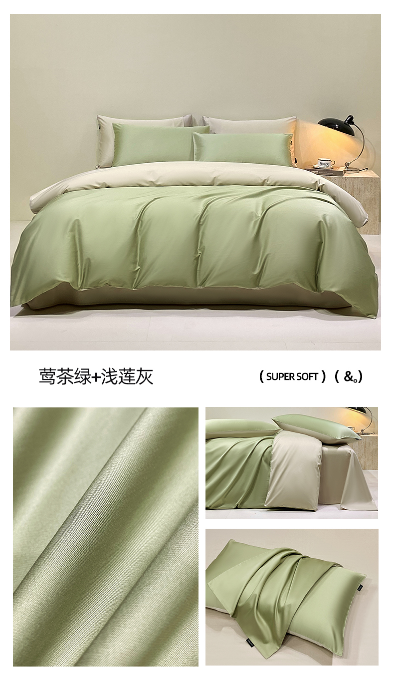商品名称:拼社家纺 2025新款轻奢高支贡缎长绒棉四件套全棉四件套简约纯色纯棉床上用品(买家秀) 莺茶绿+浅莲灰
