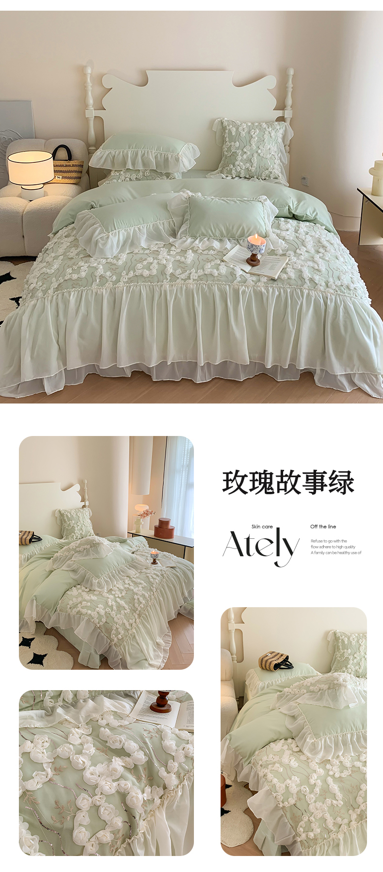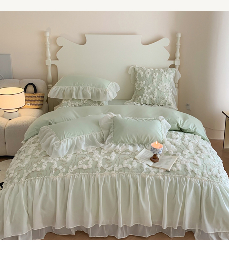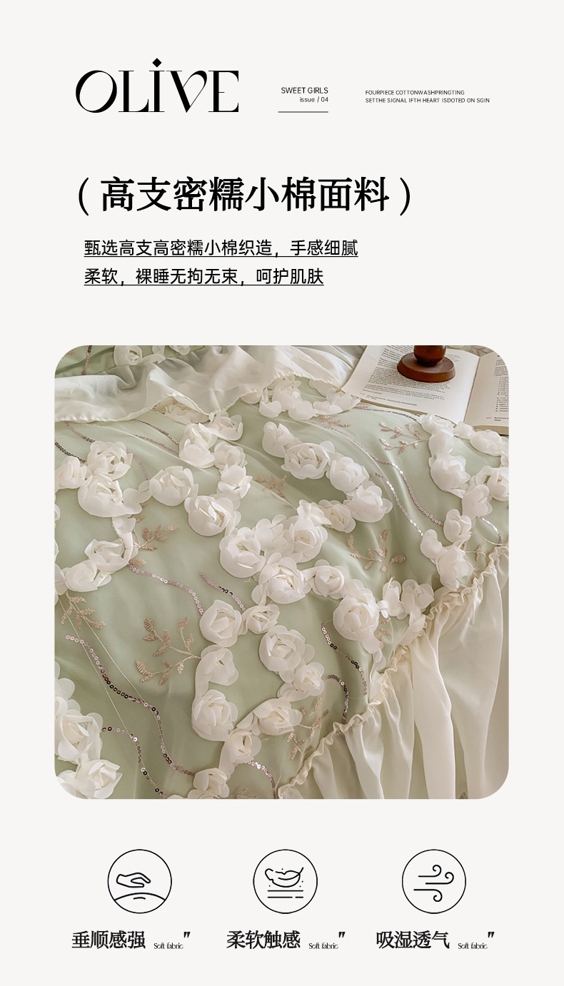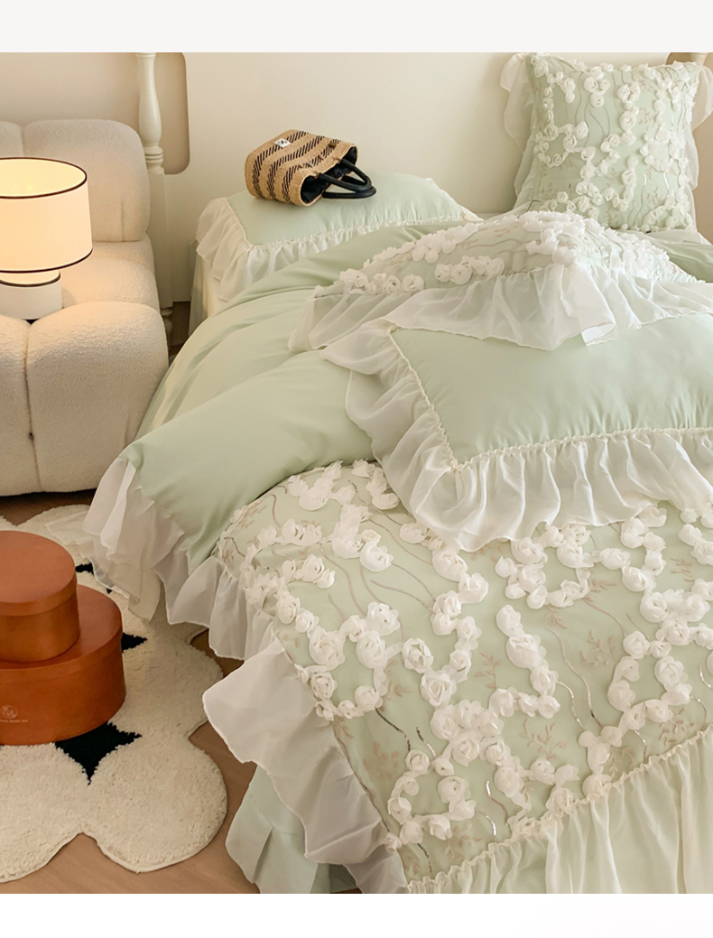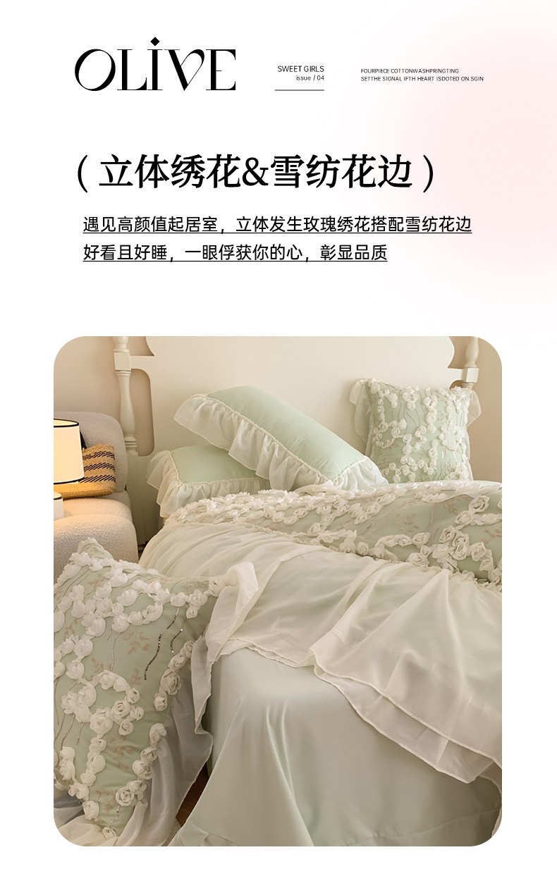 当前位置: 91家纺网 > 商品网购 > 床品套件 > 四件套 > 其它四件套 > 吾欢心2025新款 A类糯小棉立体绣花雪纺花边四件套(玫瑰故事系列) 玫瑰故事绿