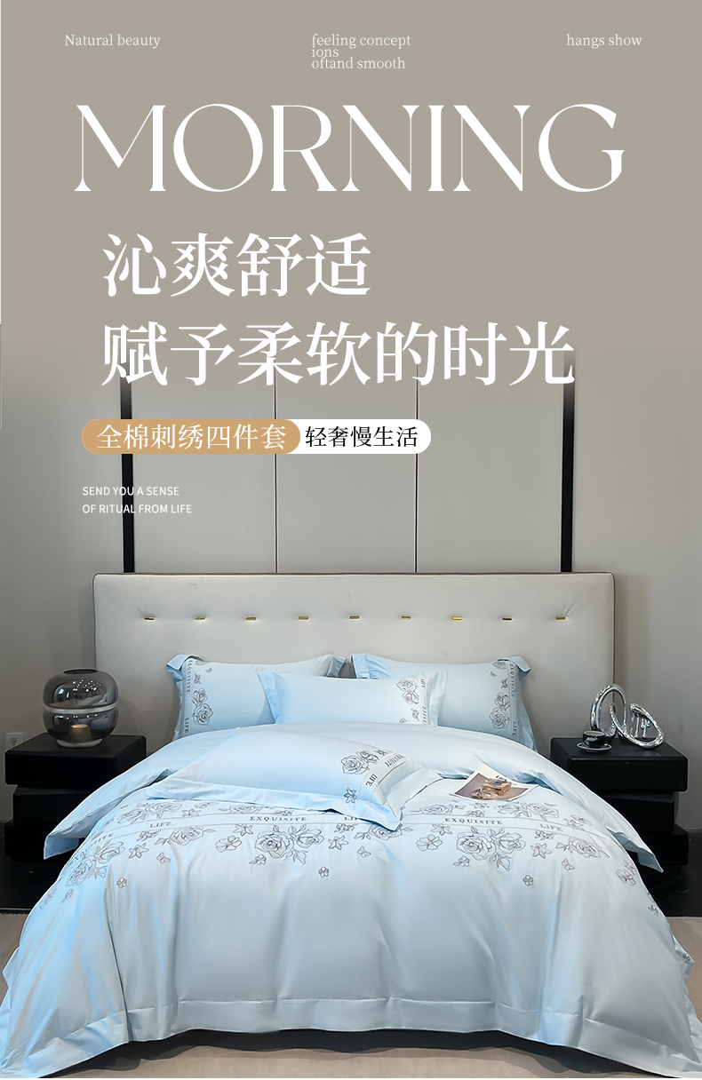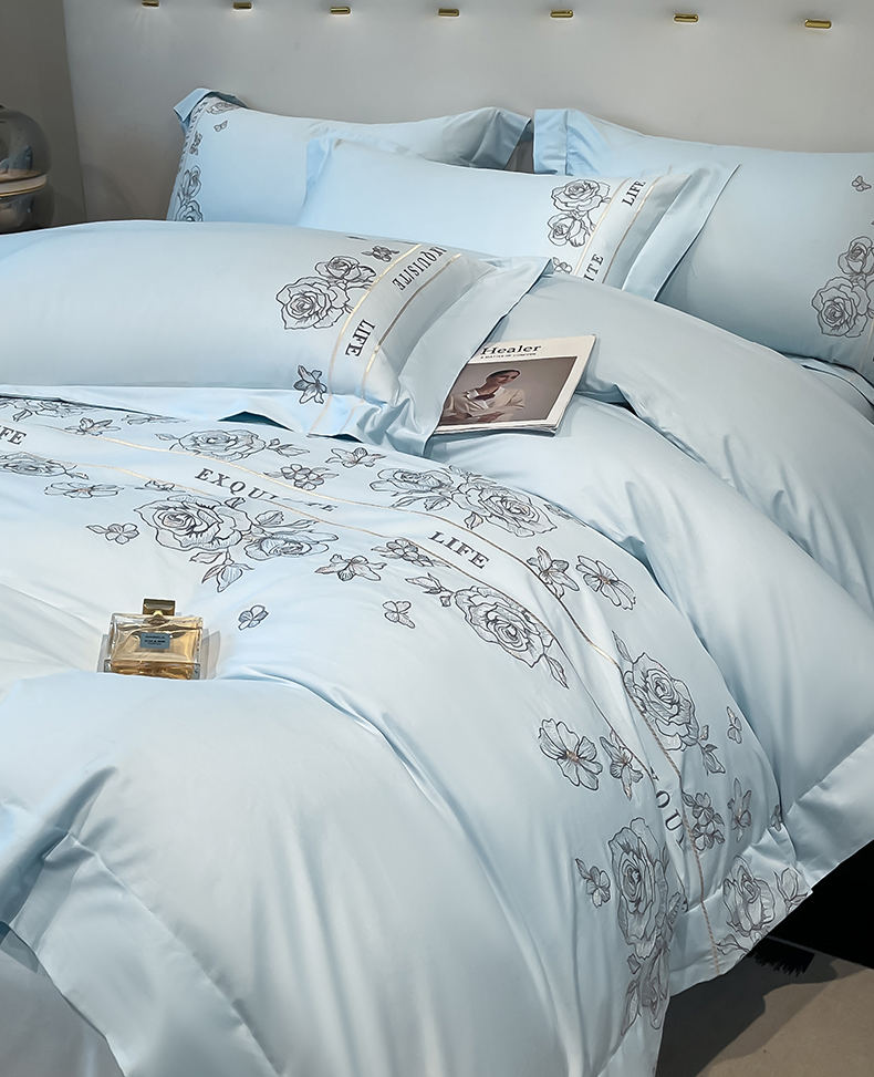 金牛座家纺 2025新款长绒棉全棉刺绣四件套-倾心系列 倾心-浅蓝