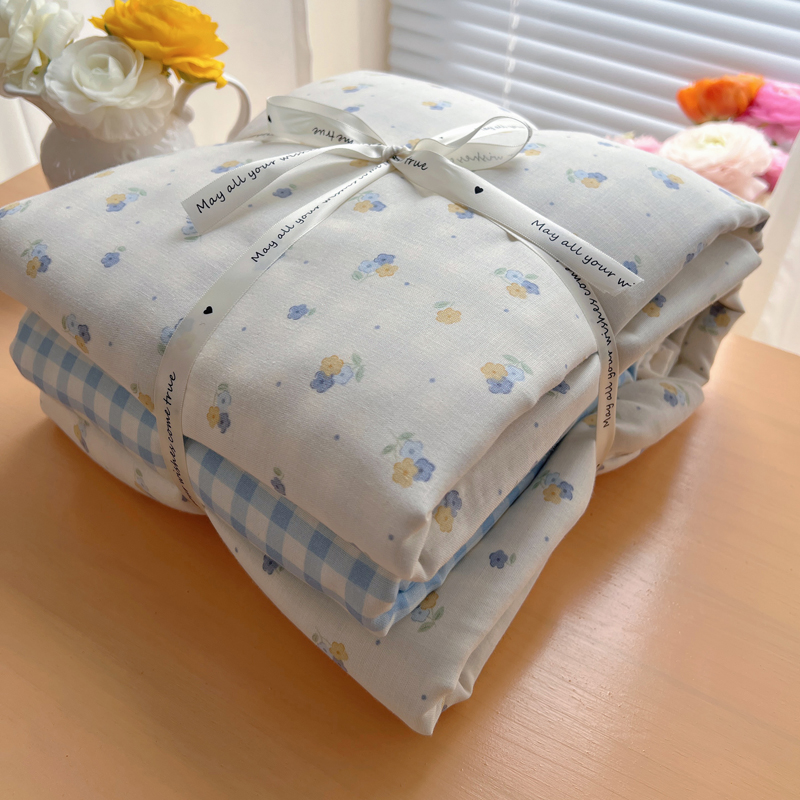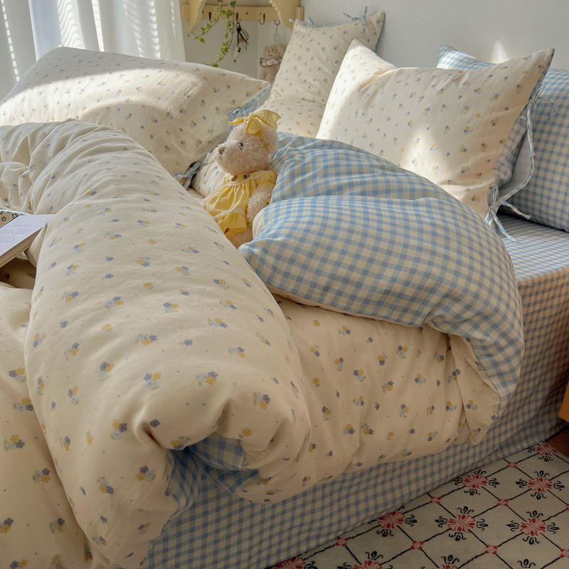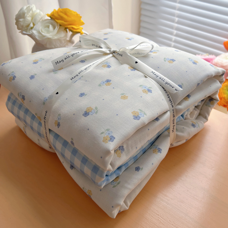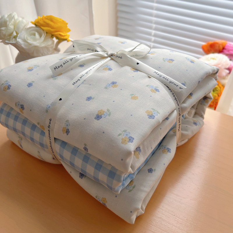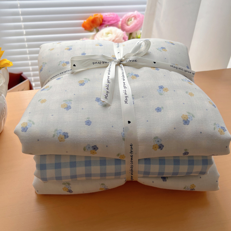 桃喜 2025双层纱碎花格子蝴蝶结系列四件套 柚香蓝格