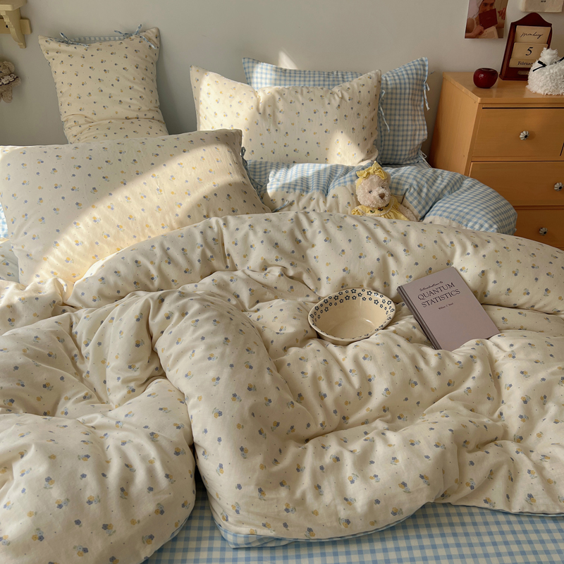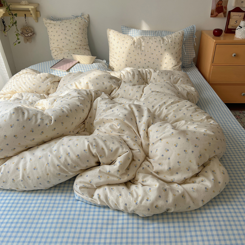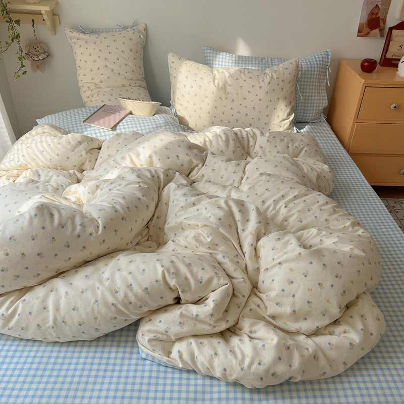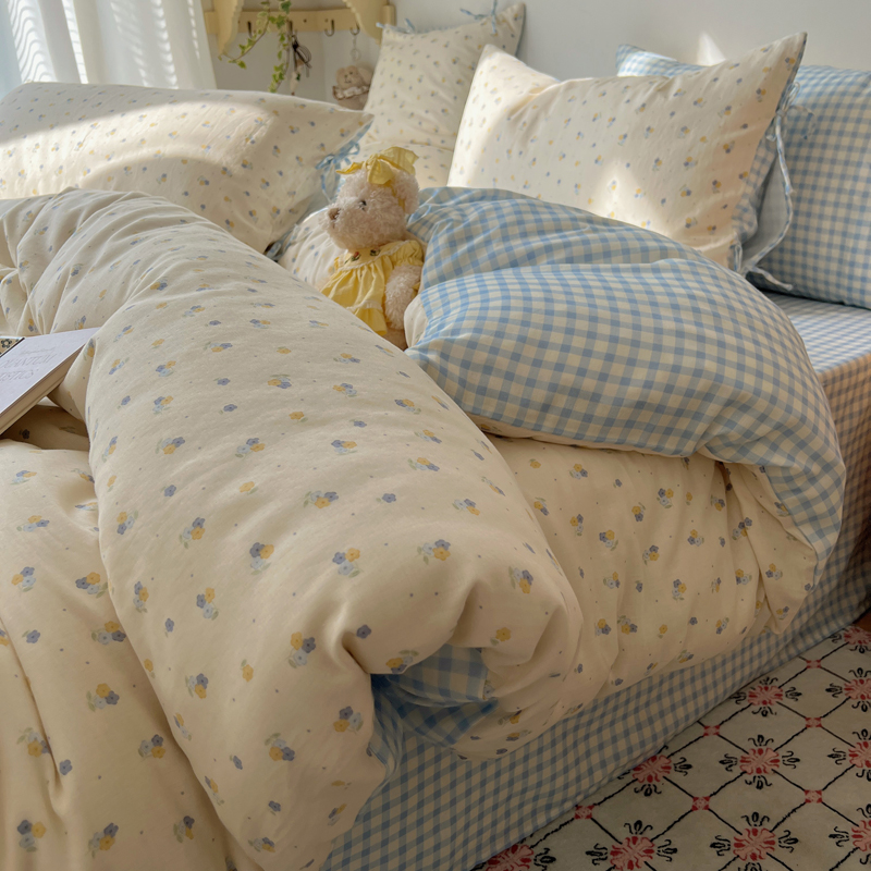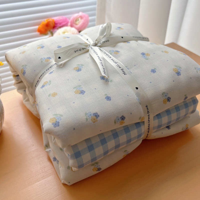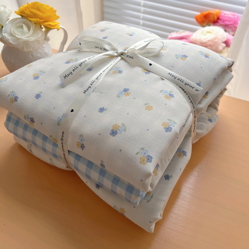 桃喜 2025双层纱碎花格子蝴蝶结系列四件套 柚香蓝格