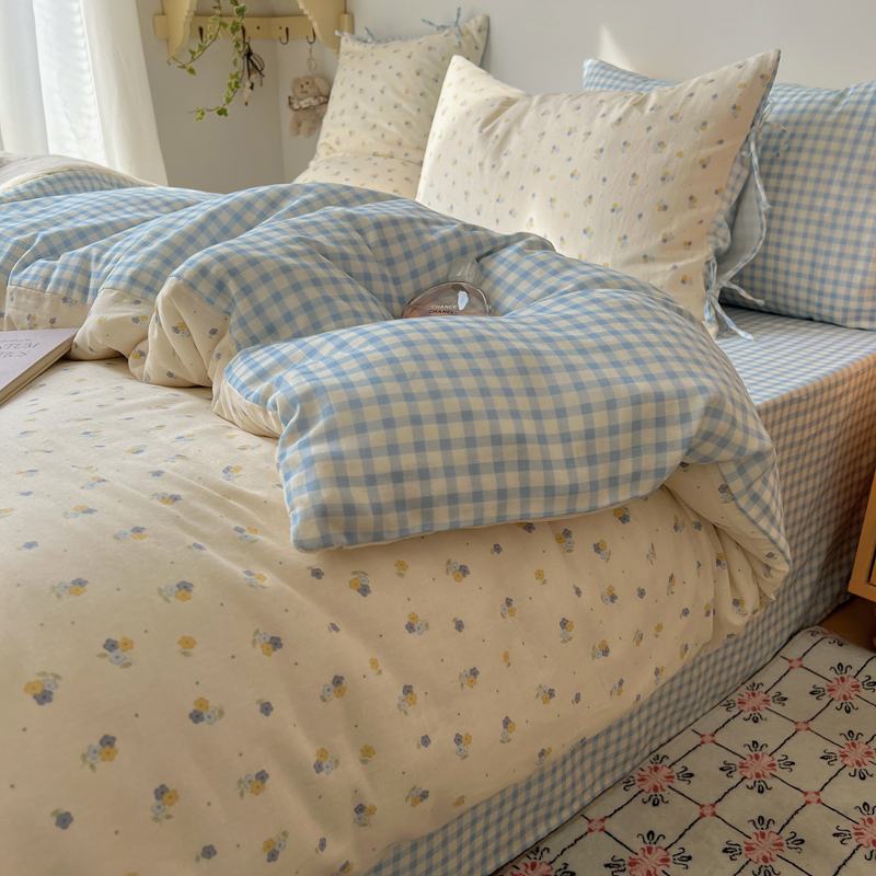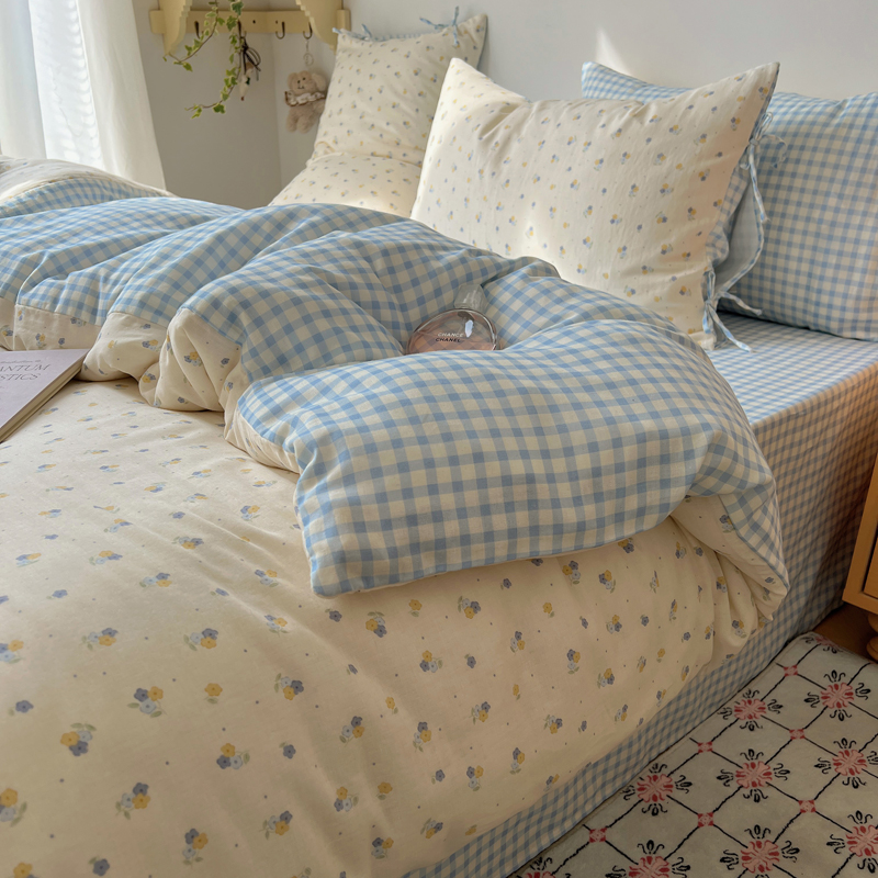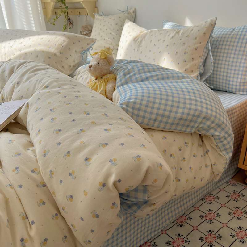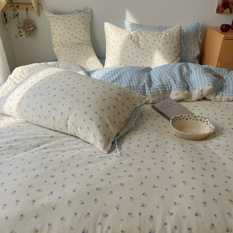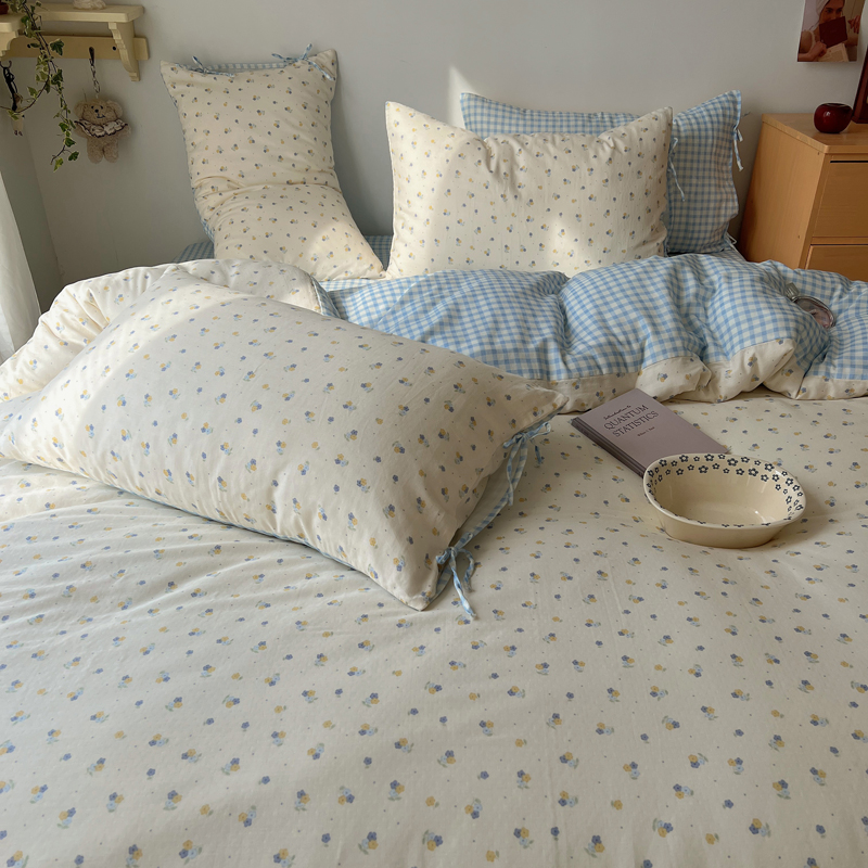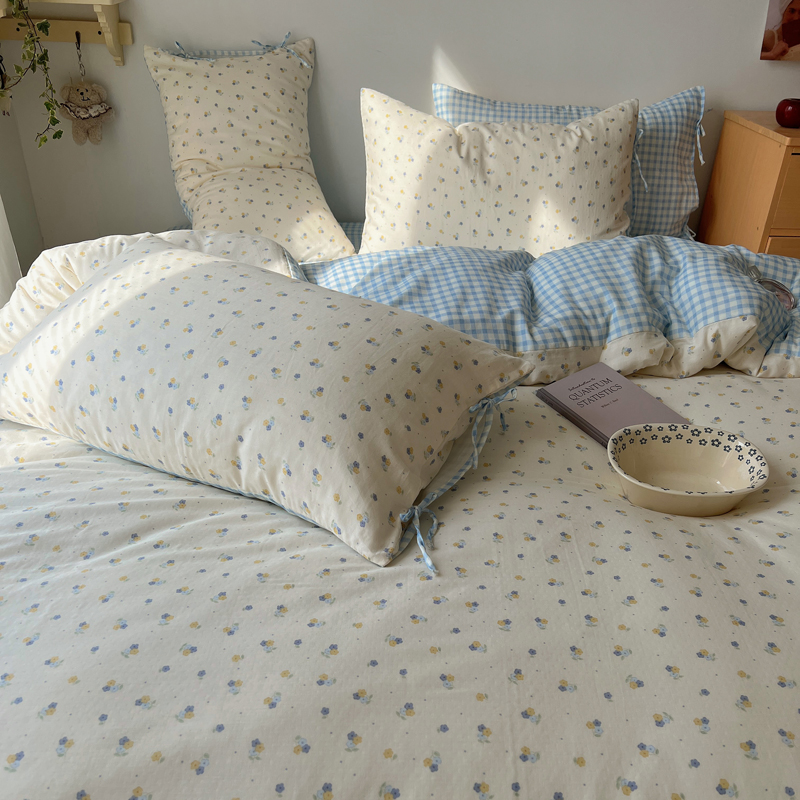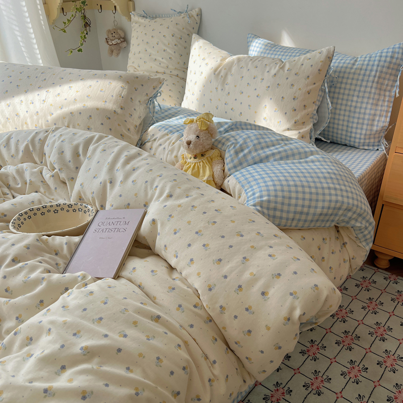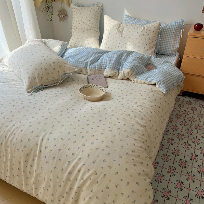 商品名称:桃喜 2025双层纱碎花格子蝴蝶结系列四件套 柚香蓝格
