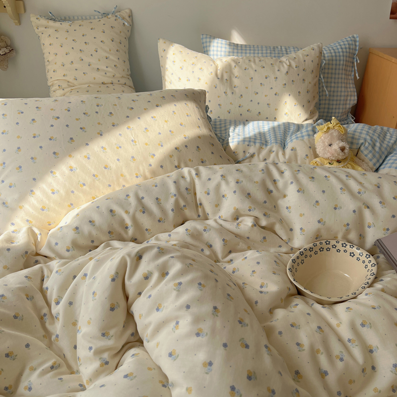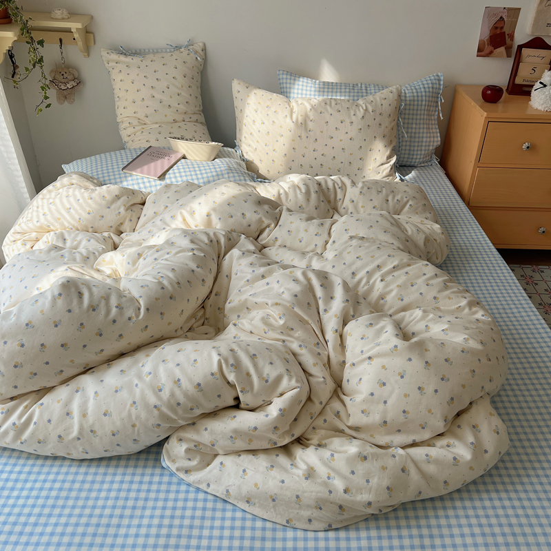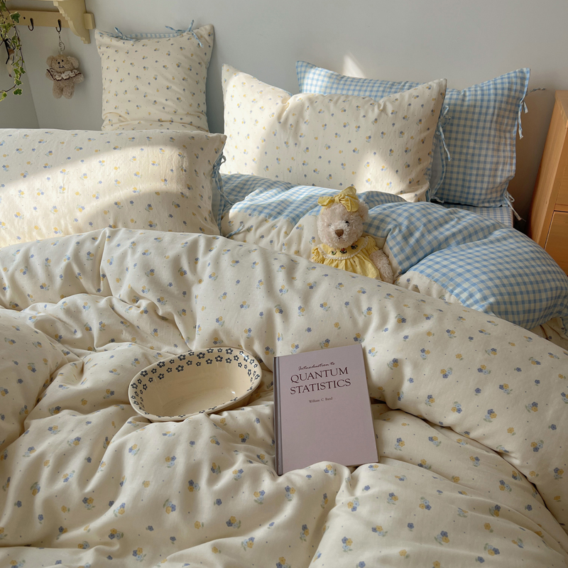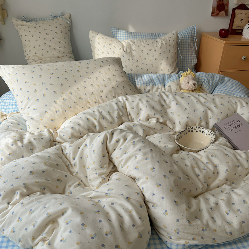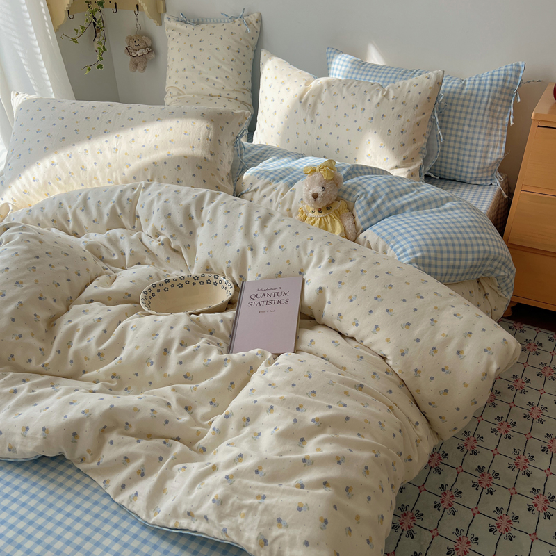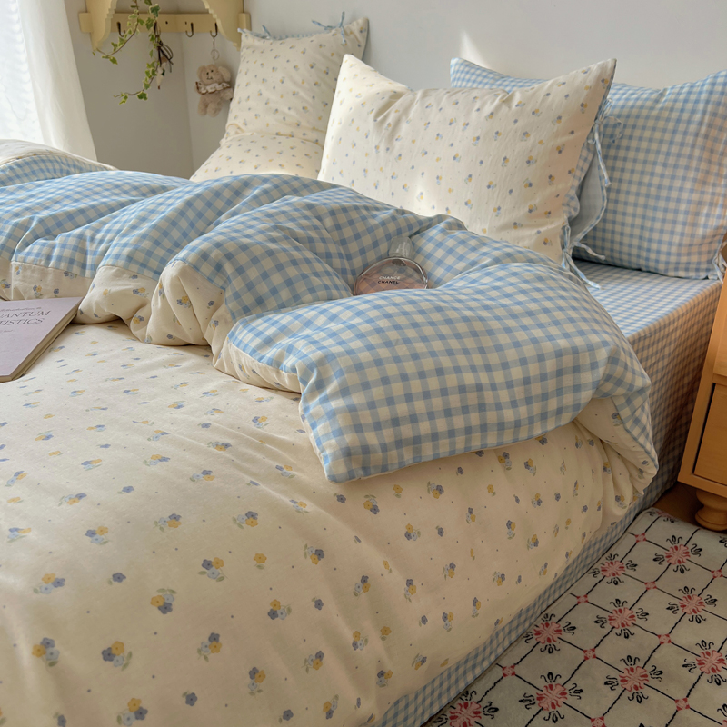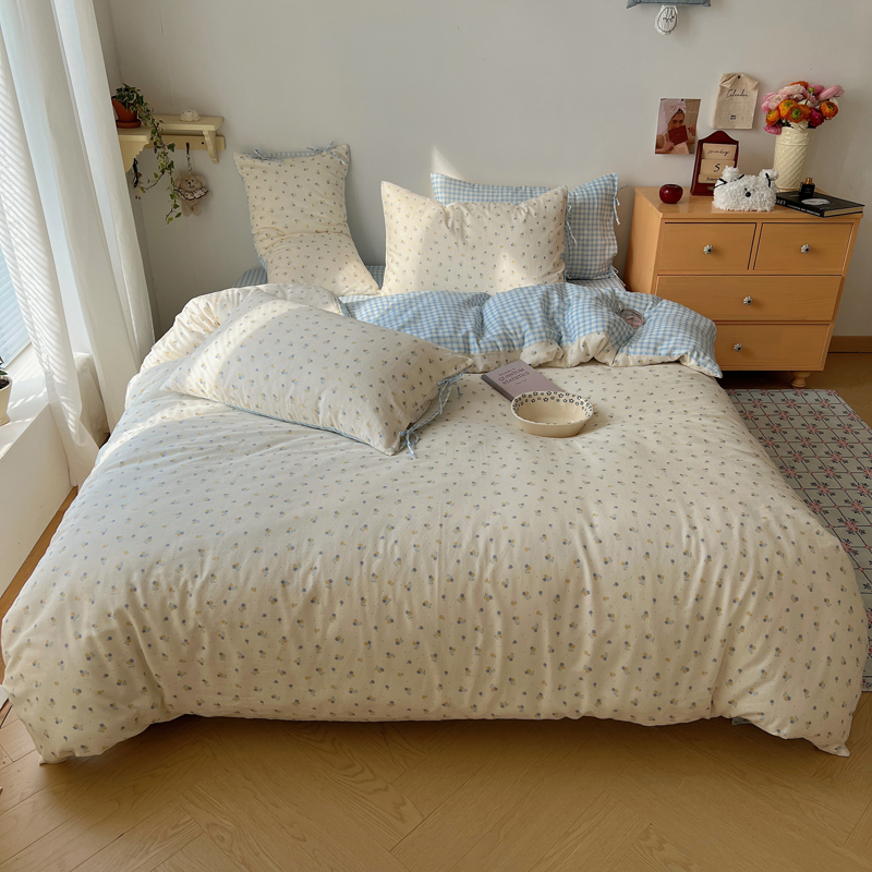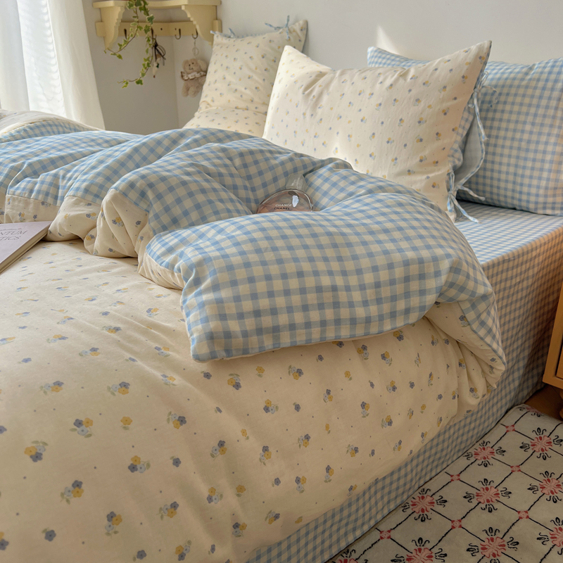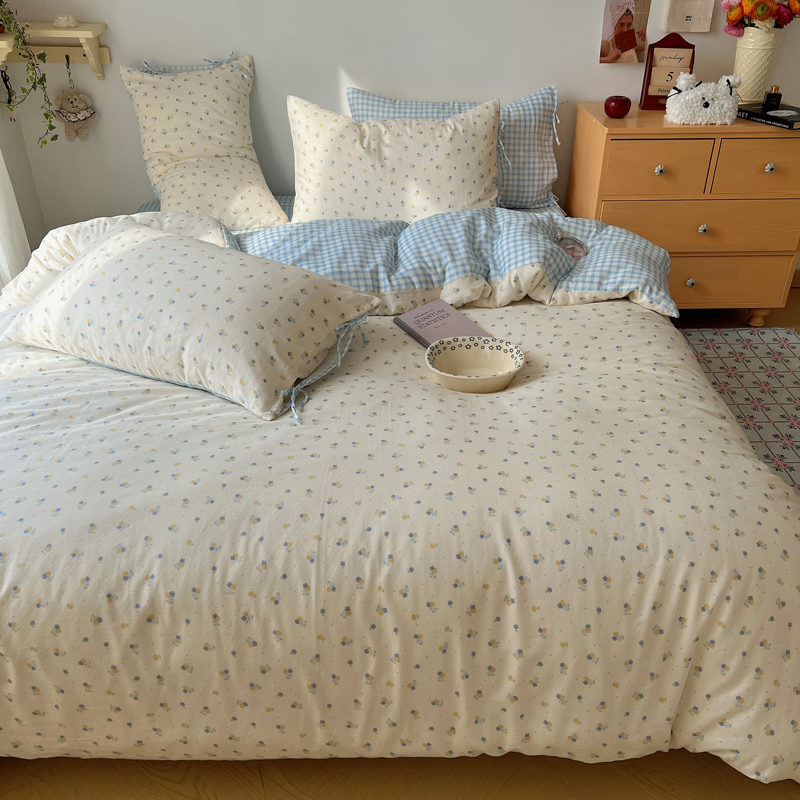 商品名称:桃喜 2025双层纱碎花格子蝴蝶结系列四件套 柚香蓝格