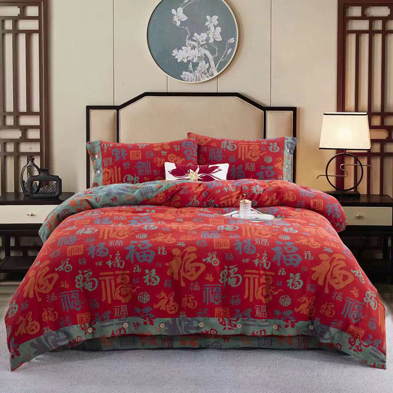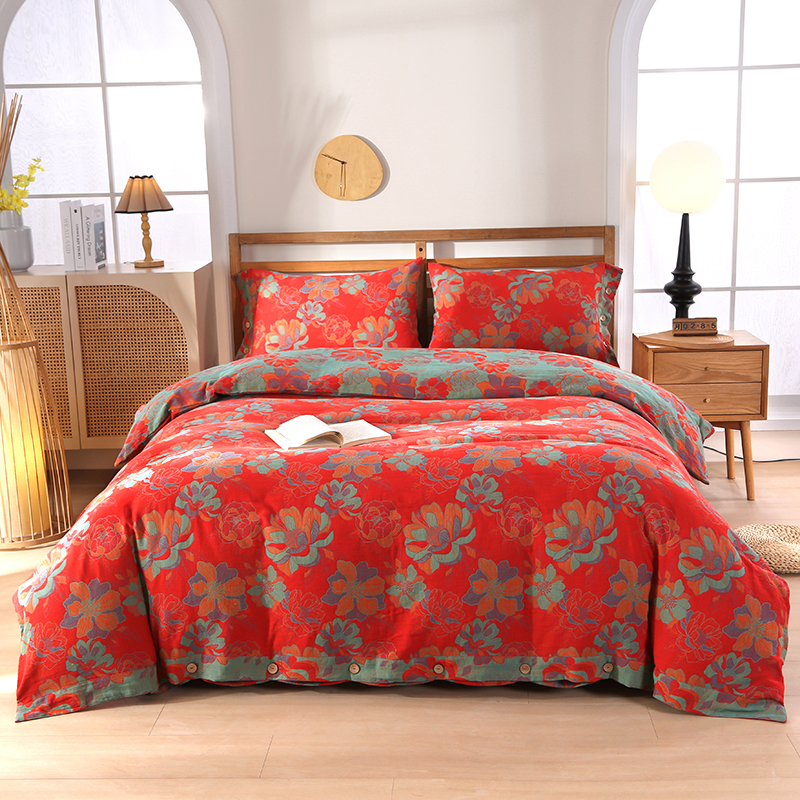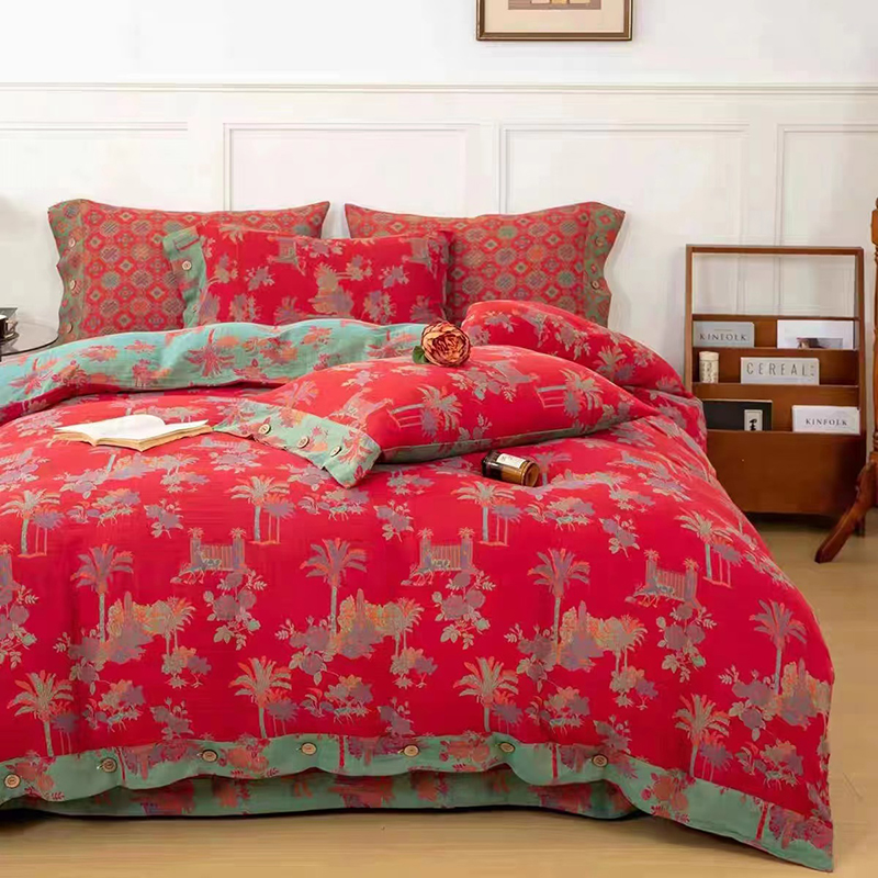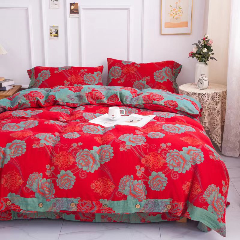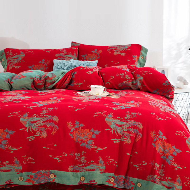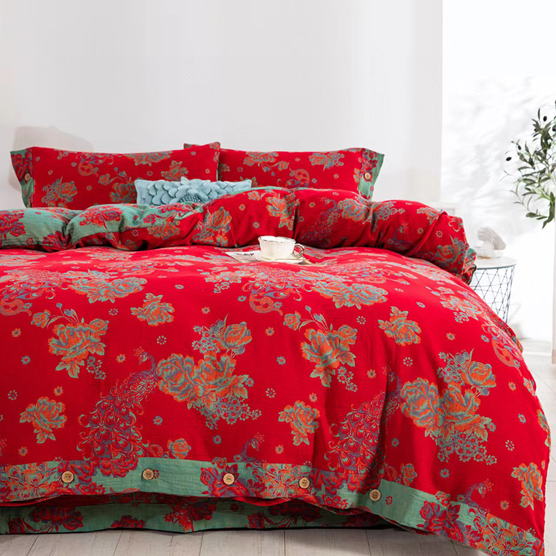 (总)双层纱家居 2026新款全棉纯棉色织提花拼角飞边款四件套-郁金花园正红,郁金花园正红