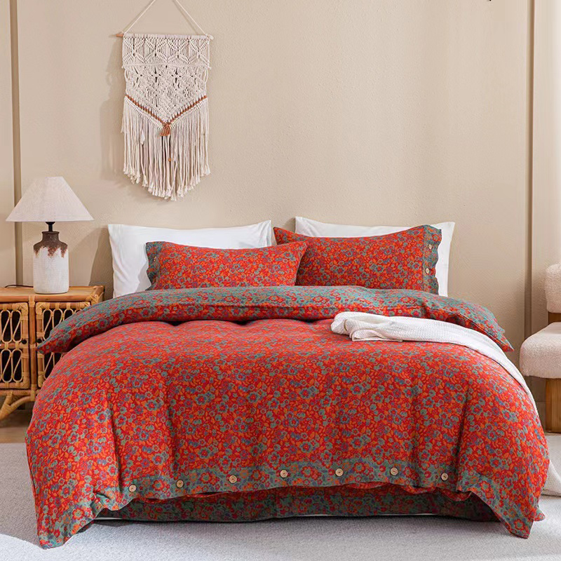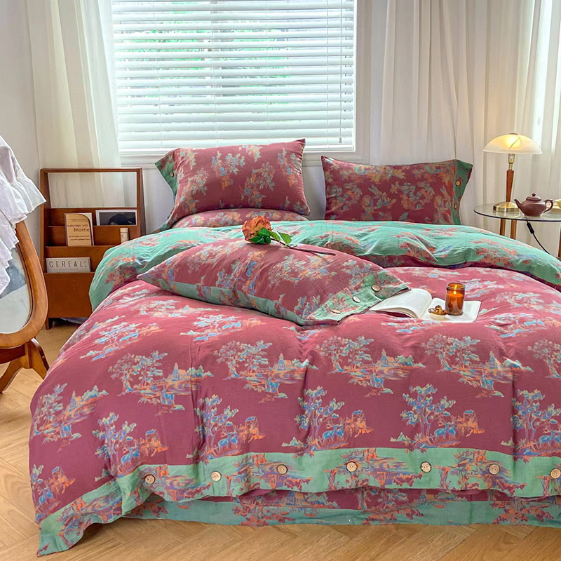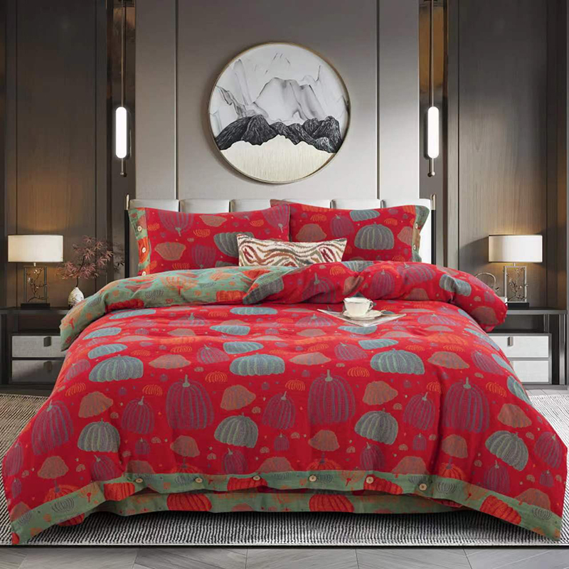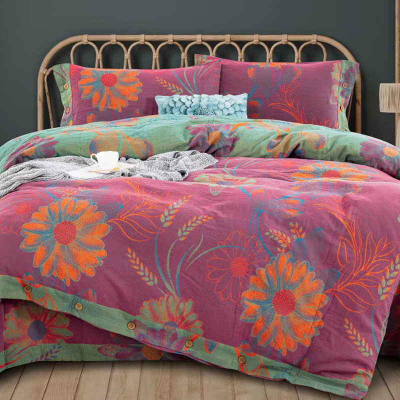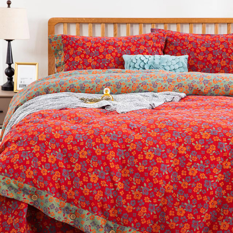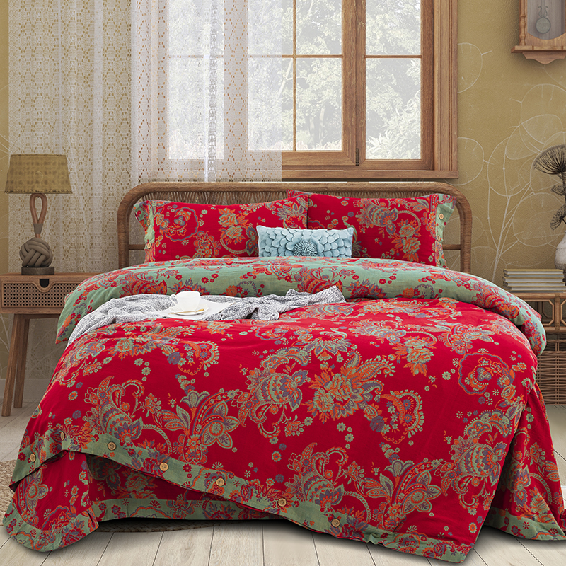(总)双层纱家居 2026新款全棉纯棉色织提花拼角飞边款四件套-郁金花园正红,郁金花园正红