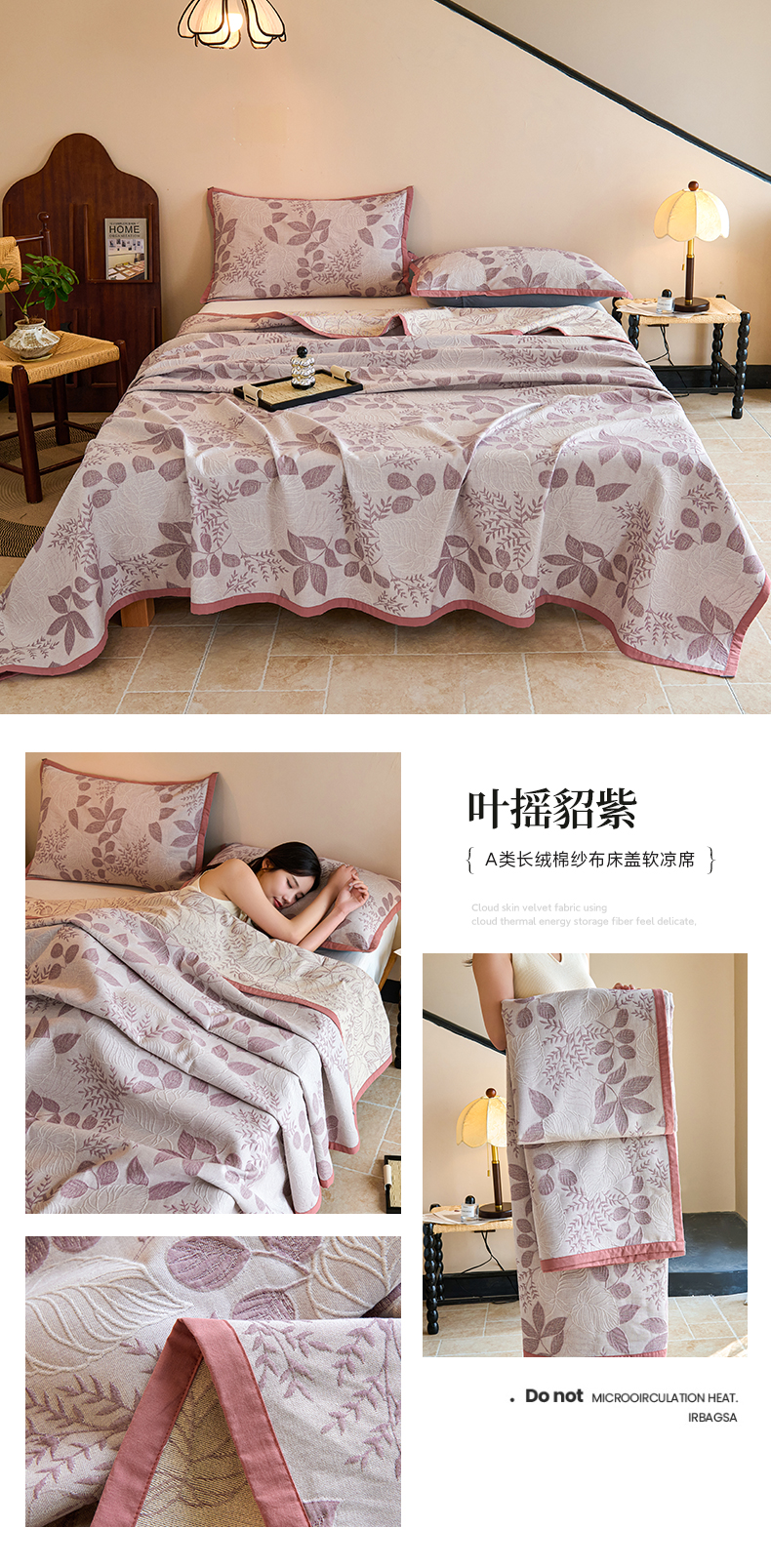 • 91家纺网 家纺一手货源 找家纺 棠薇家纺2025新款全棉纱布床盖软凉席长绒棉纱布毯单毯子三件套 叶摇貂紫