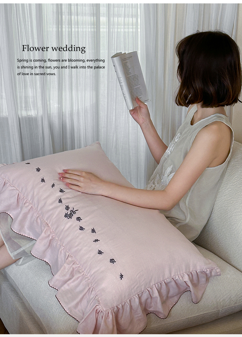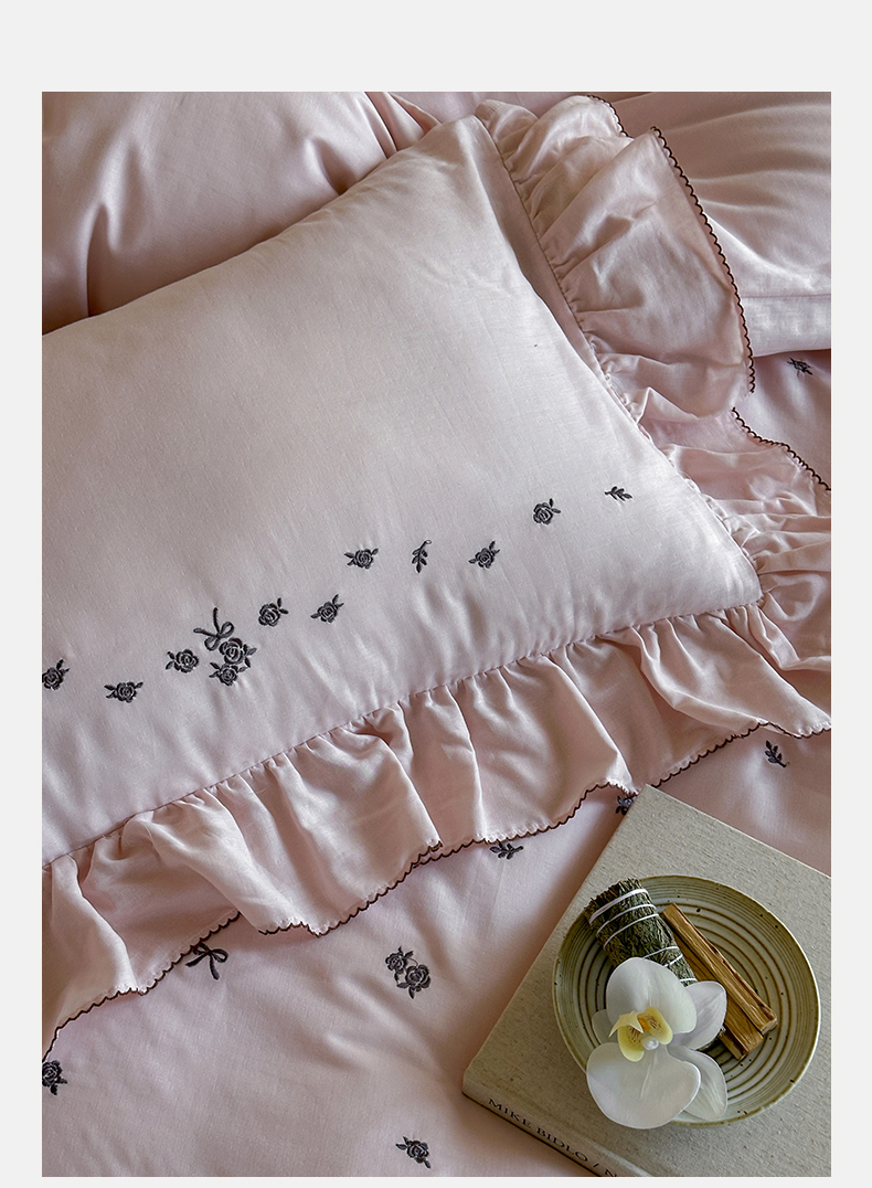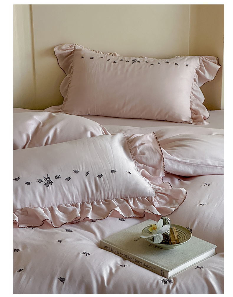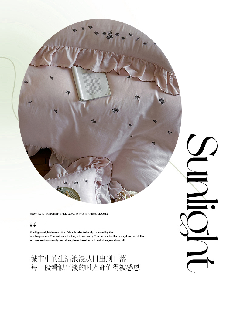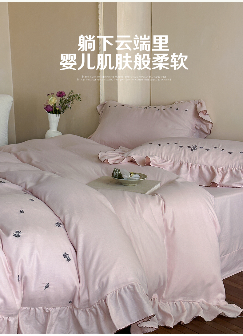 商品名称:名品优仓 2025新款纯棉水洗棉双层纱提花韩版花边四件套 玫瑰故事 玫瑰故事一爱坦粉