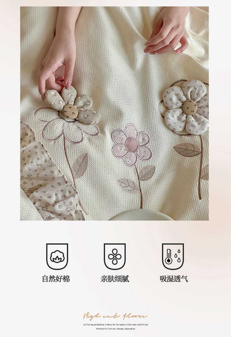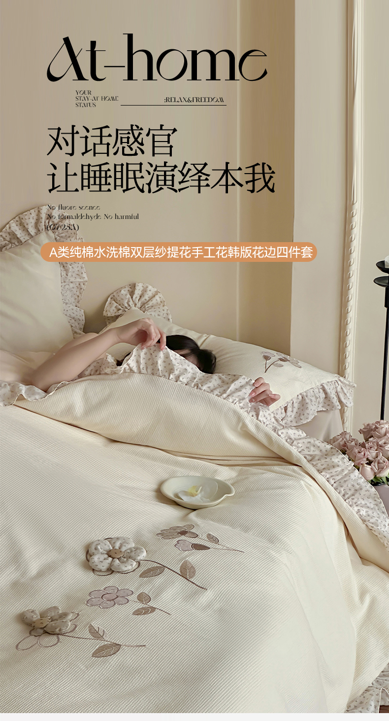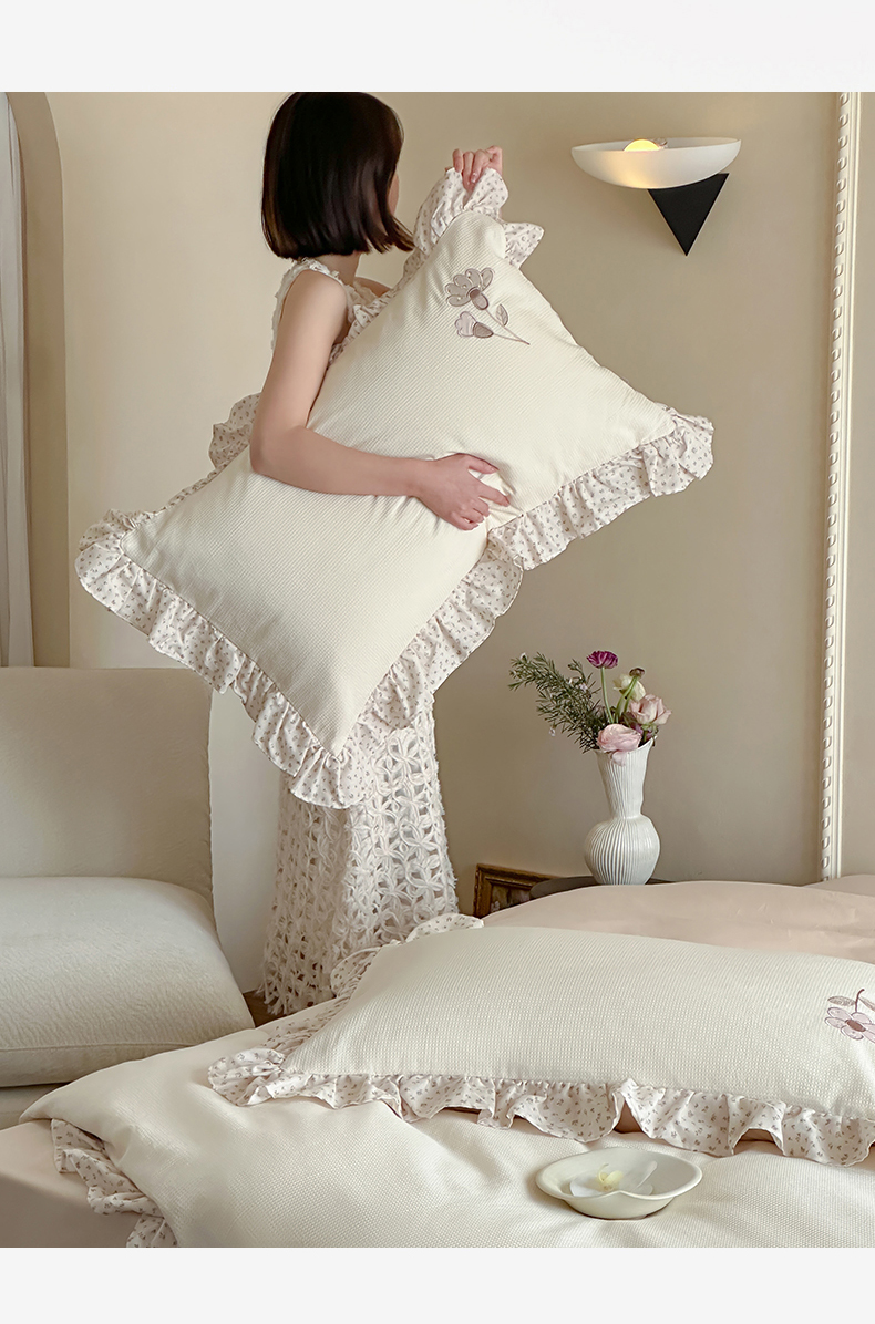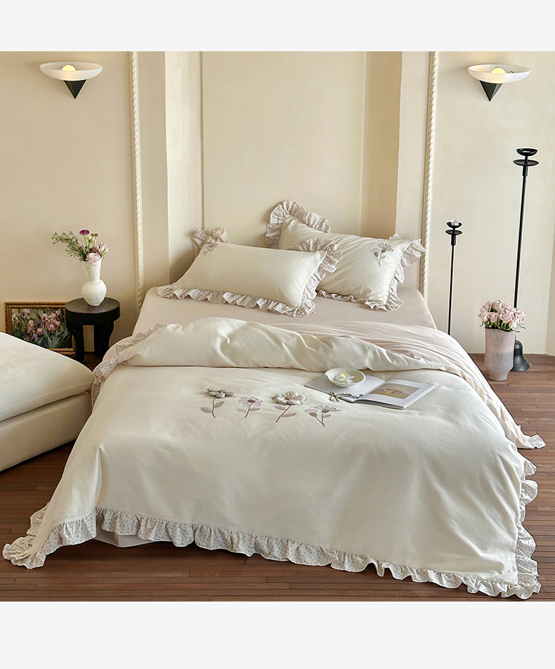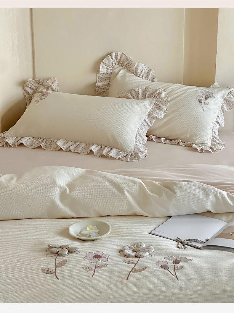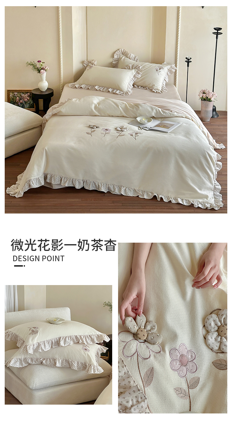 商品名称:名品优仓 2025新款纯棉水洗棉双层纱提花手工花韩版花边四件套 微光花影一奶茶杳
