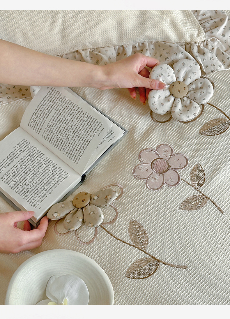 名品优仓 2025新款纯棉水洗棉双层纱提花手工花韩版花边四件套 微光花影一奶茶杳