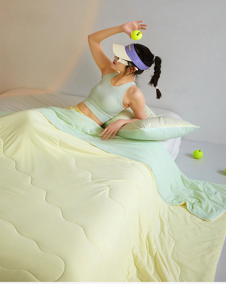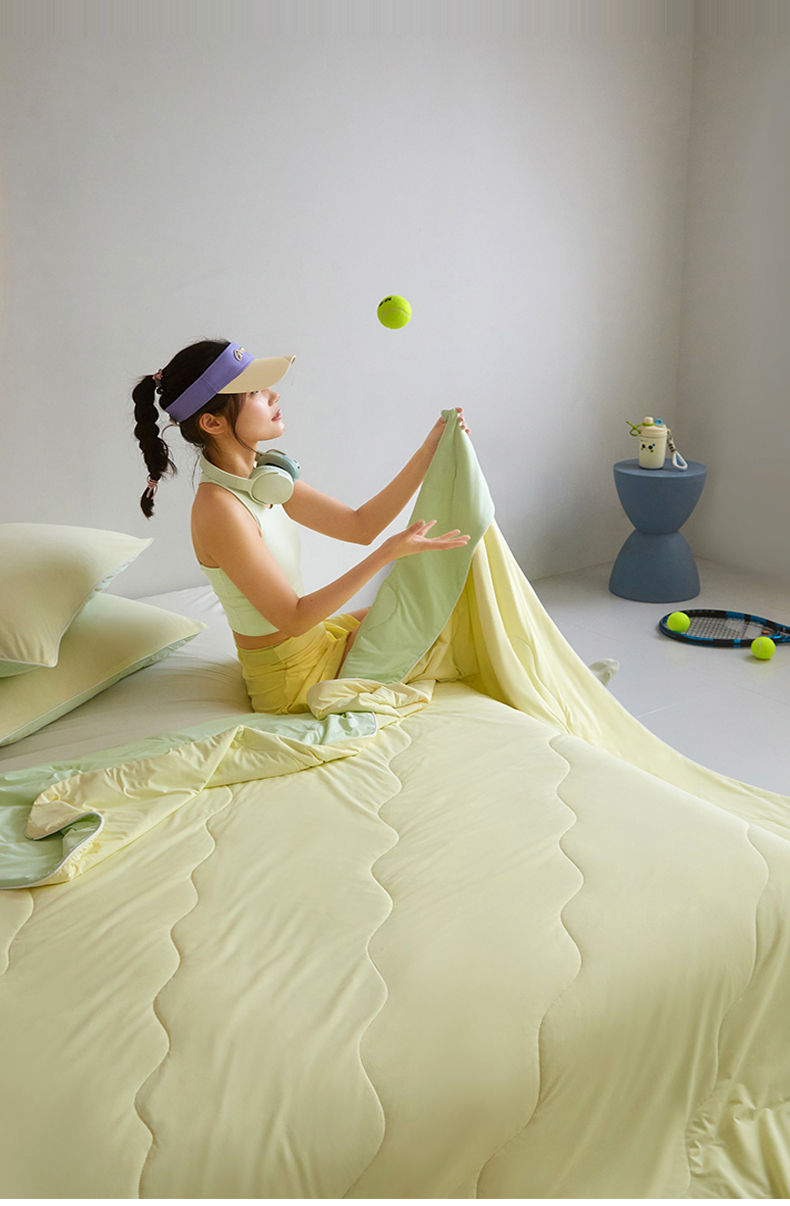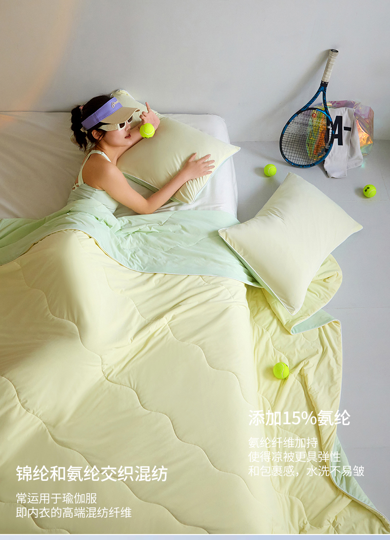 被子 > 夏被 > 头等舱 2025新款4.0版凉感A类锦氨(165克)55大豆抗菌夏凉被夏被配礼盒模特图 米黄拼浅绿