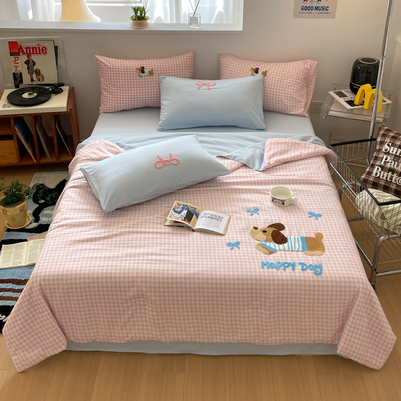 红嘴企鹅2025新款毛巾绣空调被四件套 夏被-蓝格狗狗