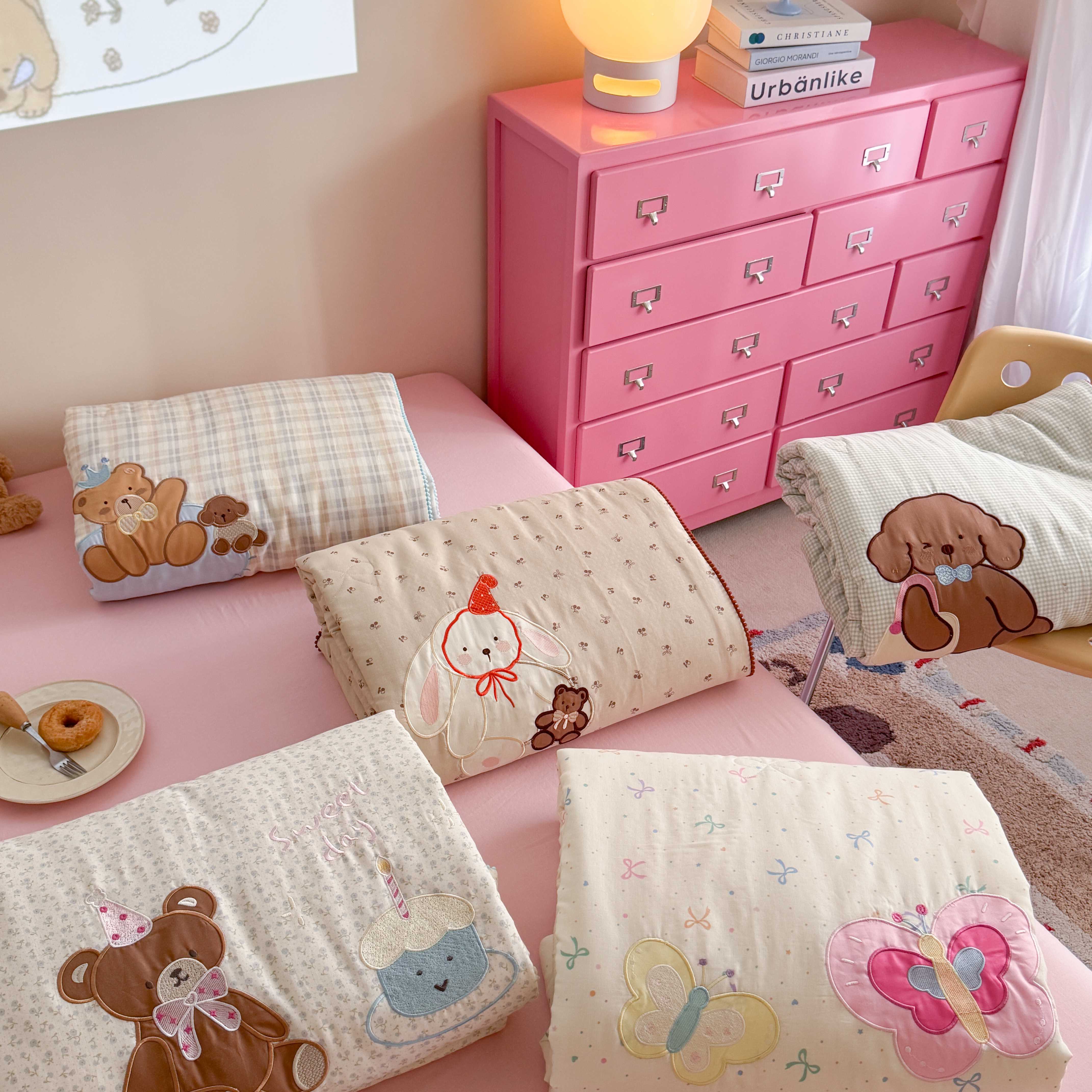 (总)觅糖家纺 2025新款色织水洗提花小波点贴布系列四件套,sweet兔,滑板小狮子,可爱松鼠,奶油比熊,小熊的故事,小羊驼