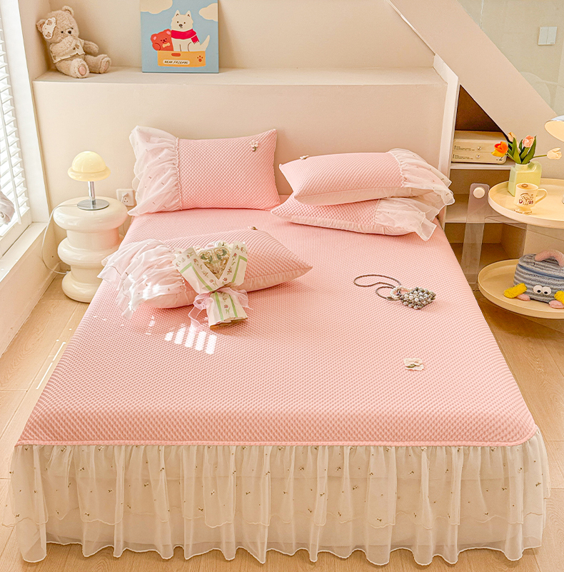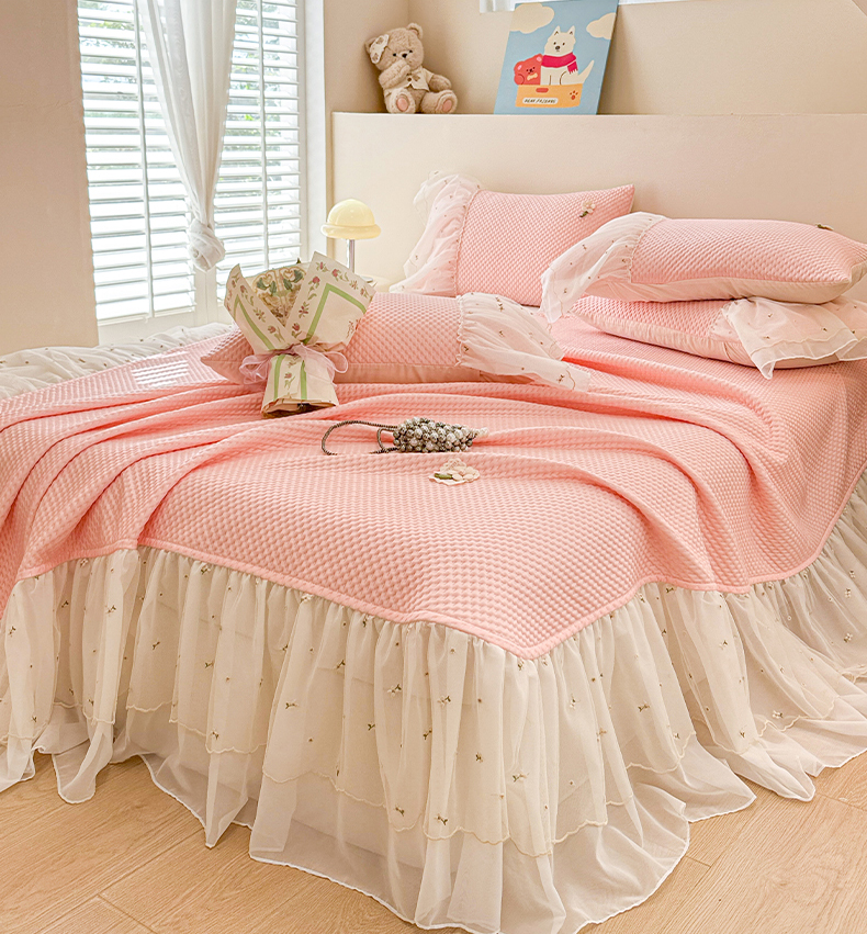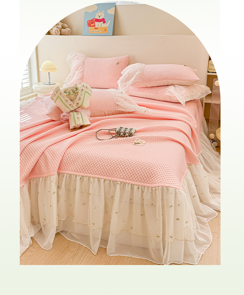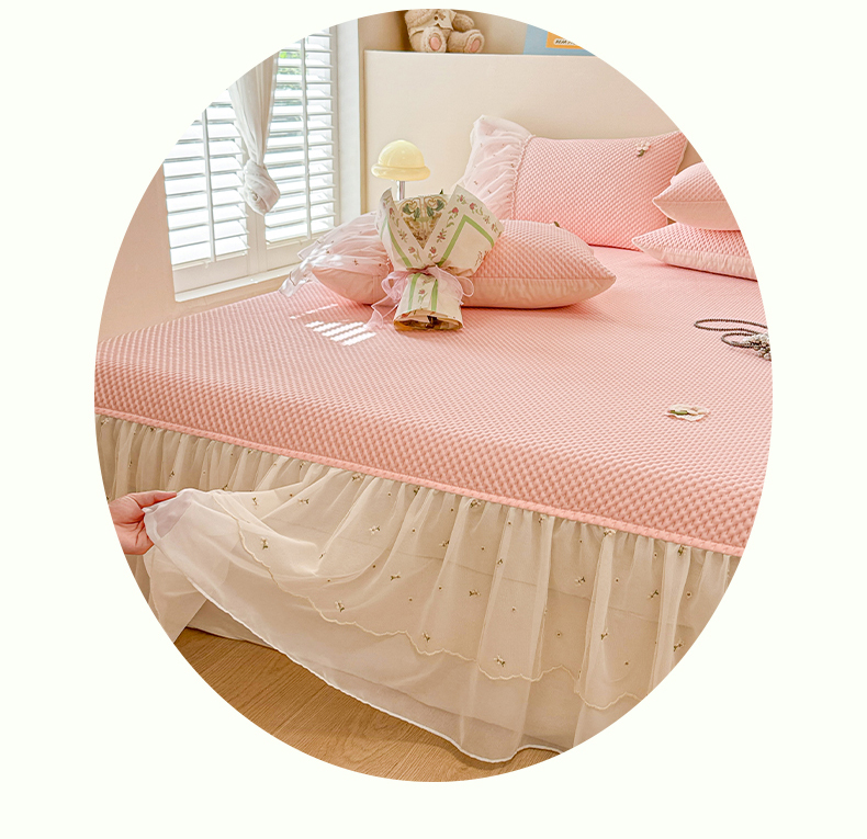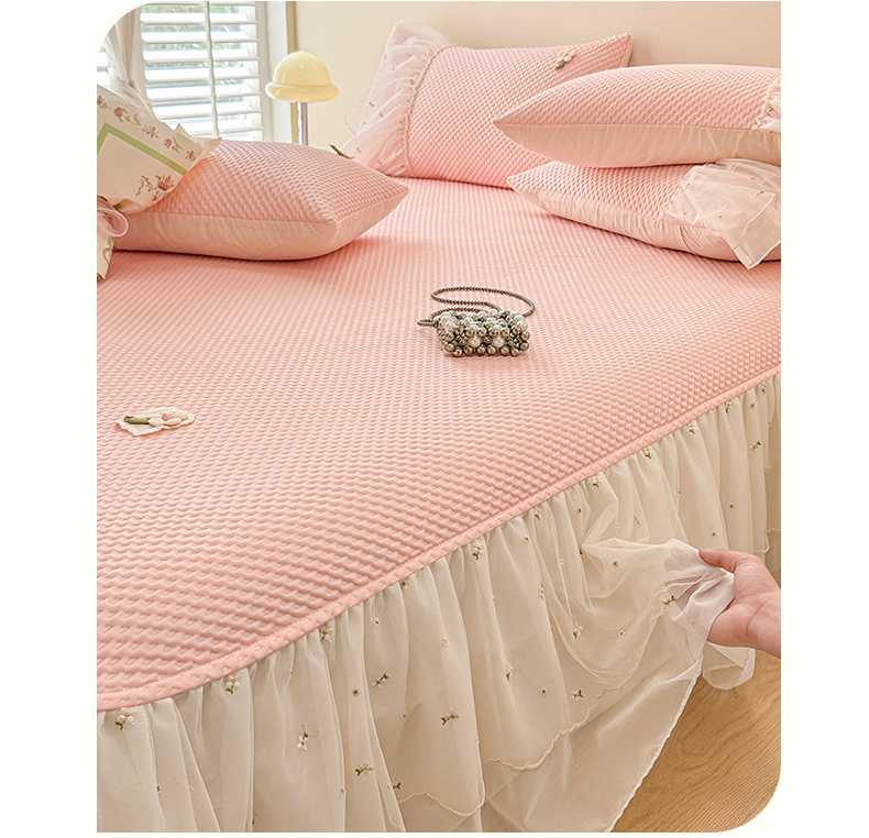 蓝邻家纺 2025春夏新款PE提花雪纺+绣花花边凉席席子 夏花-粉