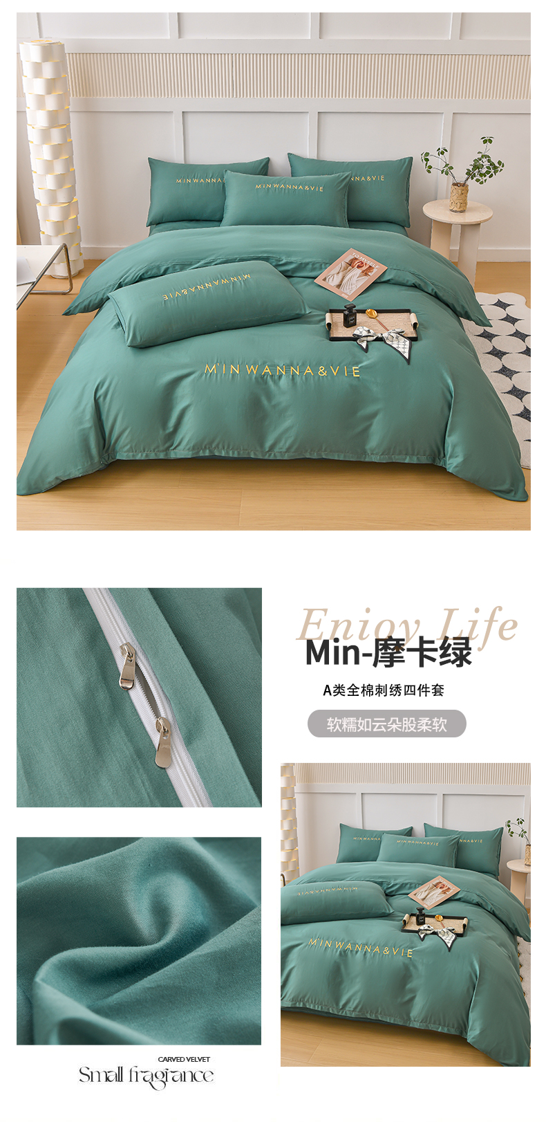当前位置: 91家纺网 > 商品网购 > 床品套件 > 四件套 > 全棉普通四件套 > 宇彬家纺 2025新款直播热款13374全棉母婴级绣花字母款被套床单纯色重工清新四件套贡缎新疆长绒 Min-摩卡绿