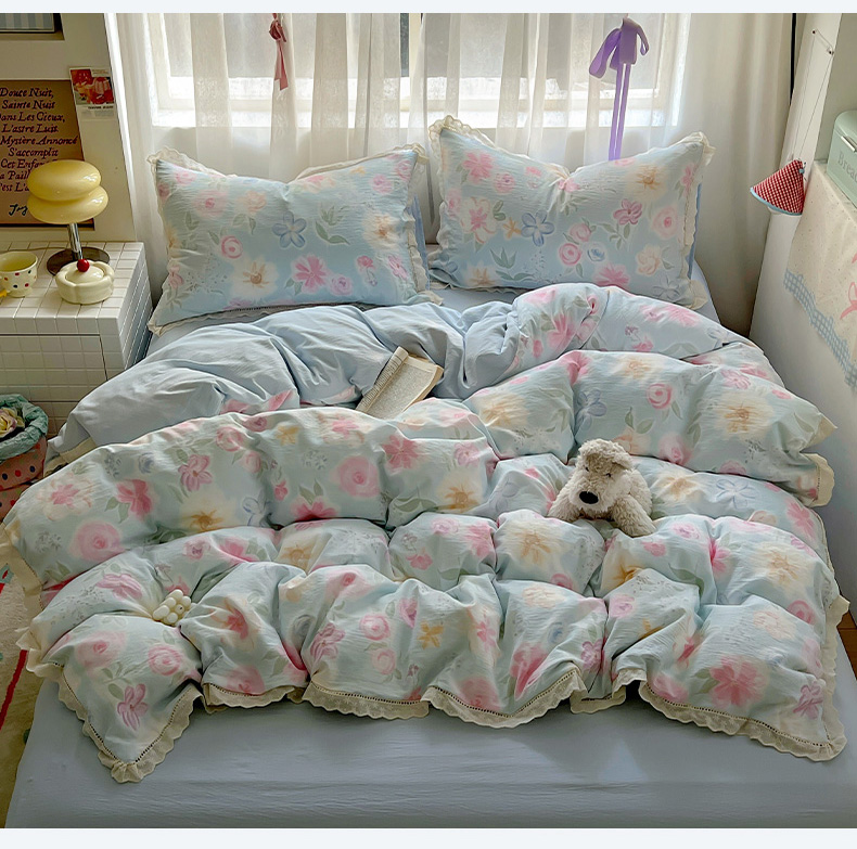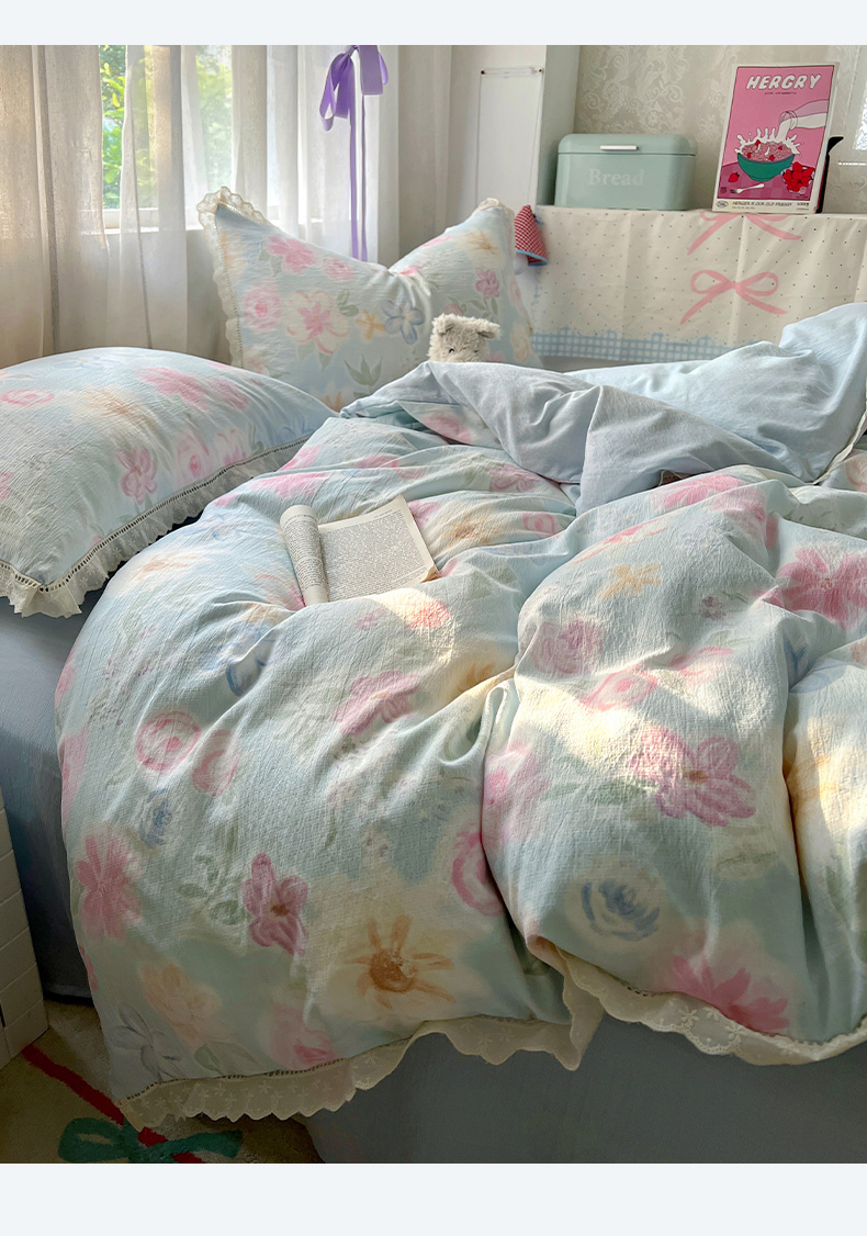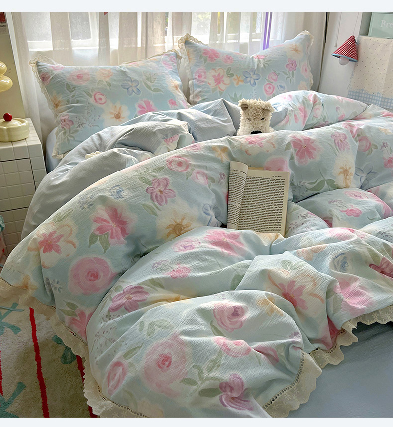 当前位置: 91家纺网 > 商品网购 > 床品套件 > 四件套 > 双层纱四件套 > 罗亿家纺 2025新款云感双层纱全棉镂空花边四件套(提供买家秀) 春风花颜-绿