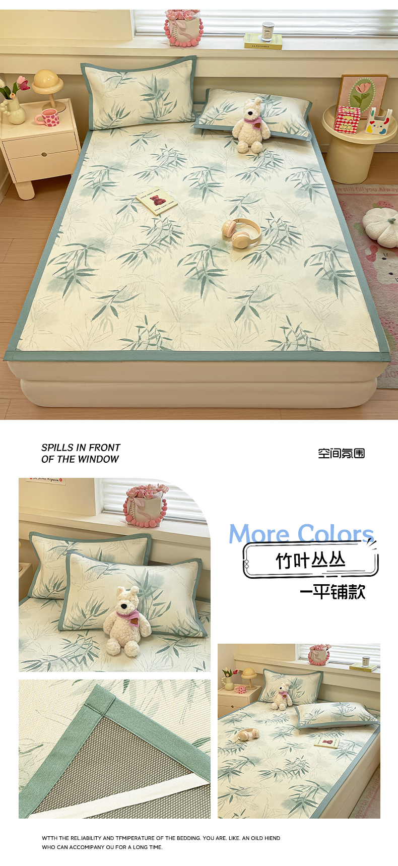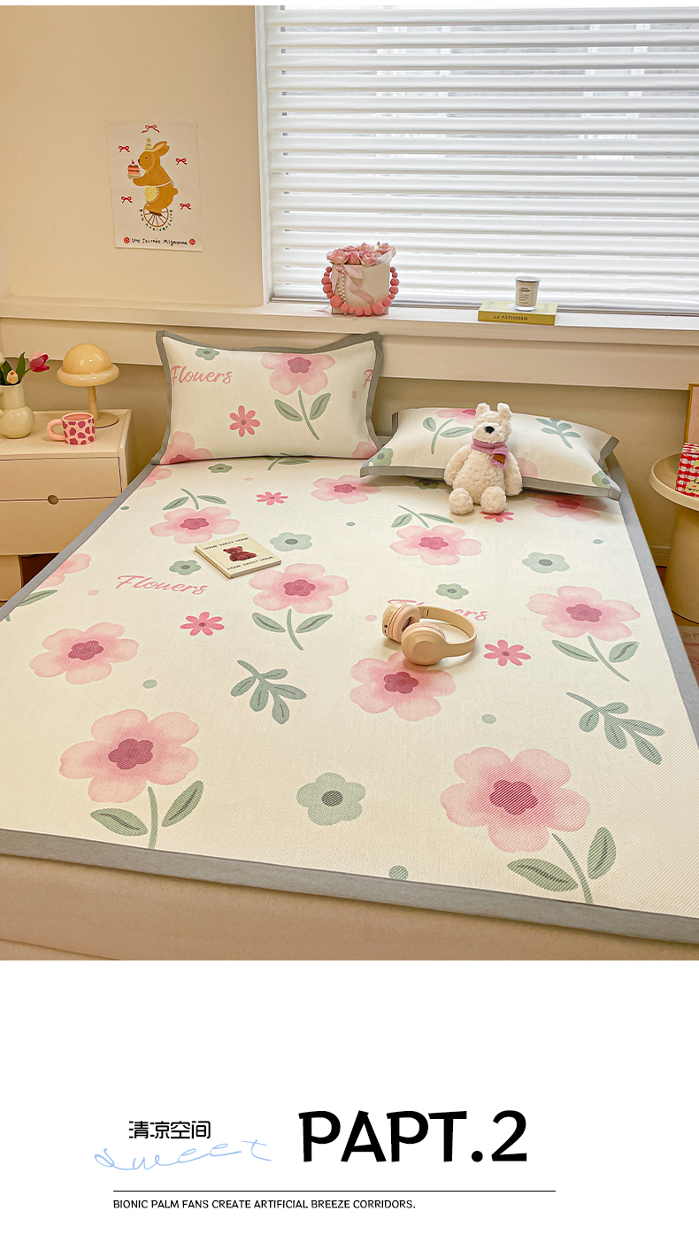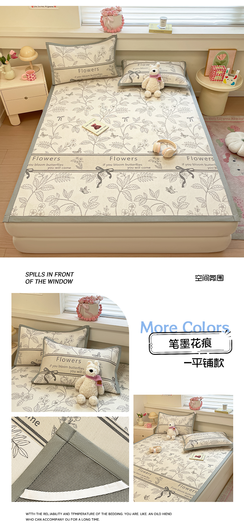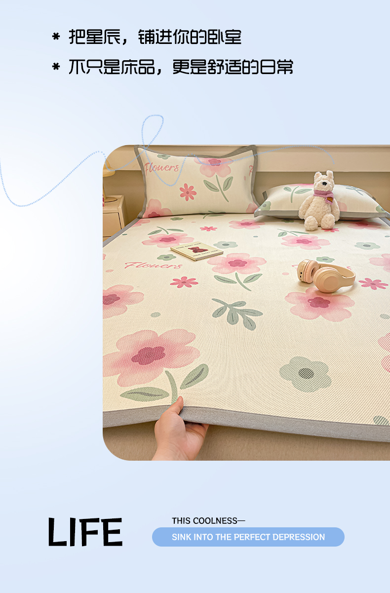 商品名称:逸尚阁 2025春夏新款数码印花冰藤席空调席三件套 诗集花市-平铺款