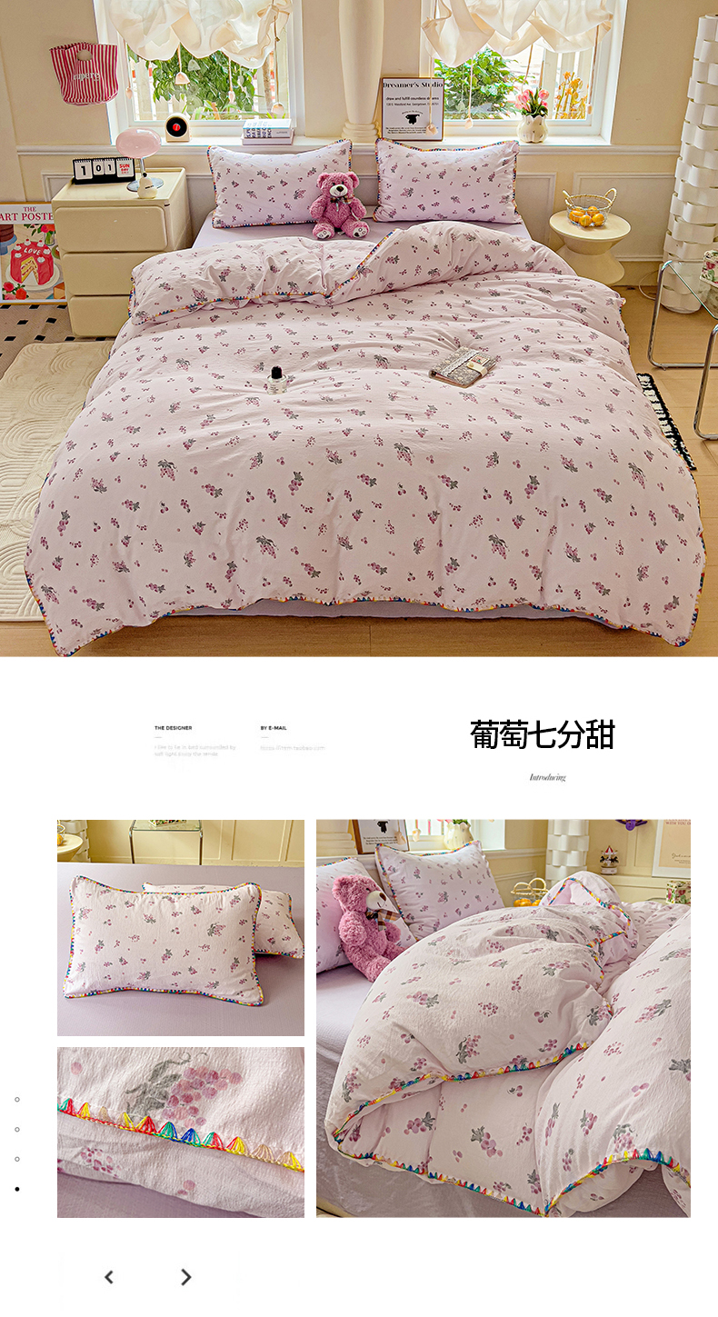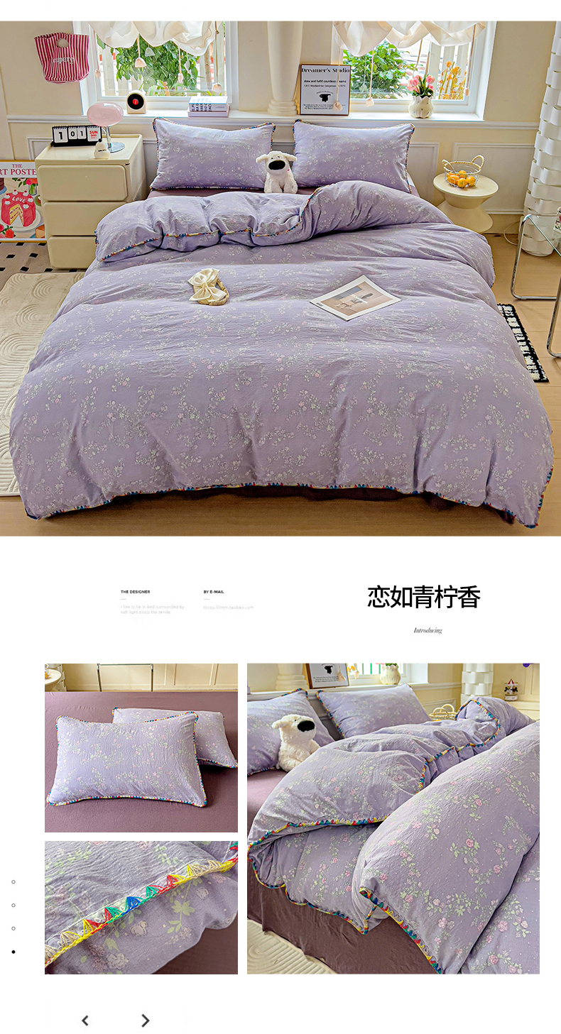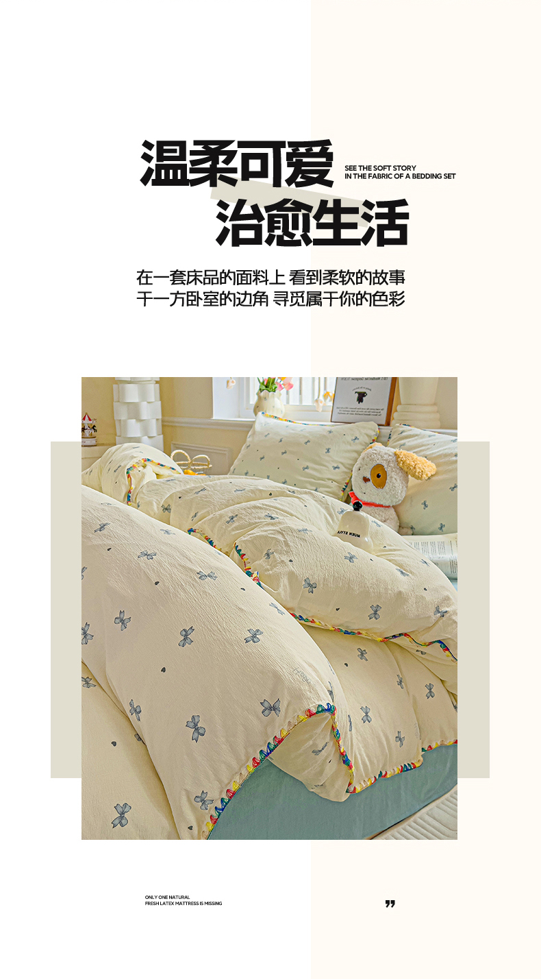 当前位置: 91家纺网 > 商品网购 > 床品套件 > 四件套 > 双层纱四件套 > Mata蔓塔家 2025春夏新款云感针织双层纱彩色贝壳边四件套 海像森林