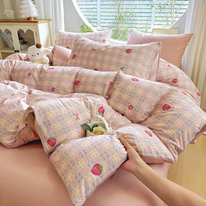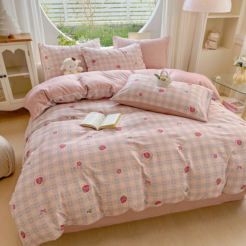 壹号库家纺 2025新款云感木绵皱皱双层纱四件套-简单款 草莓方糖