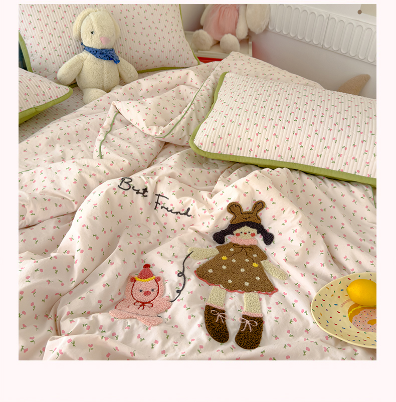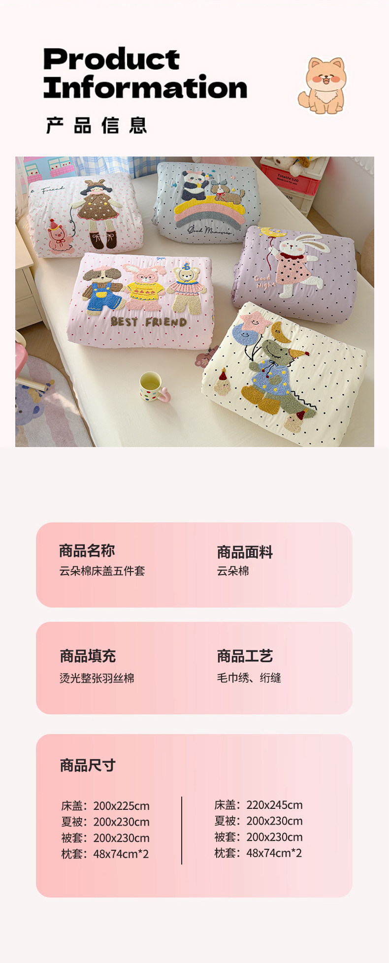 (总)赫梵茜 2025新款云朵棉毛巾绣床盖夏被被套四件套,小女孩,好朋友,恐龙,熊猫,月亮兔子,组合图仅做展示