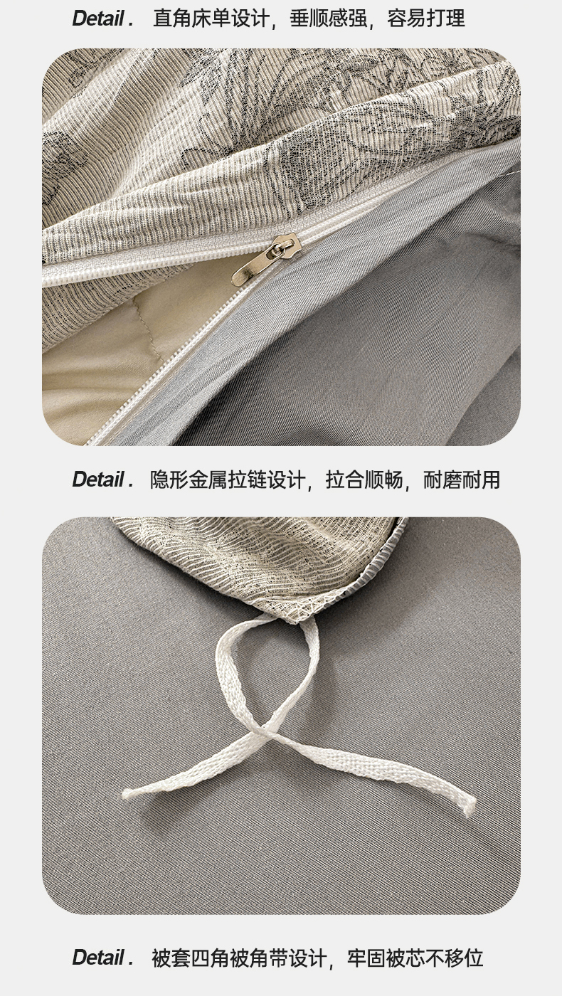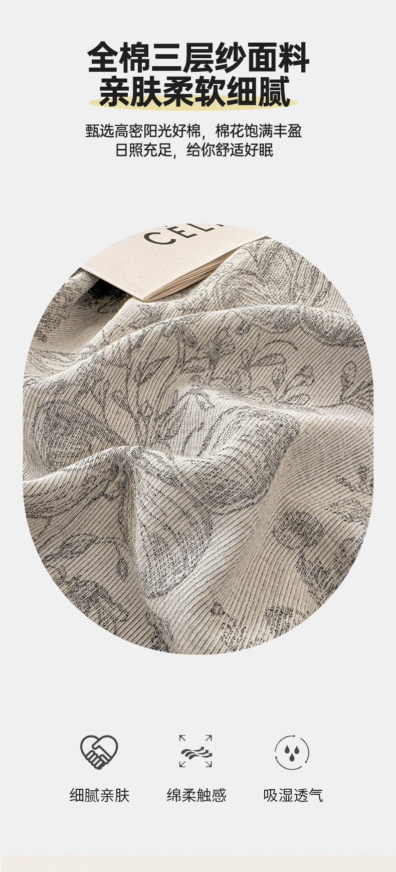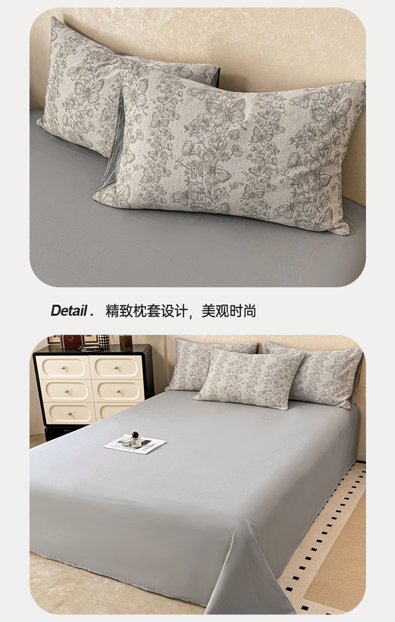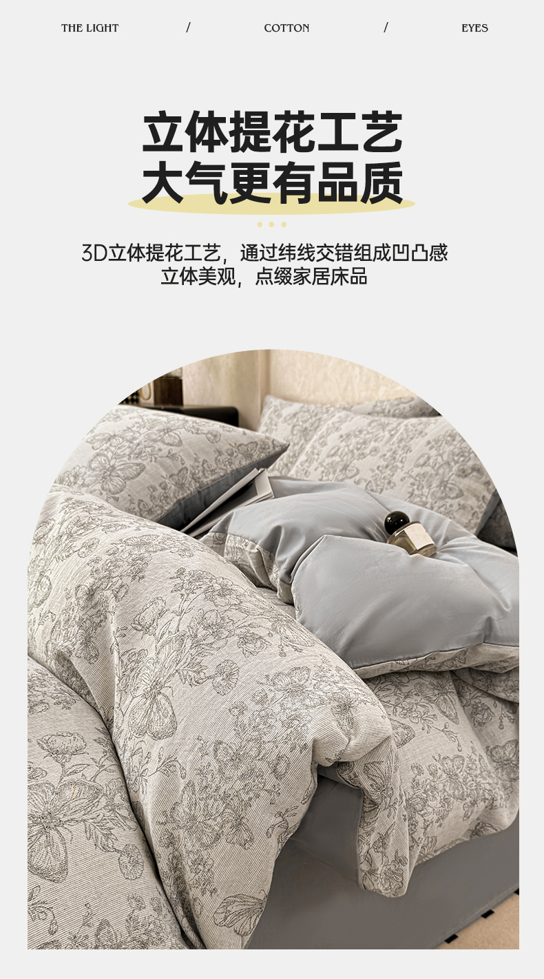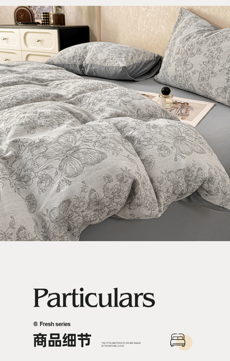 当前位置: 91家纺网 > 商品网购 > 床品套件 > 四件套 > 色织四件套 > 灰鲸2025新款A类全棉三层纱色织提花系列四件套 蝶飞-灰