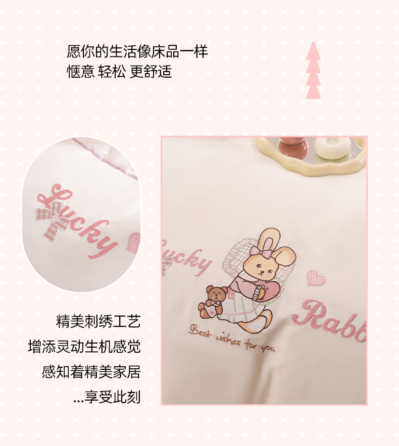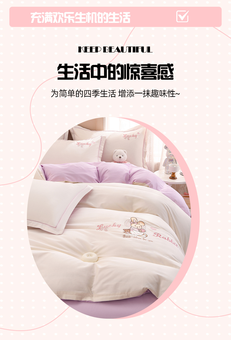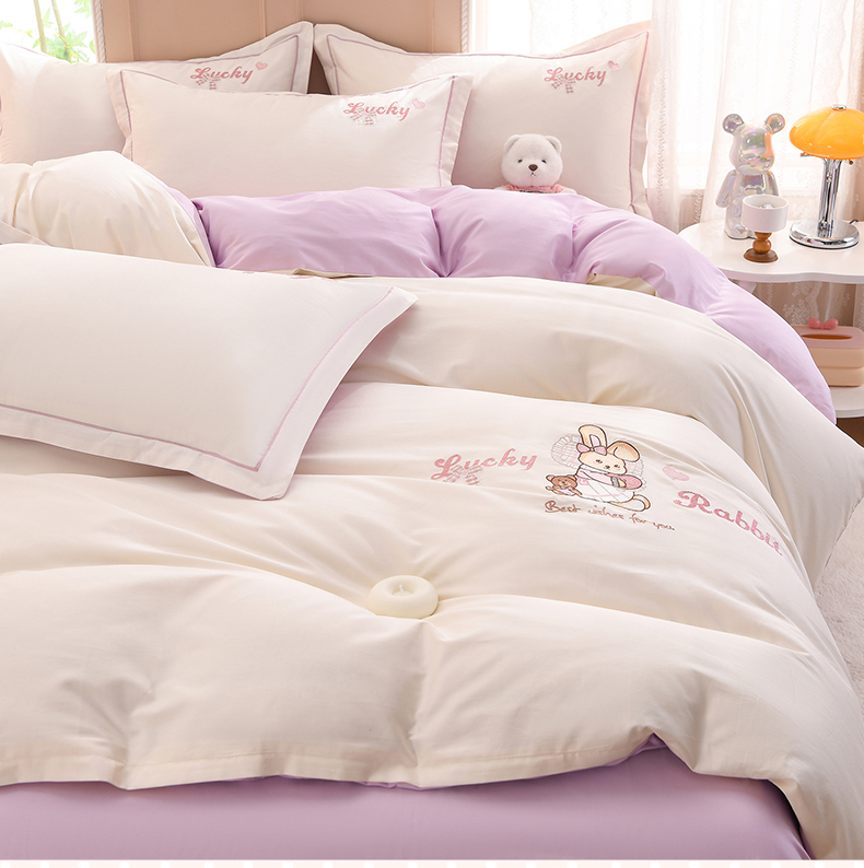 商品名称:登登家纺 2025新款A类长绒棉刺绣四件套-卡通 兔熊-白紫