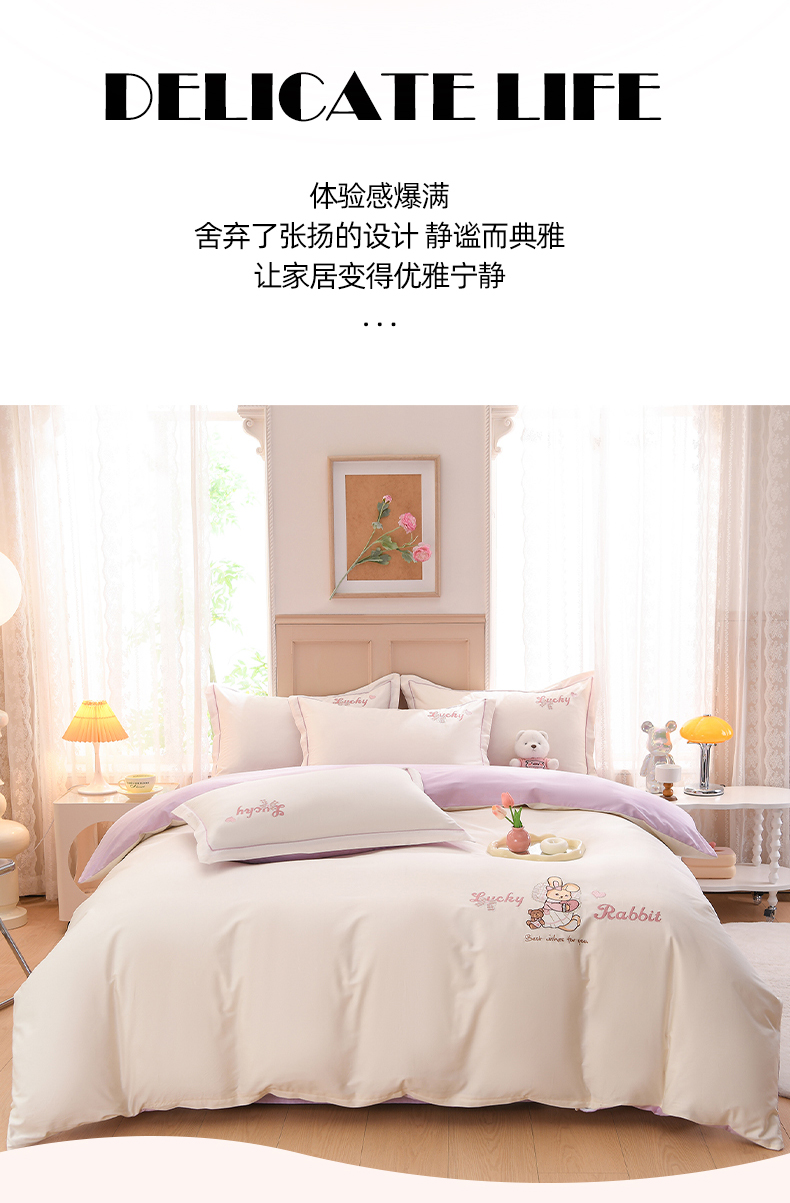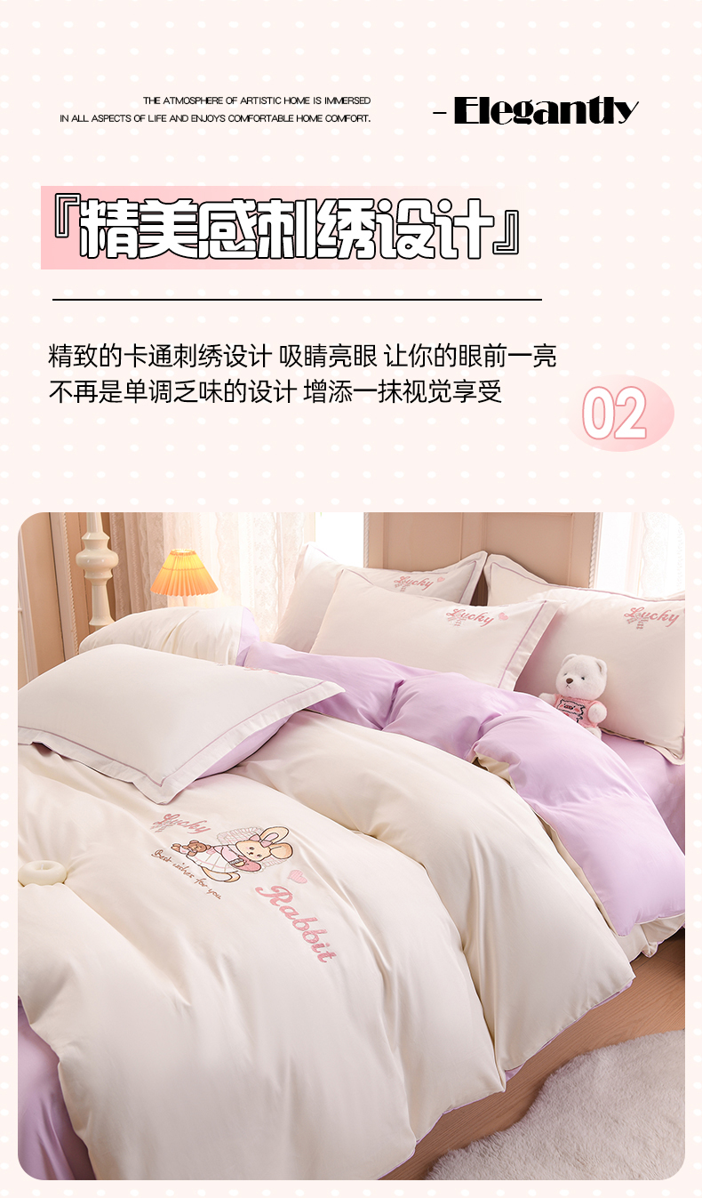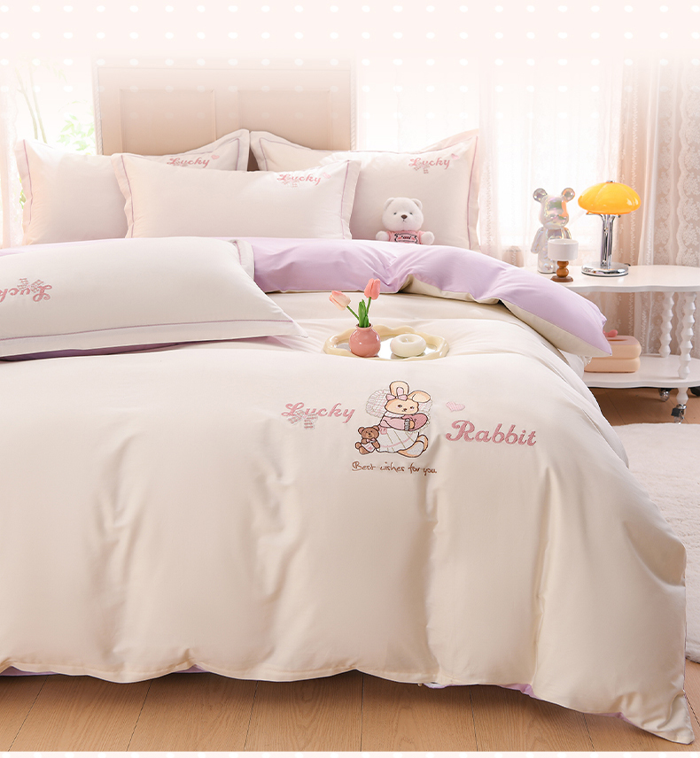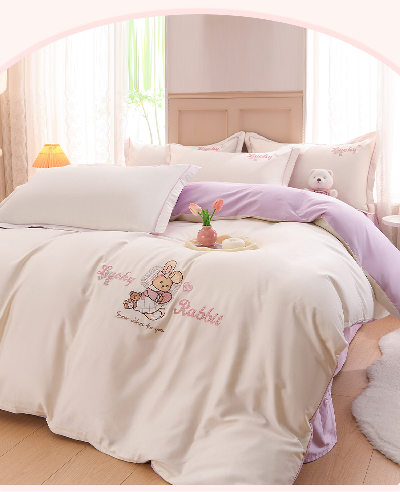 登登家纺 2025新款A类长绒棉刺绣四件套-卡通 兔熊-白紫