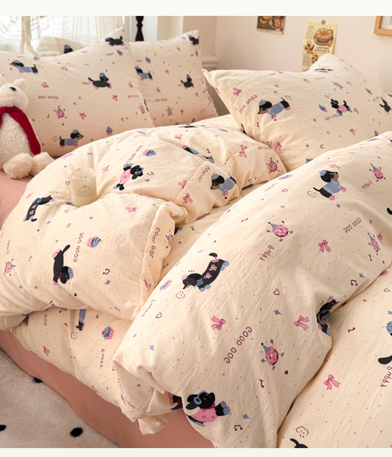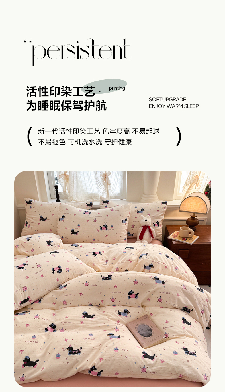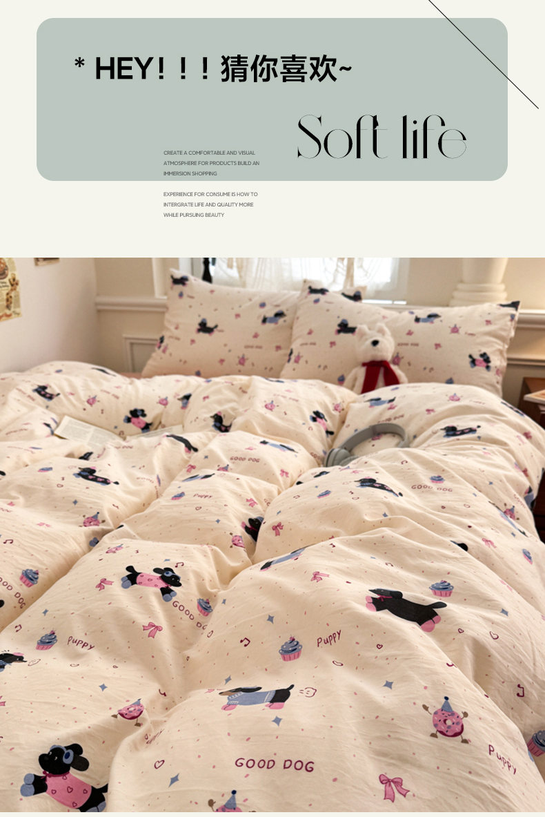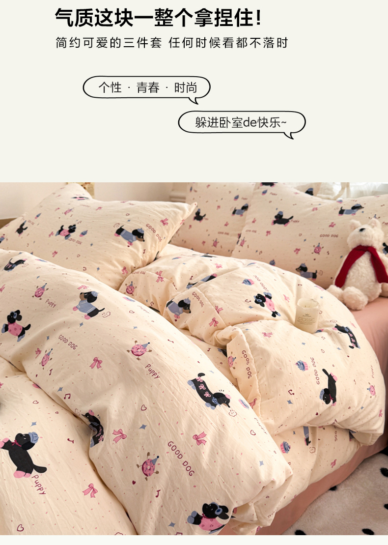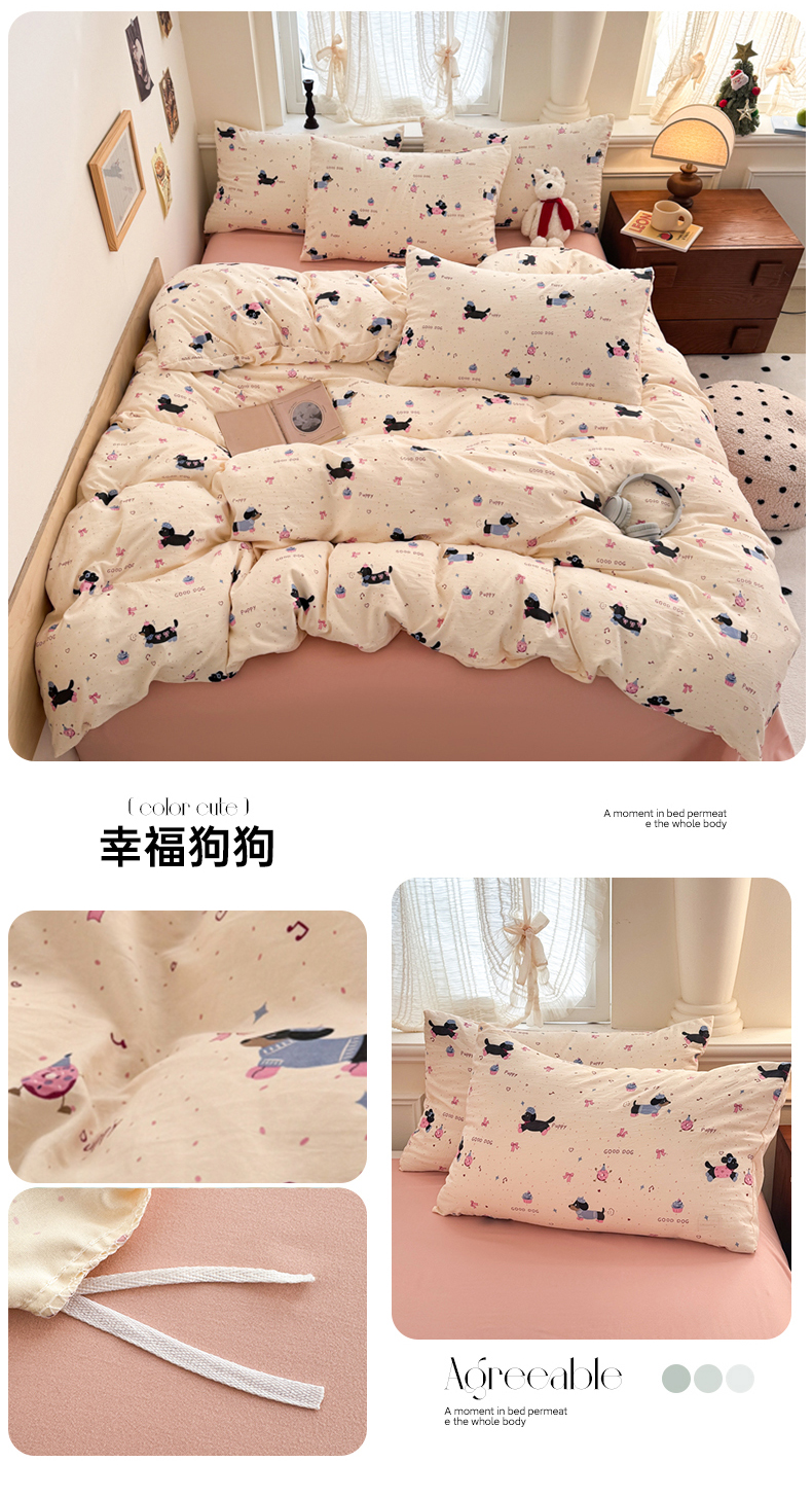 当前位置: 91家纺网 > 商品网购 > 床品套件 > 四件套 > 水洗棉四件套 > 晚爱家纺(原晚安家居) 2025新款超柔水洗棉四件套卡通小清新学生宿舍三件套 幸福狗狗