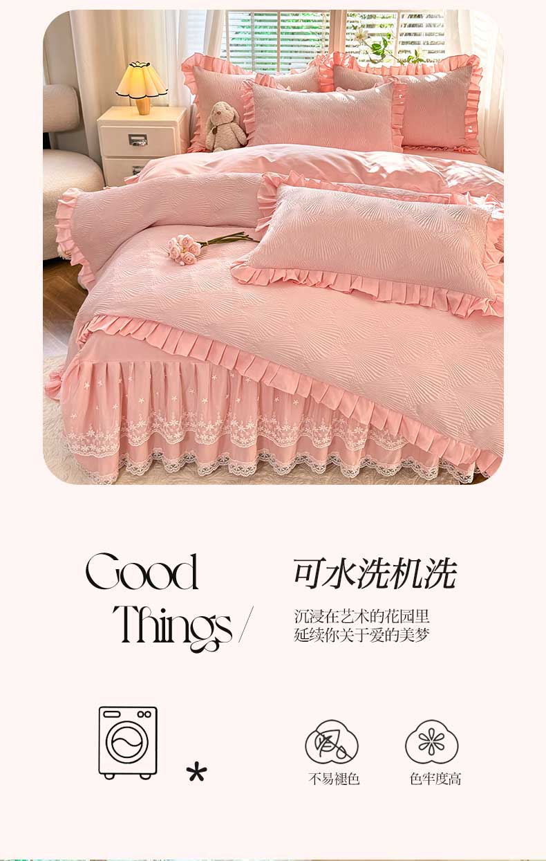 (总)唐人居 2026新款水洗棉花边床盖四件套-花影系列,花影-浅紫,花影-豆沙,花影-玫红,花影-暖橘,花影-苹果绿,花影-浅粉,花影-浅灰