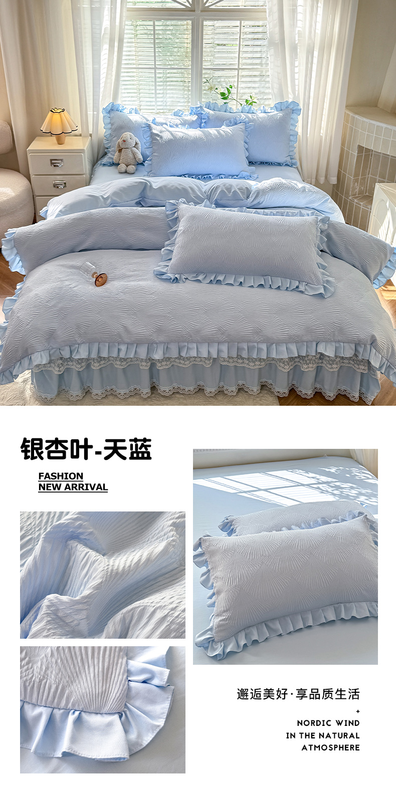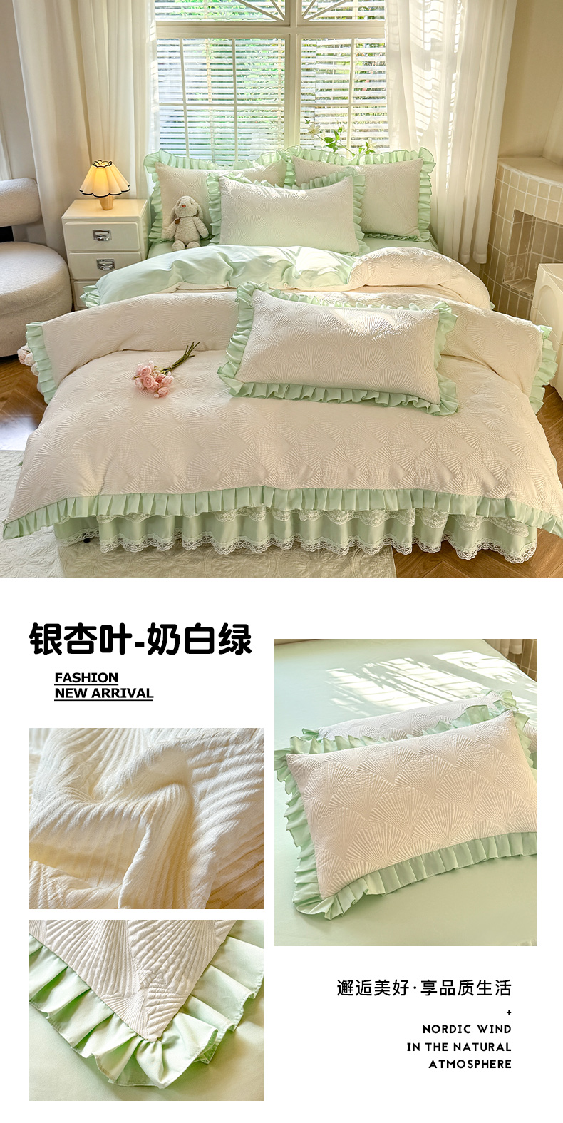 商品名称:(总)唐人居 2025新款泡泡纱提花花边床裙四件套-银杏叶