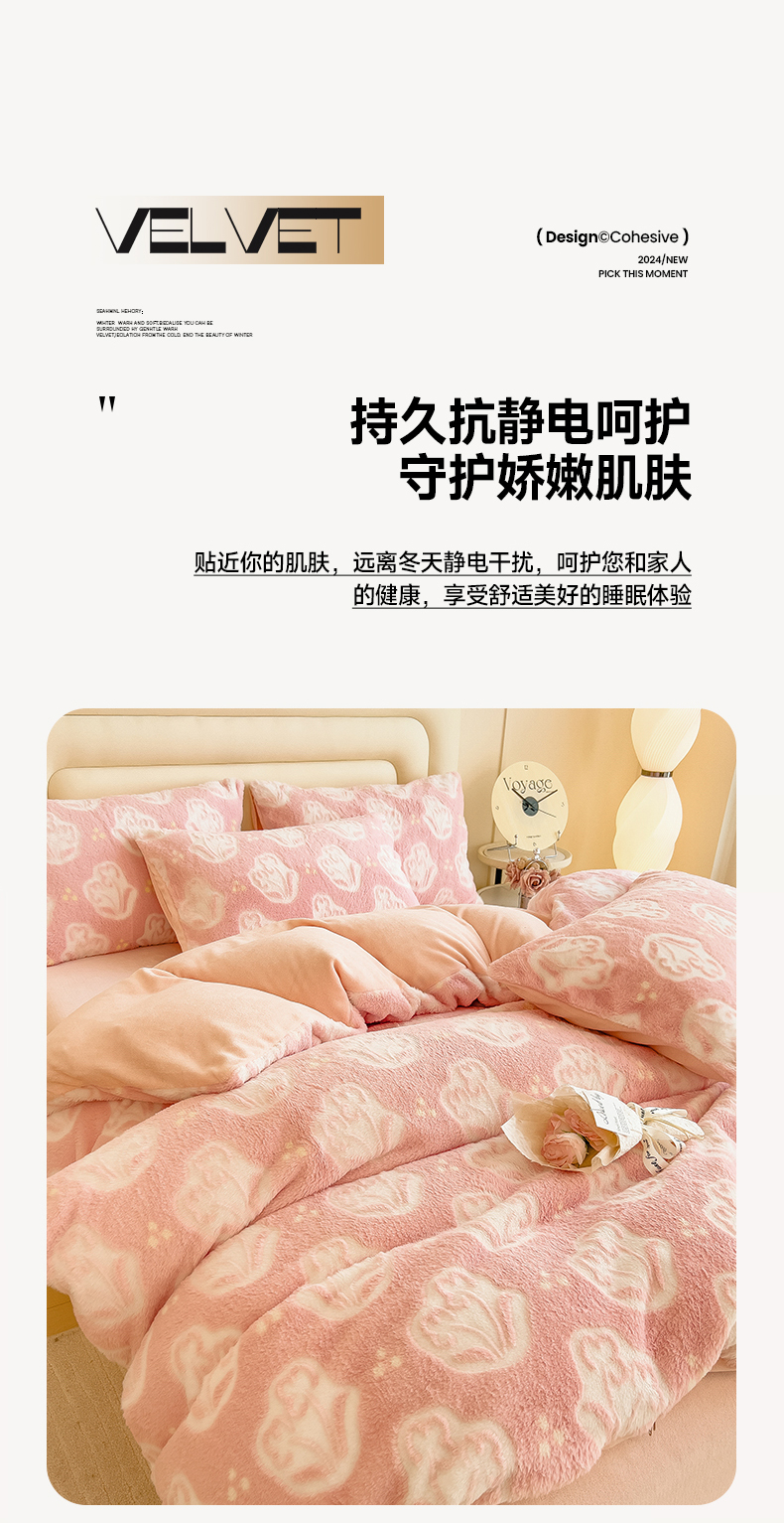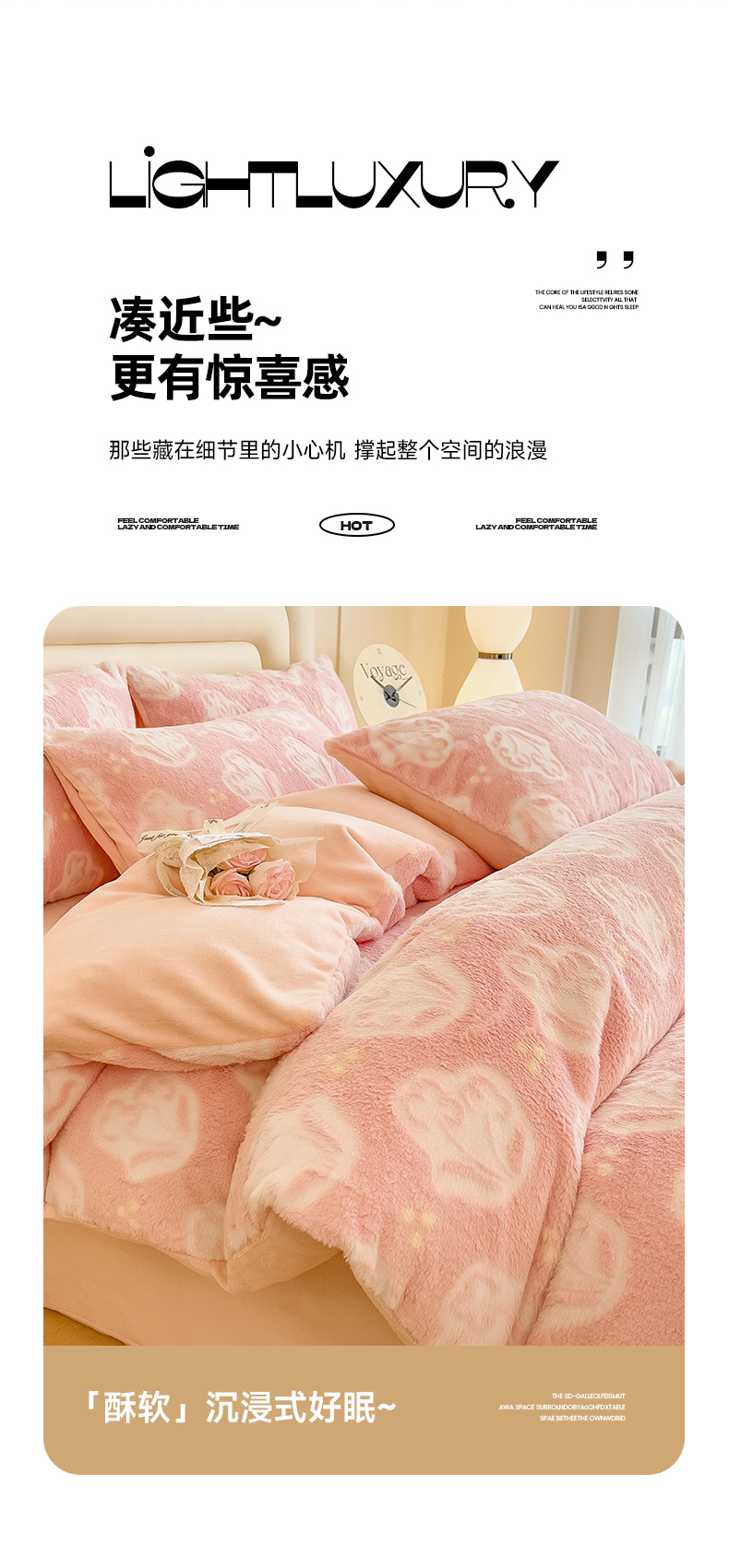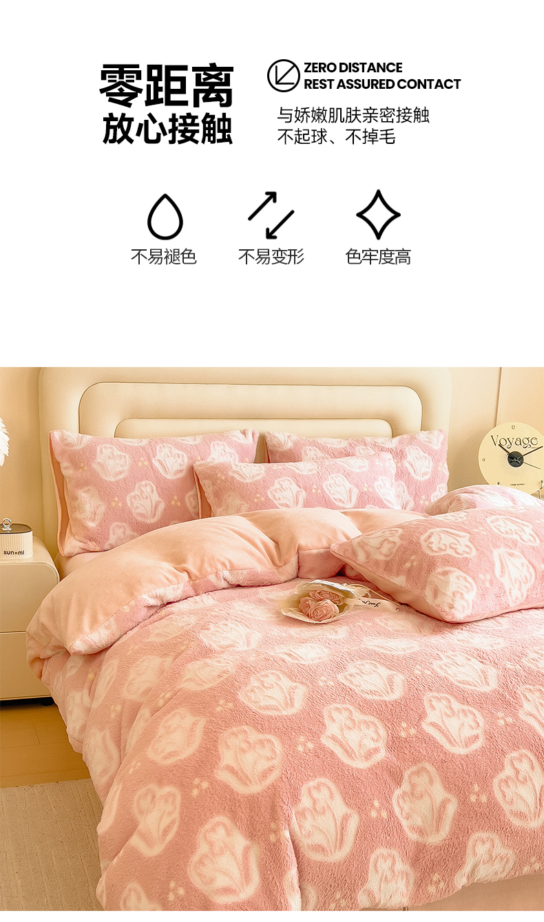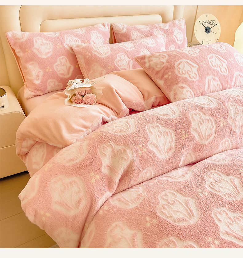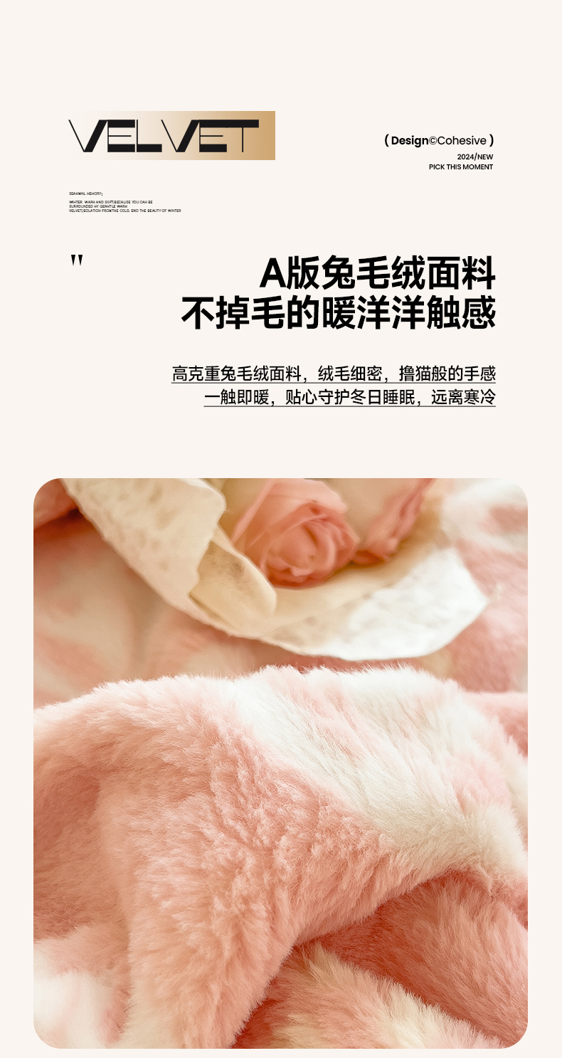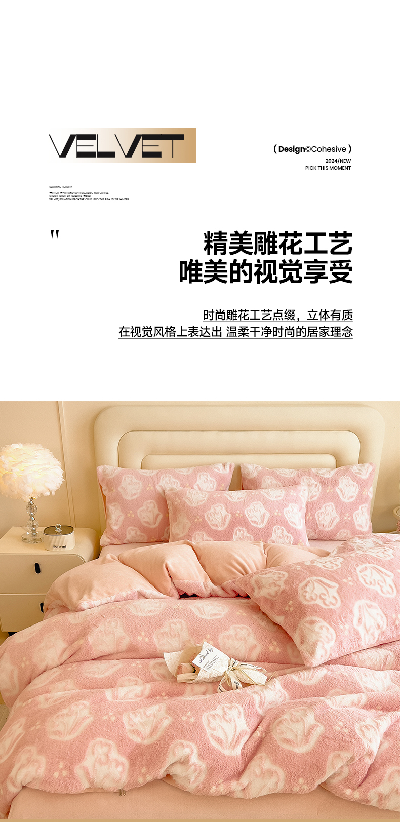 商品名称:摩妮卡 2025新款A类加厚兔毛雕花牛奶绒四件套 茶花-粉