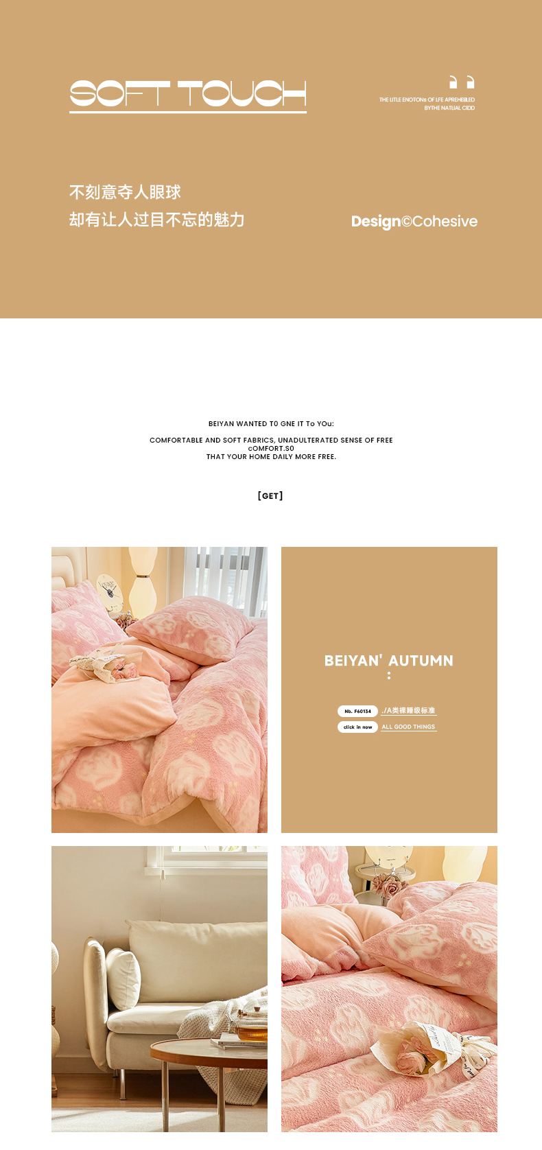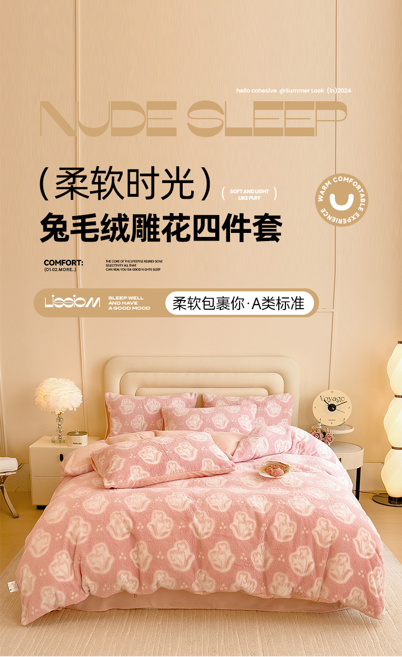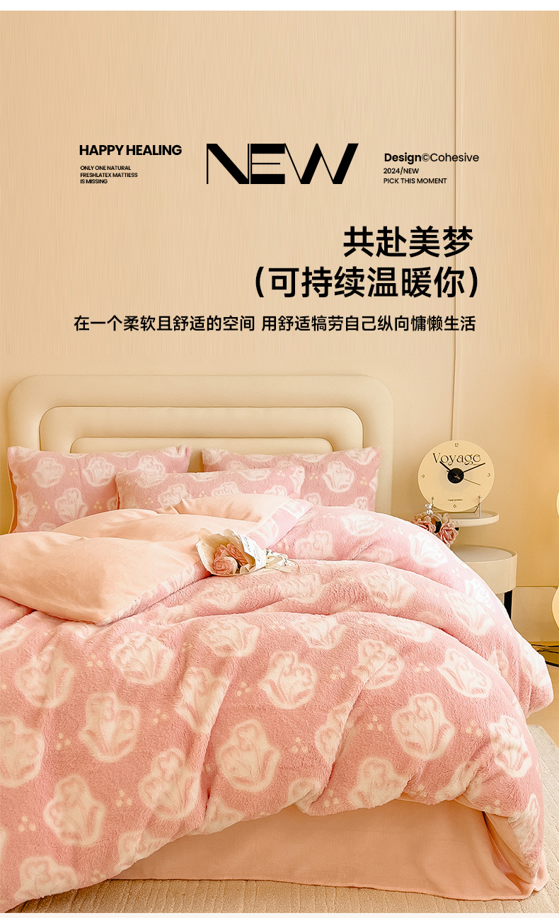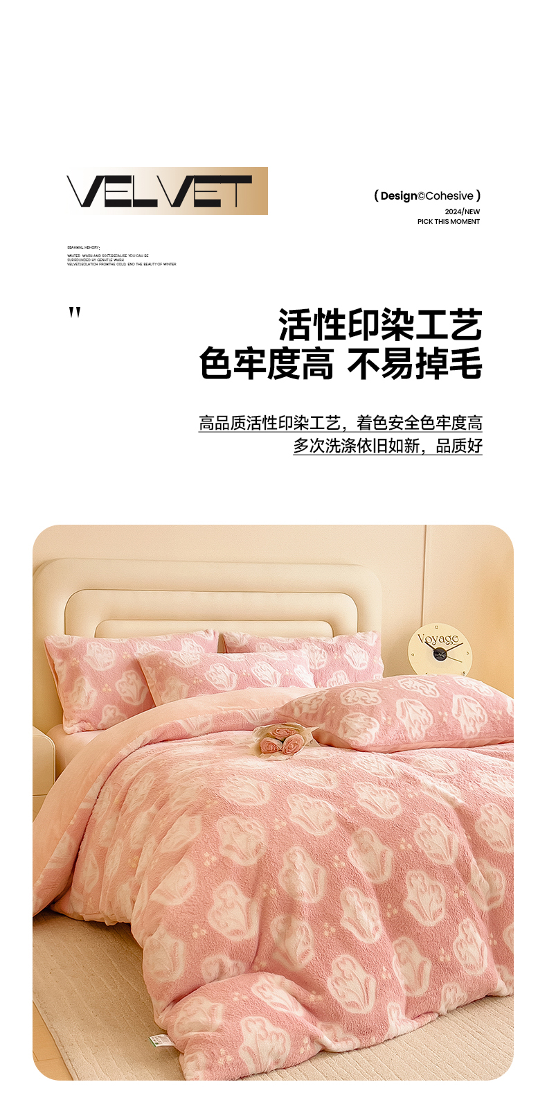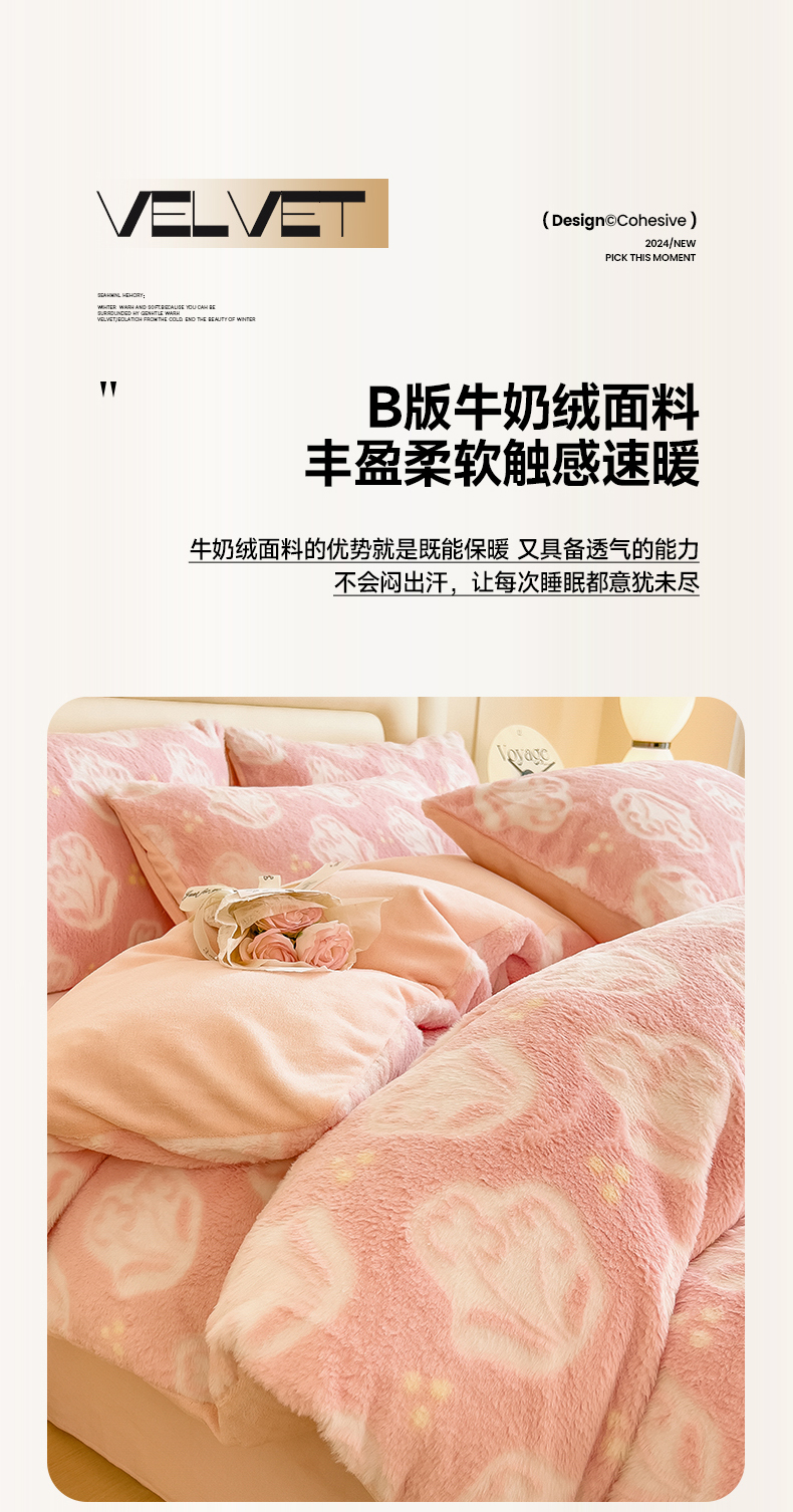商品名称:摩妮卡 2025新款A类加厚兔毛雕花牛奶绒四件套 茶花-粉