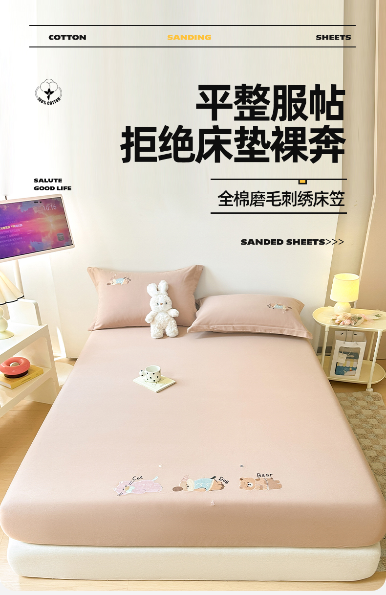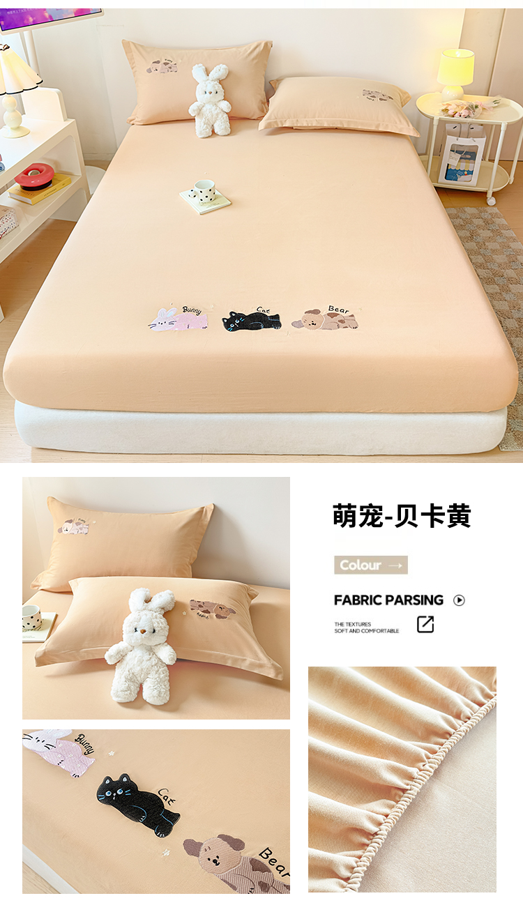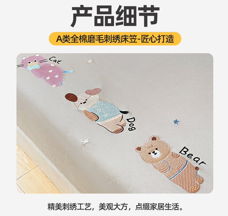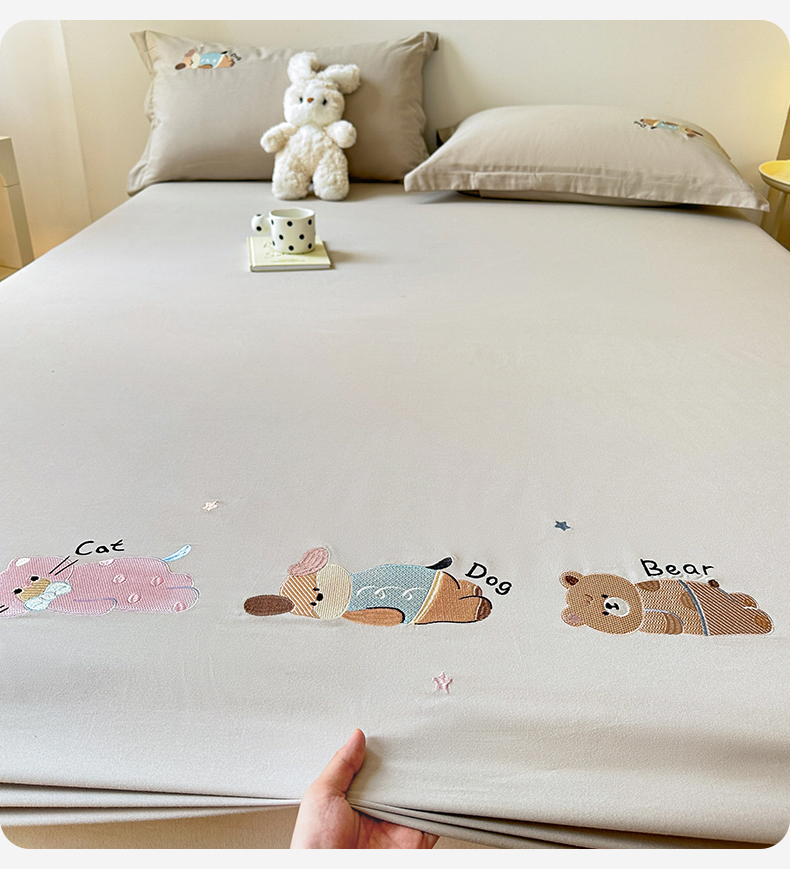 商品名称:笙意家纺 2025新款全棉纯棉磨毛刺绣单品床笠 床笠单件 萌宠-热带棕