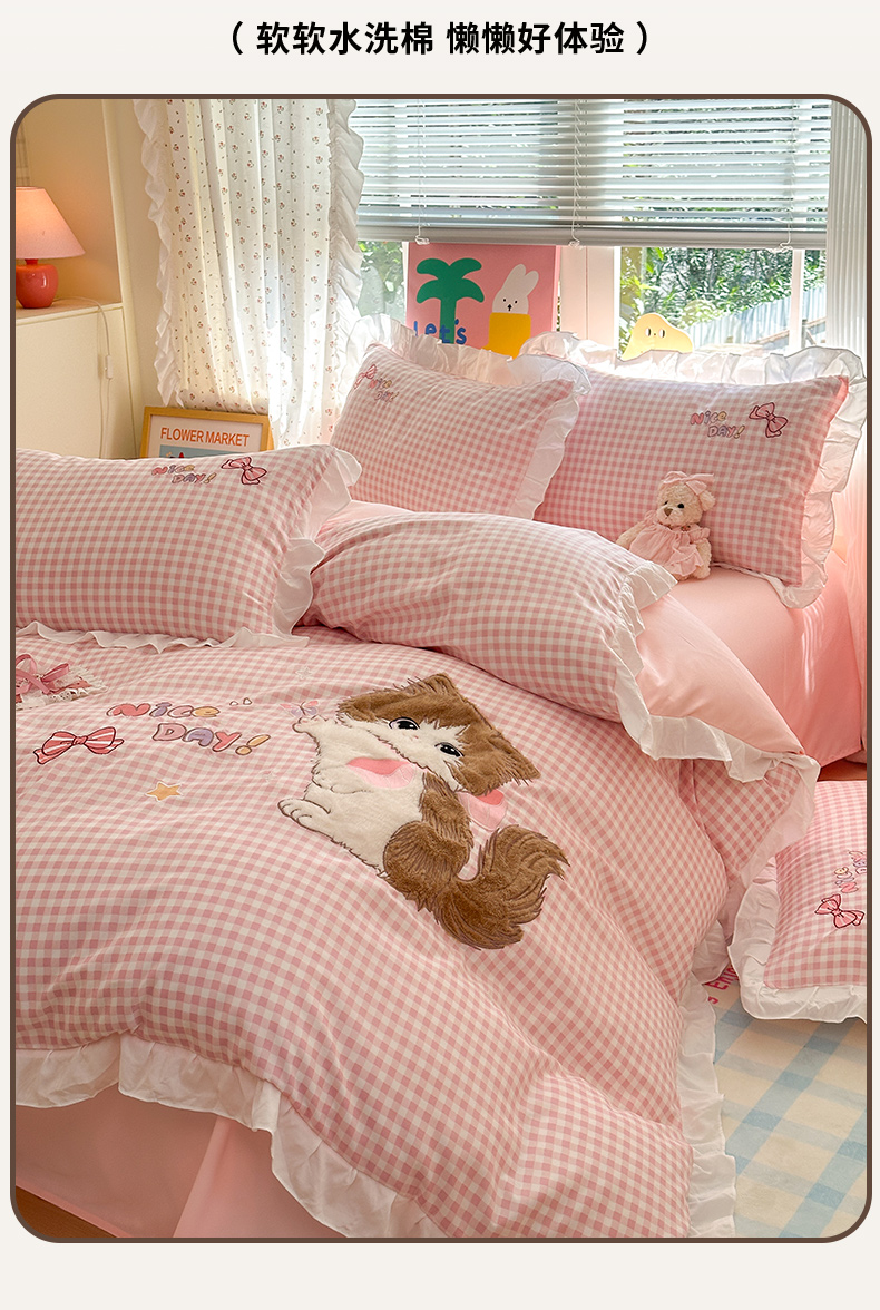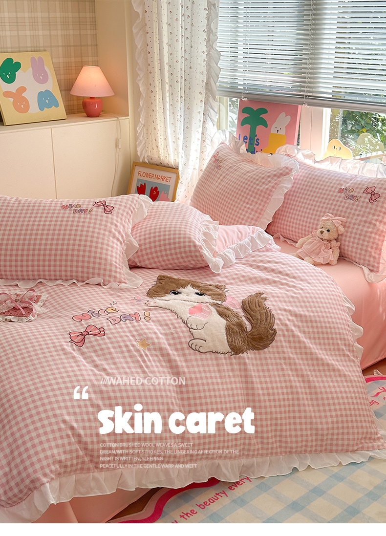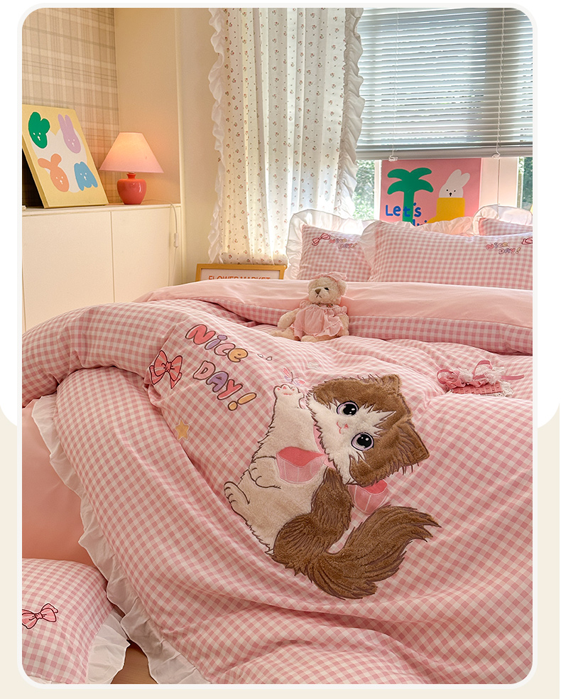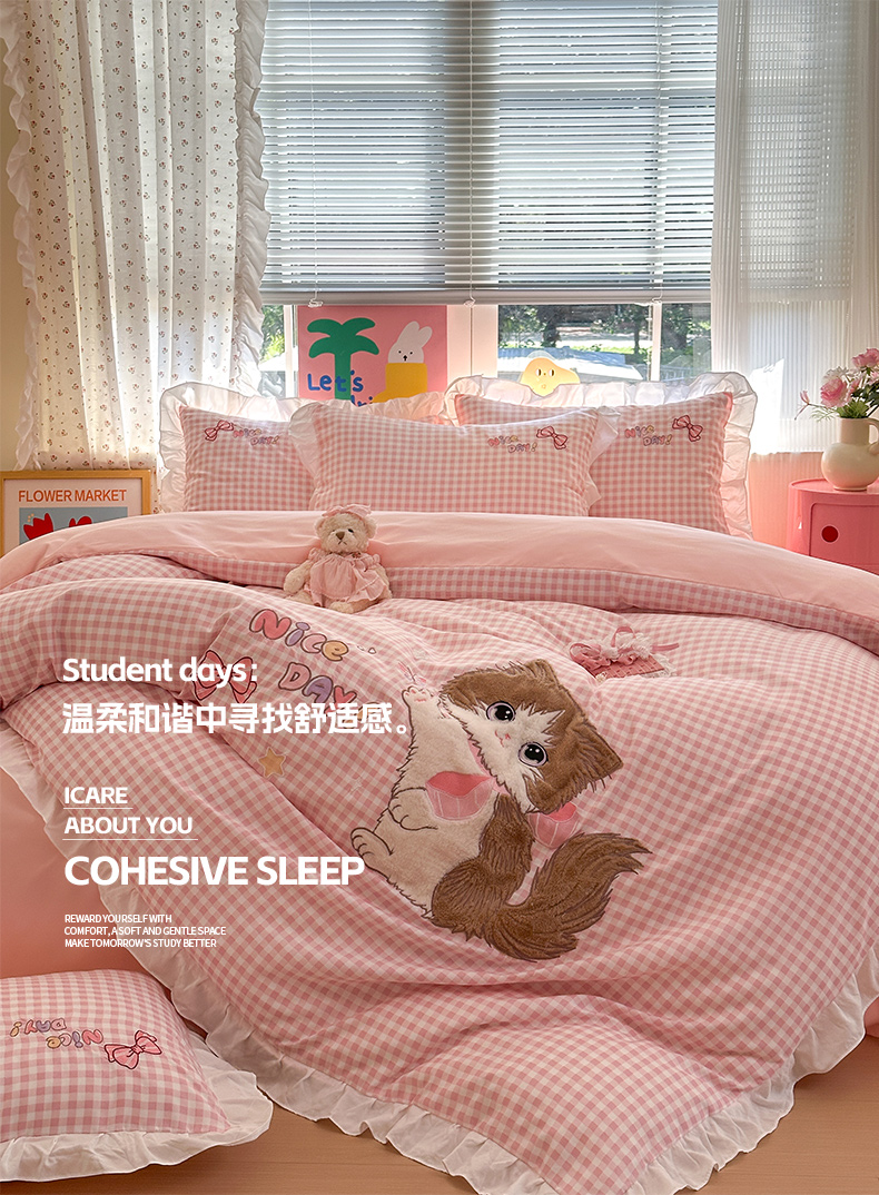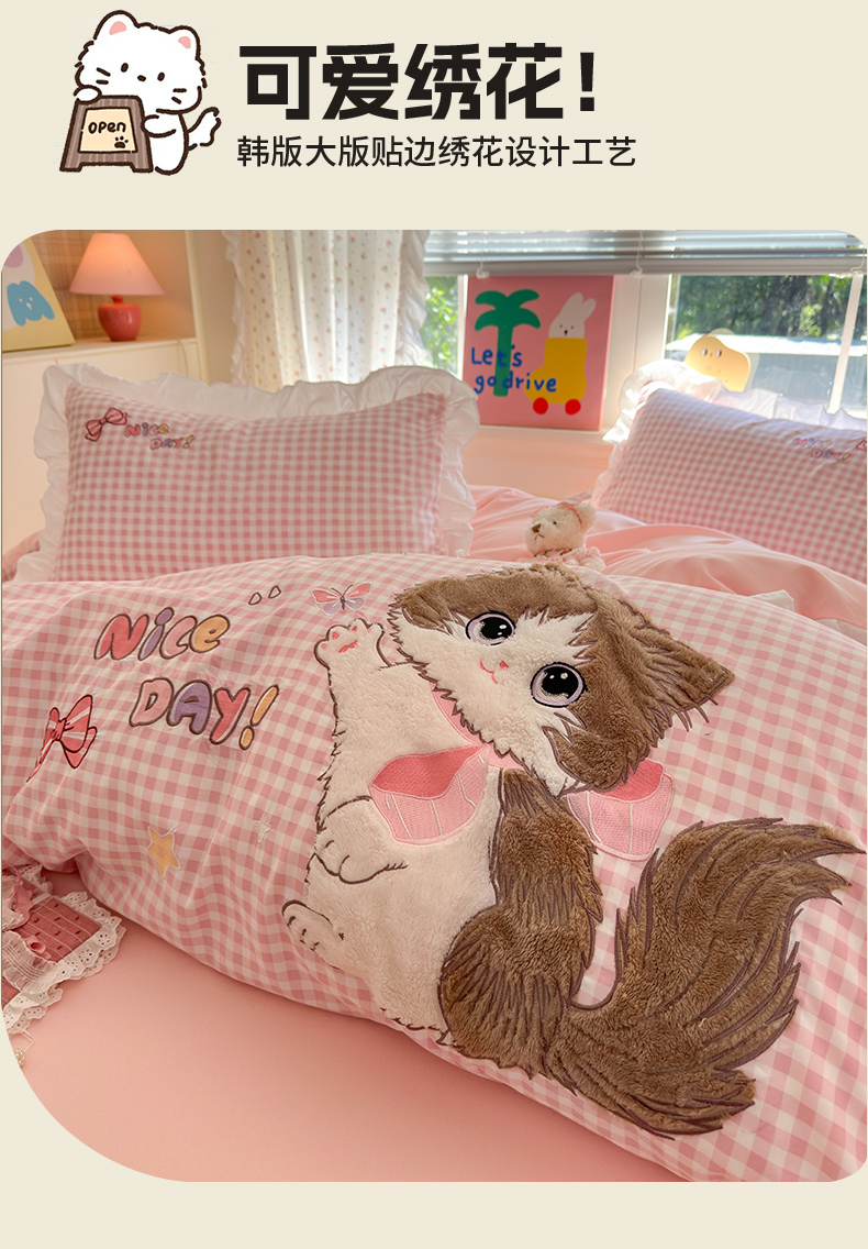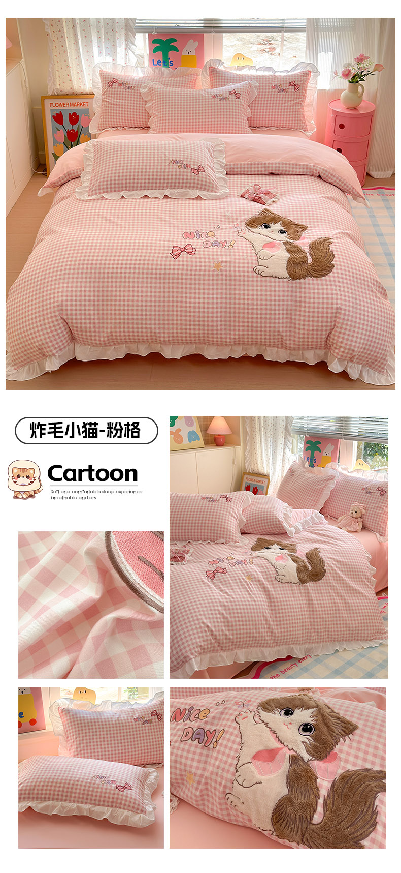 当前位置: 91家纺网 > 商品网购 > 床品套件 > 四件套 > 水洗棉四件套 > 易禾家纺 2025新款韩版卡通兔毛贴布绣水洗棉四件套学生宿舍三件套-炸毛小猫 炸毛小猫——粉格